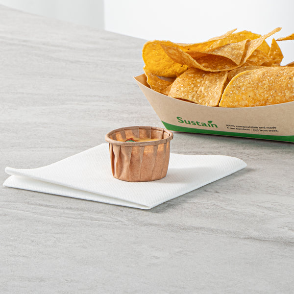 Elevate your foodservice with our Sustain 1.25-ounce Kraft Paper Portion Cups. These paper condiment cups are commercially compostable and biodegradable, providing a sustainable alternative to traditional plastic. Crafted from premium paper, these condiment cups are durable enough to hold ketchup, mustard, mayonnaise, honey, and more without any leaks. With a versatile design, these paper sauce cups are ideal for serving samples at events, tastings, and food promotions. The kraft finish of these ketchup cups adds a rustic charm to your food presentation, enhancing the visual appeal of your offerings. For effortless cleanup, these disposable sauce cups can be simply tossed after use. Measuring 1.69 inches in diameter by 1.18 inches in height, these paper ketchup cups have a capacity of 1.25 ounces. Sold in a 2,000 count box. These items will only degrade outside of the traditional solid waste stream.