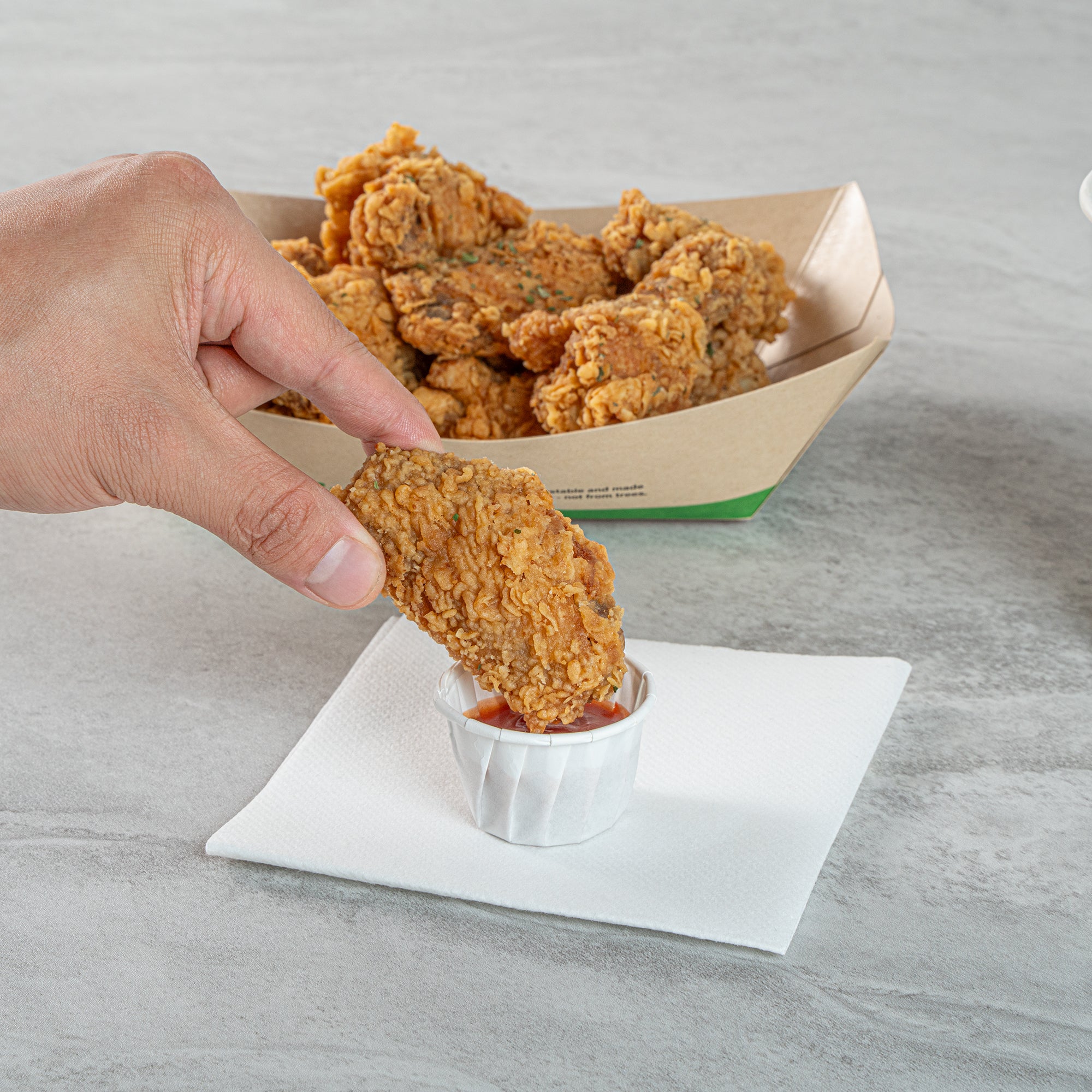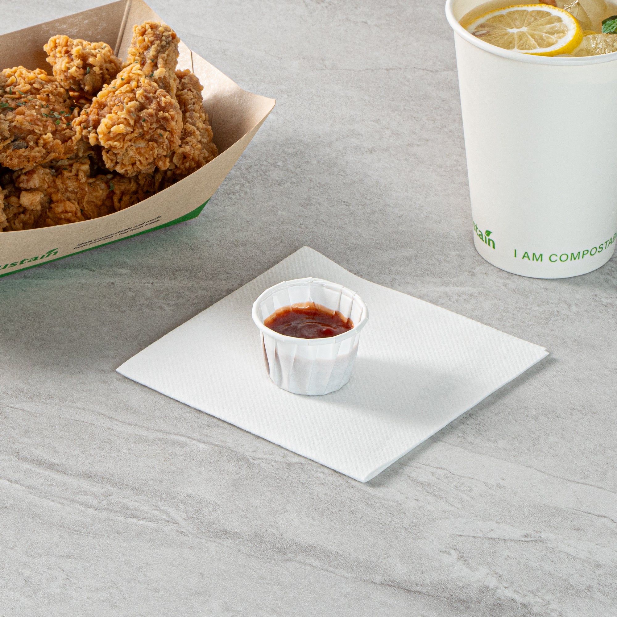 Elevate your foodservice with our Sustain 1.25-ounce White Paper Portion Cups. These paper condiment cups are commercially compostable and biodegradable, reducing your environmental footprint with every use. Made from premium paper, these durable ketchup cups can hold a variety of sauces including mustard, mayonnaise, and honey. These paper sauce cups are versatile and ideal for serving samples at events, tastings, and food promotions. The elegant white finish of these sauce cups enhances your food presentation, making your dishes stand out. Designed for hassle-free cleanup, these paper ketchup cups are disposable and can be easily tossed after use. These condiment cups measure 1.69 inches in diameter by 1.18 inches in height and have a capacity of 1.25 ounces. Sold in a 100 count box. These items will only degrade outside of the traditional solid waste stream.