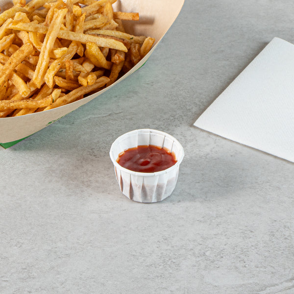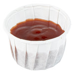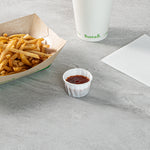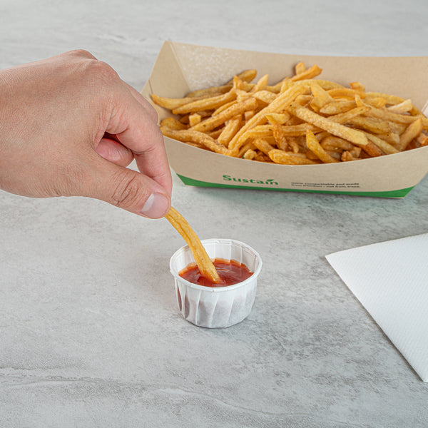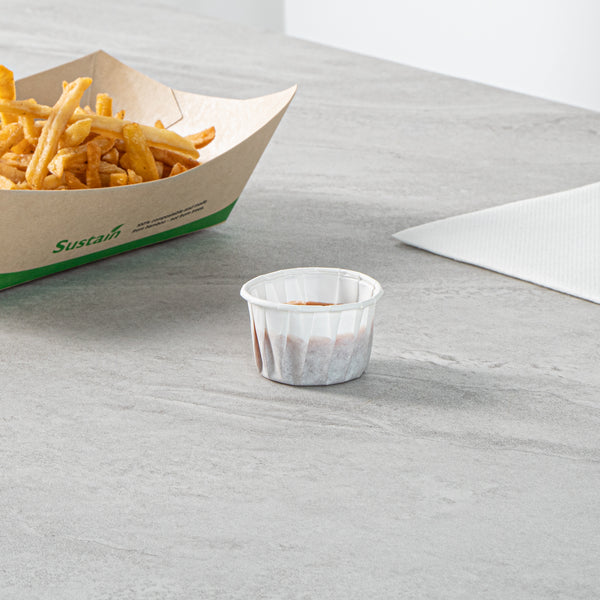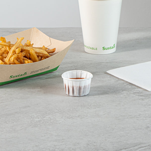 Enhance your foodservice efficiency and sustainability with our Sustain 1.5-ounce White Paper Portion Cups. These paper condiment cups are commercially compostable and biodegradable, offering an eco-friendly alternative to traditional plastic. Crafted from premium paper, these durable condiment cups are perfect for holding thick barbecue sauce, chunky salsa, and more. These paper sauce cups are versatile and ideal for serving samples at events, tastings, and food promotions. The white finish of these paper ketchup cups complements your food presentation, ensuring a clean and professional look. For straightforward cleanup, these ketchup cups can be easily tossed after use. Measuring 1.97 inches in diameter by 1.22 inches in height, these sauce cups have a total capacity of 1.5 ounces. Sold in a 2,000 count box. These items will only degrade outside of the traditional solid waste stream.