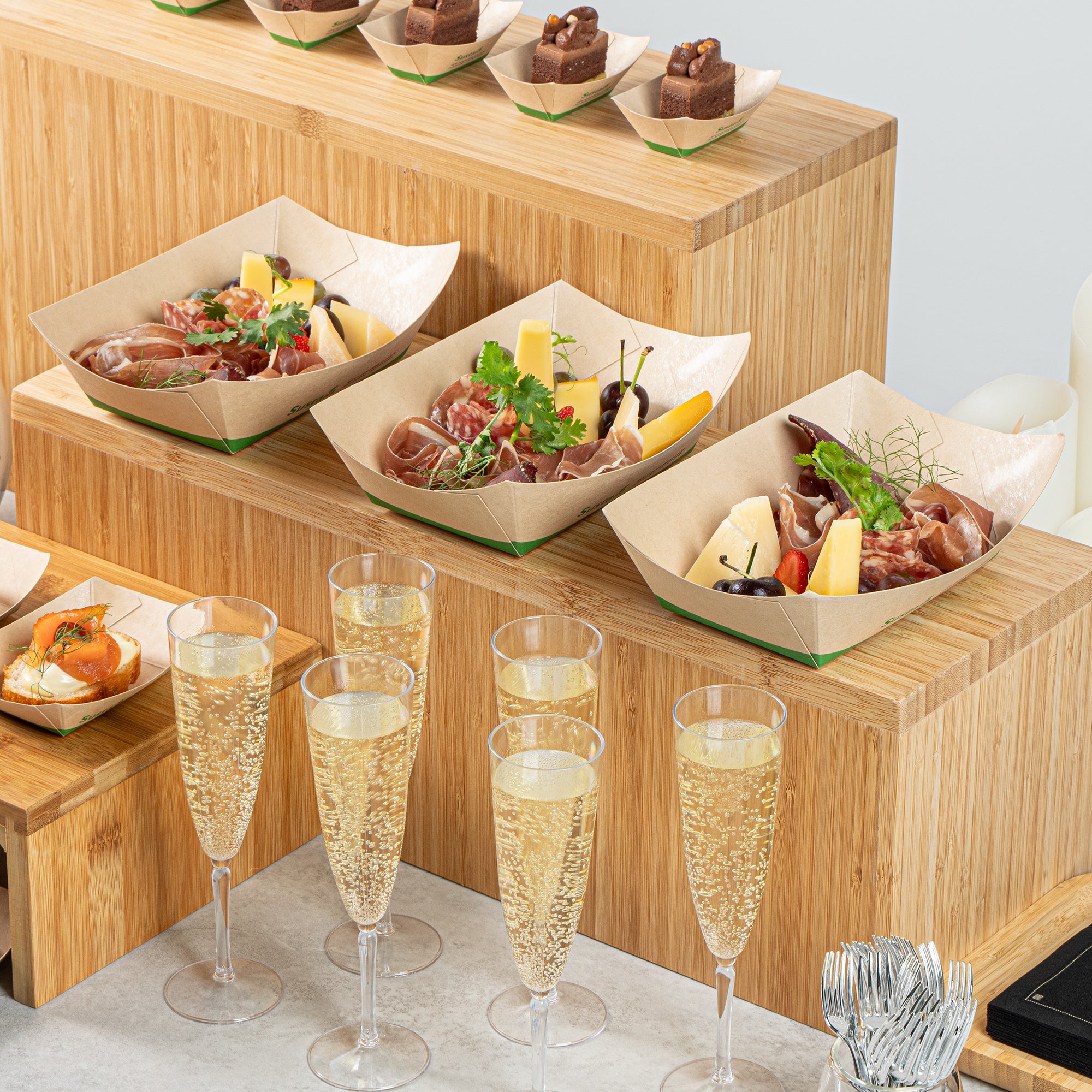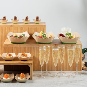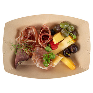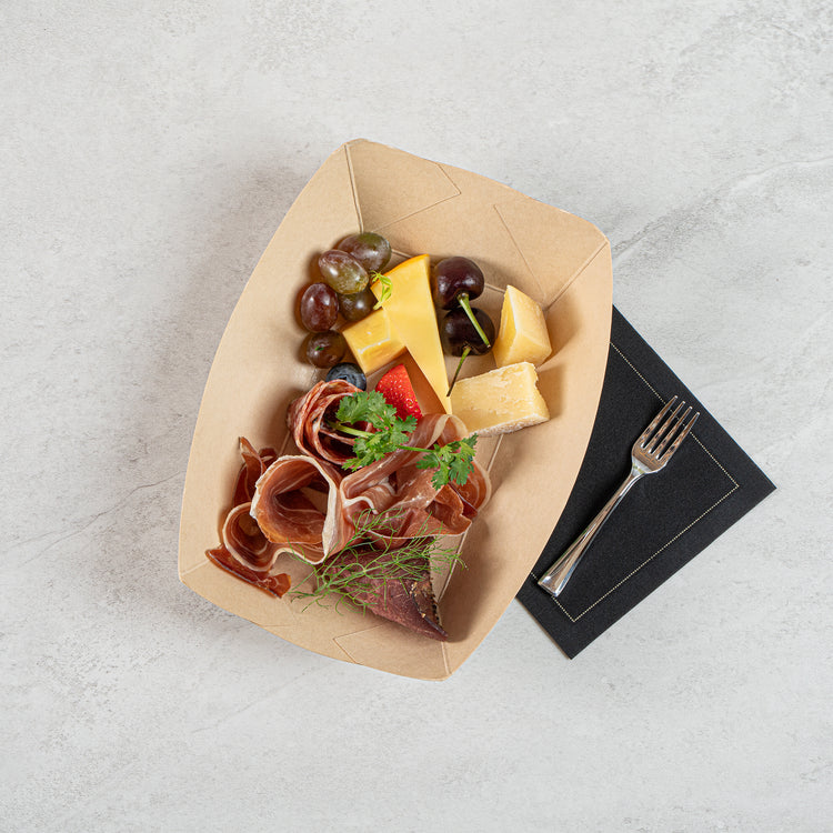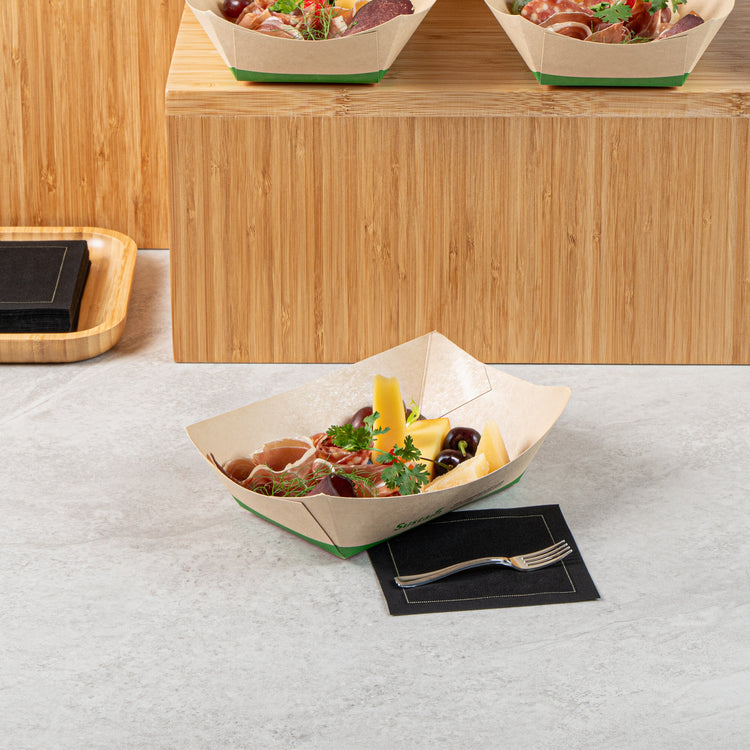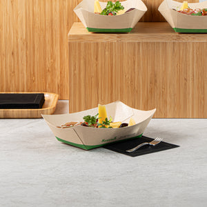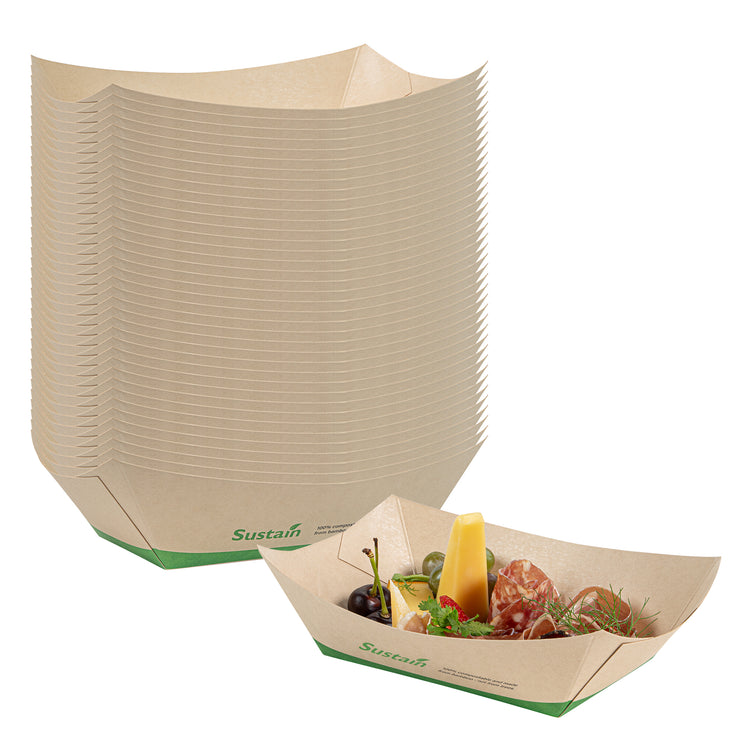 Avoid messy spills with our eco-friendly service solutions. The Sustain Leak-Resistant Bamboo Paper Food Tray features a reliable PLA lining that prevents unwanted leaks, ensuring your delicious meals remain mess-free and appetizing. Made from durable paper, this bamboo paper food tray maintains its shape and stability, allowing you to present and transport your culinary creations confidently without any folding or bending. Its sustainable construction is commercially compostable, facilitating easy and eco-friendly disposal, which is perfect for foodservice operations prioritizing sustainability. Measuring 5.4 inches in length by 3.4 inches in width and 2.1 inches in height, this compostable food boat is ideal for serving a variety of dishes, from appetizers to desserts. Elevate your catering or takeout presentations with this disposable food tray, knowing you're making a positive impact on the environment. Each order includes 50 Sustain Leak-Resistant Bamboo Paper Food Trays.