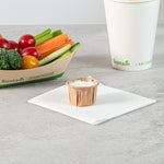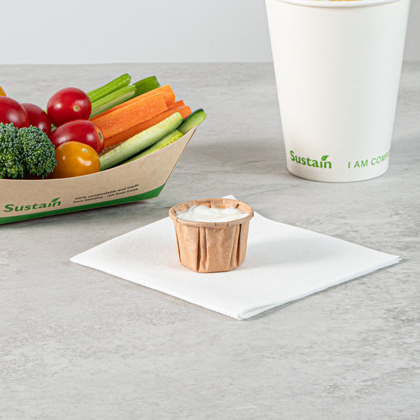 Elevate your food presentation with our Sustain 1-ounce Kraft Paper Portion Cups. These paper condiment cups are commercially compostable and biodegradable, offering a sustainable alternative to traditional plastic. Made from premium paper, these condiment cups are durable and perfect for holding ketchup, mustard, mayonnaise, honey, and more. Ideal for sampling, these versatile paper ketchup cups make an excellent choice for events, tastings, and food promotions. Featuring a stylish kraft finish, these ketchup cups enhance the appearance of your food items. These disposable sauce cups can be easily tossed after use and provide an easy cleaning experience. Each paper sauce cup measures 1.57 inches in diameter by 1.06 inches in heightand has a capacity of 1 ounce. Sold in a 2,000 count box. These items will only degrade outside of the traditional solid waste stream.