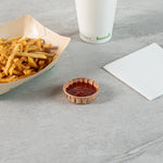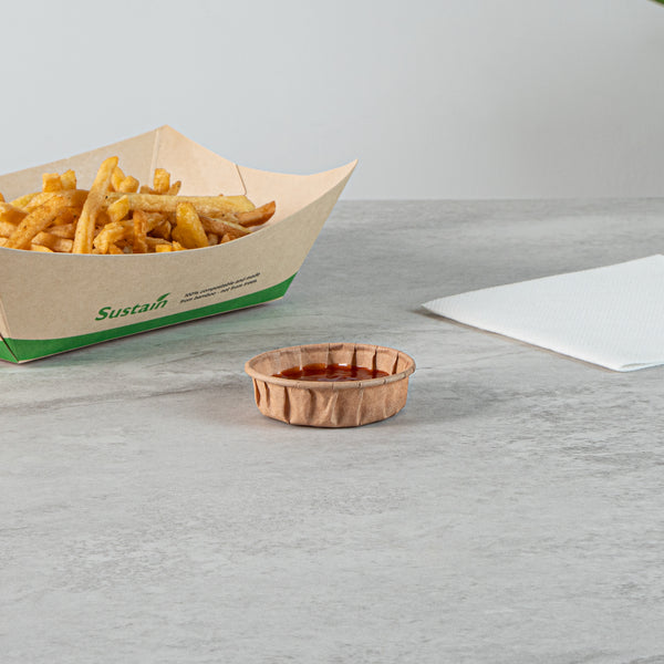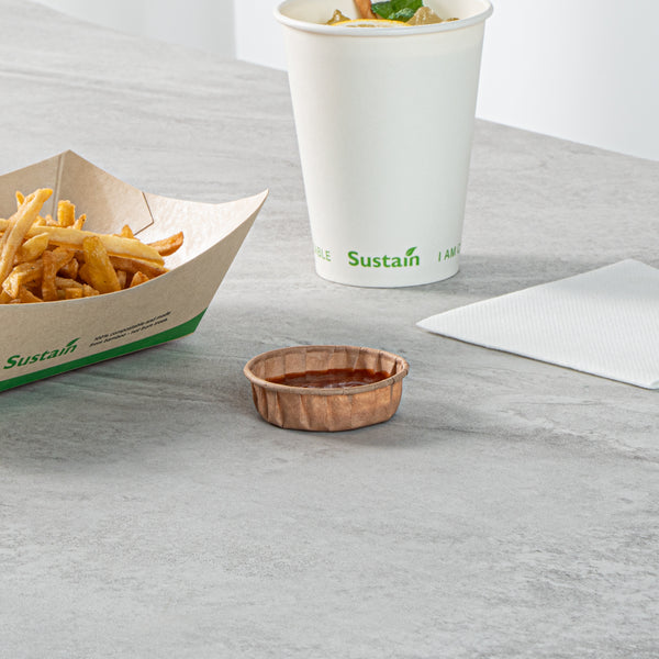 Enjoy a sustainable choice with our Sustain 1-ounce Kraft Paper Squat Portion Cups. These paper condiment cups are commercially compostable and biodegradable, offering an eco-friendly alternative to traditional plastic. Crafted from premium paper, these durable ketchup cups are ideal for holding various condiments like ketchup, mustard, mayonnaise, and honey. Perfect for serving samples, these versatile paper ketchup cups are excellent for events, tastings, and food promotions. The kraft finish of these sauce cups complements any food presentation, enhancing your dishes' appeal. For straightforward cleanup, these condiment cups are disposable and can be easily tossed after use. With a capacity of 1 ounce and measuring 2.48 inches in diameter by 0.75 inches in height, these paper sauce cups provide ample space for condiments. Sold in a 2,000 count box. These items will only degrade outside of the traditional solid waste stream.