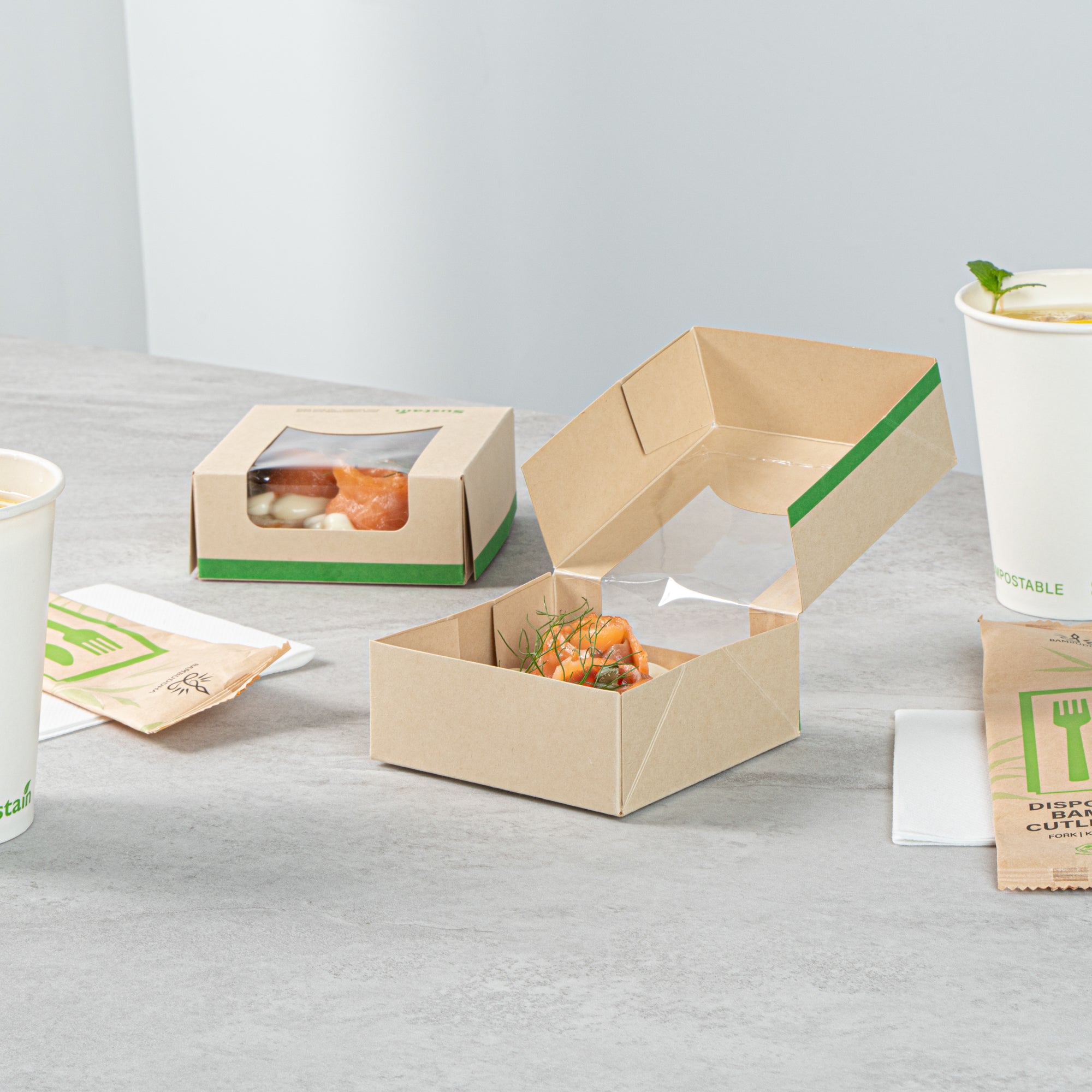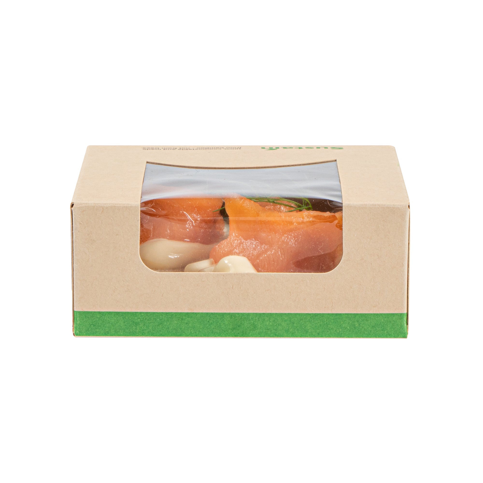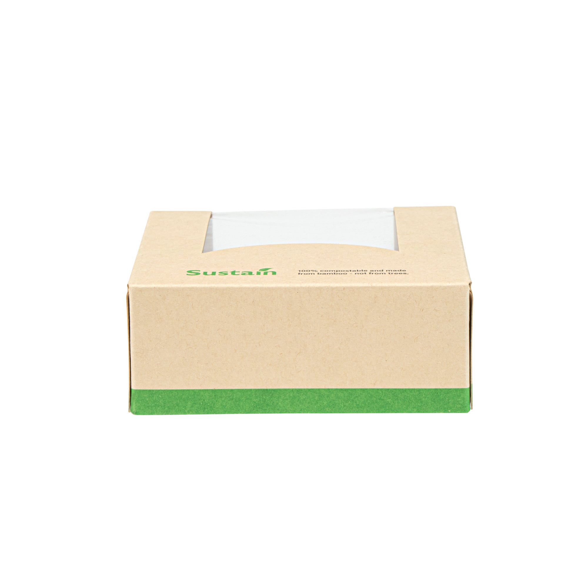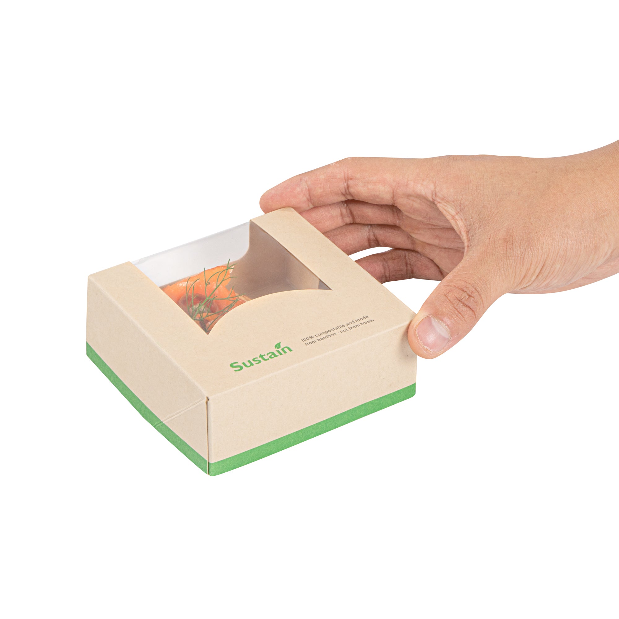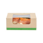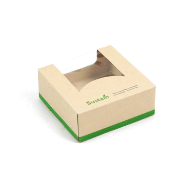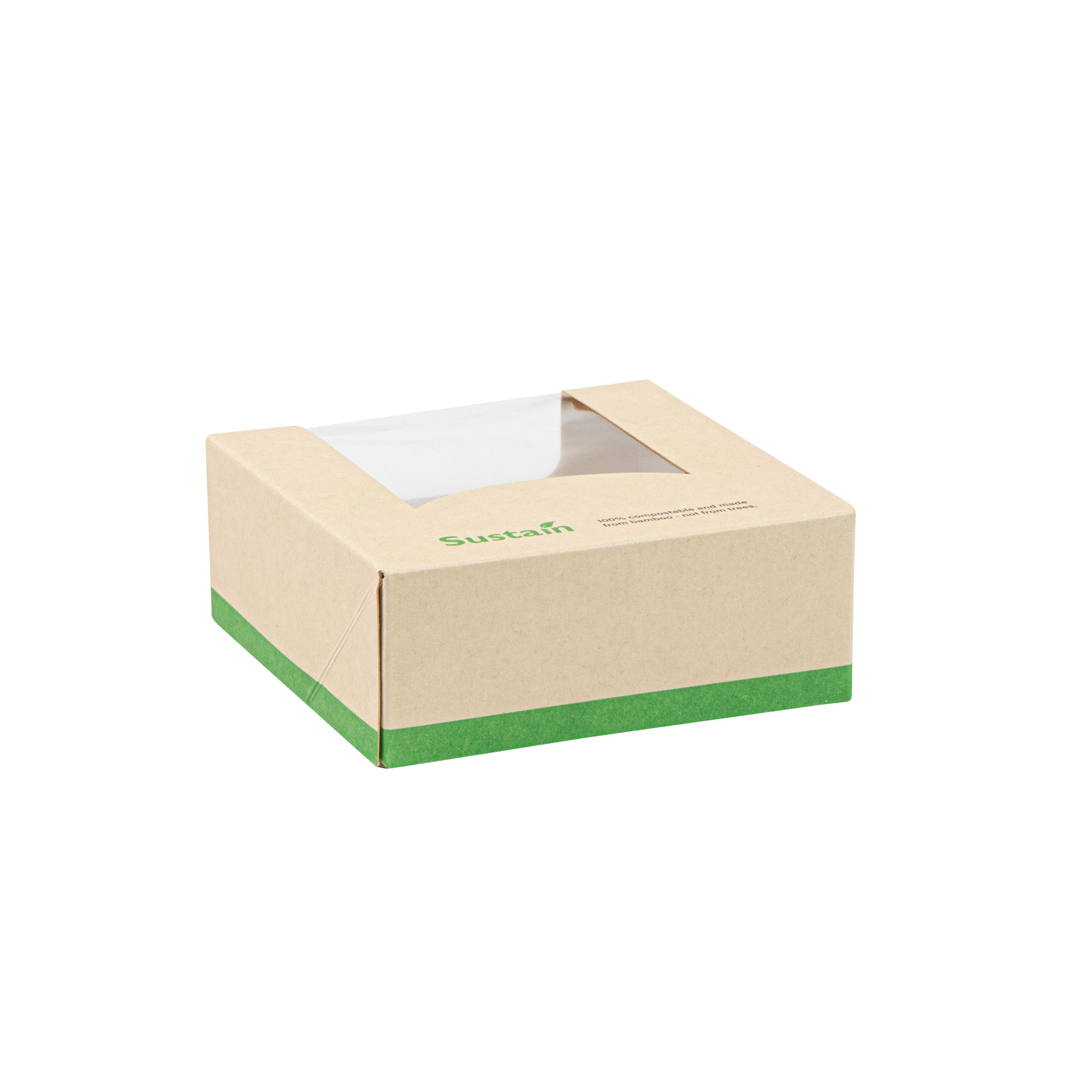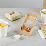 Ensure eco-friendly takeout with our greaseproof containers. Sustain Compostable Square Take Out Containers feature a PLA lining that ensures sustainable, commercially compostable disposal, helping your business reduce its environmental footprint with compostable food containers. The clear PLA window offers easy content visibility, allowing customers to view their meals at a glance while enhancing presentation. These square take out containers are designed with a tab-lock feature, simplifying packing and access to speed up service during busy hours. Measuring 3.9 inches by 3.9 inches by 1.6 inches, these kraft-colored, paper containers provide ample space and a stylish look for your dishes. Ideal for restaurants and cafes looking for biodegradable options, these disposable takeout boxes combine practicality and sustainability. Transition to eco-friendly packaging today with these versatile containers. Sold in a 200 count box.