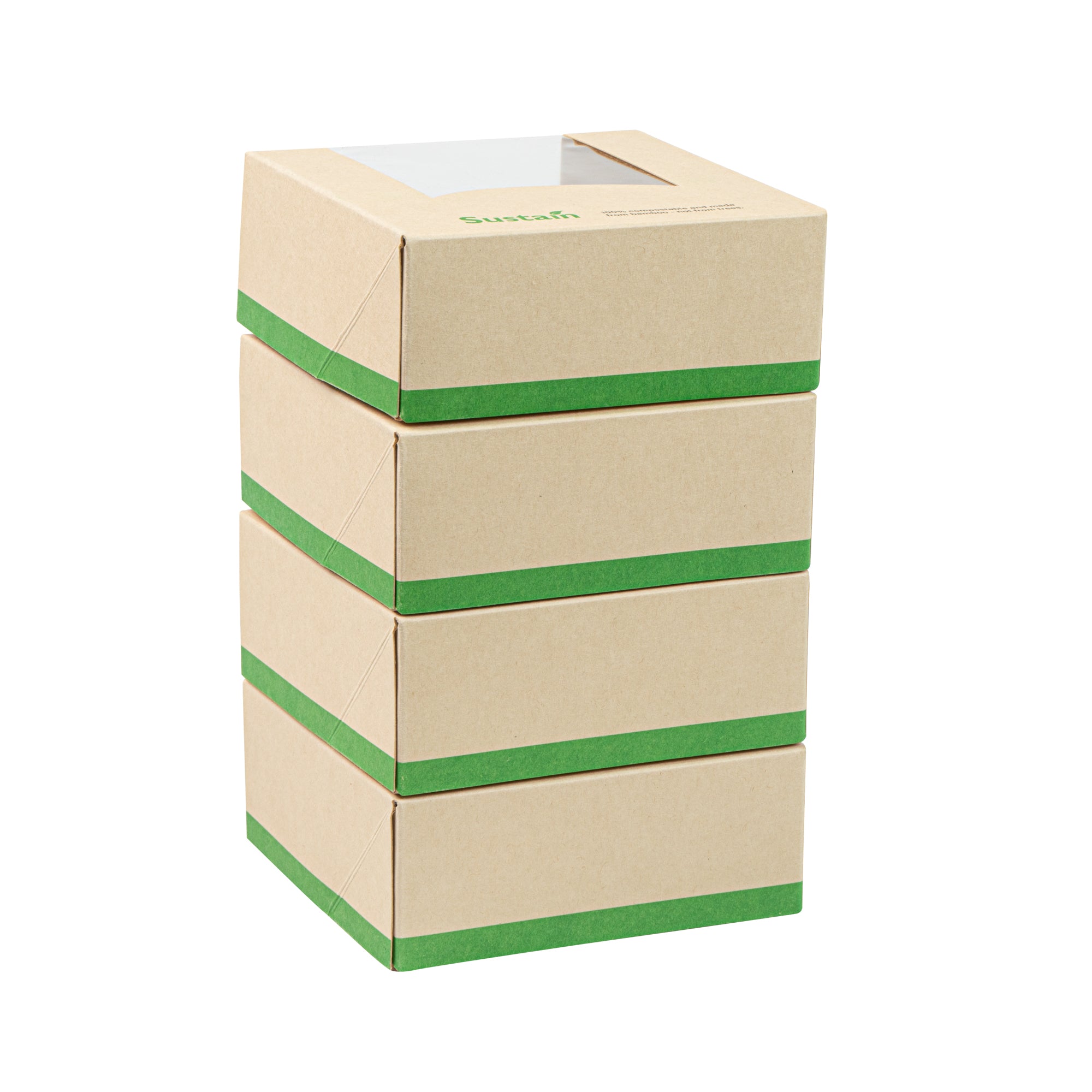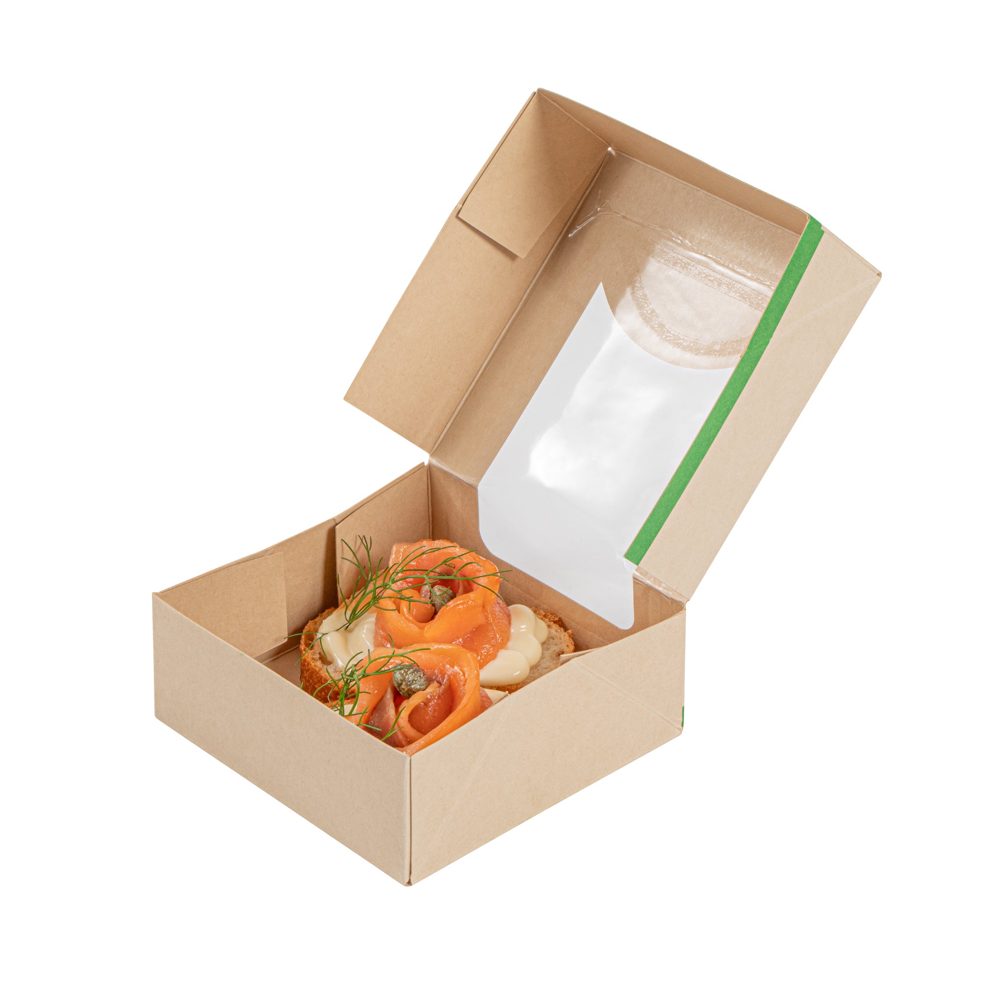 - Clear PLA windows improve visibility of packaged goods