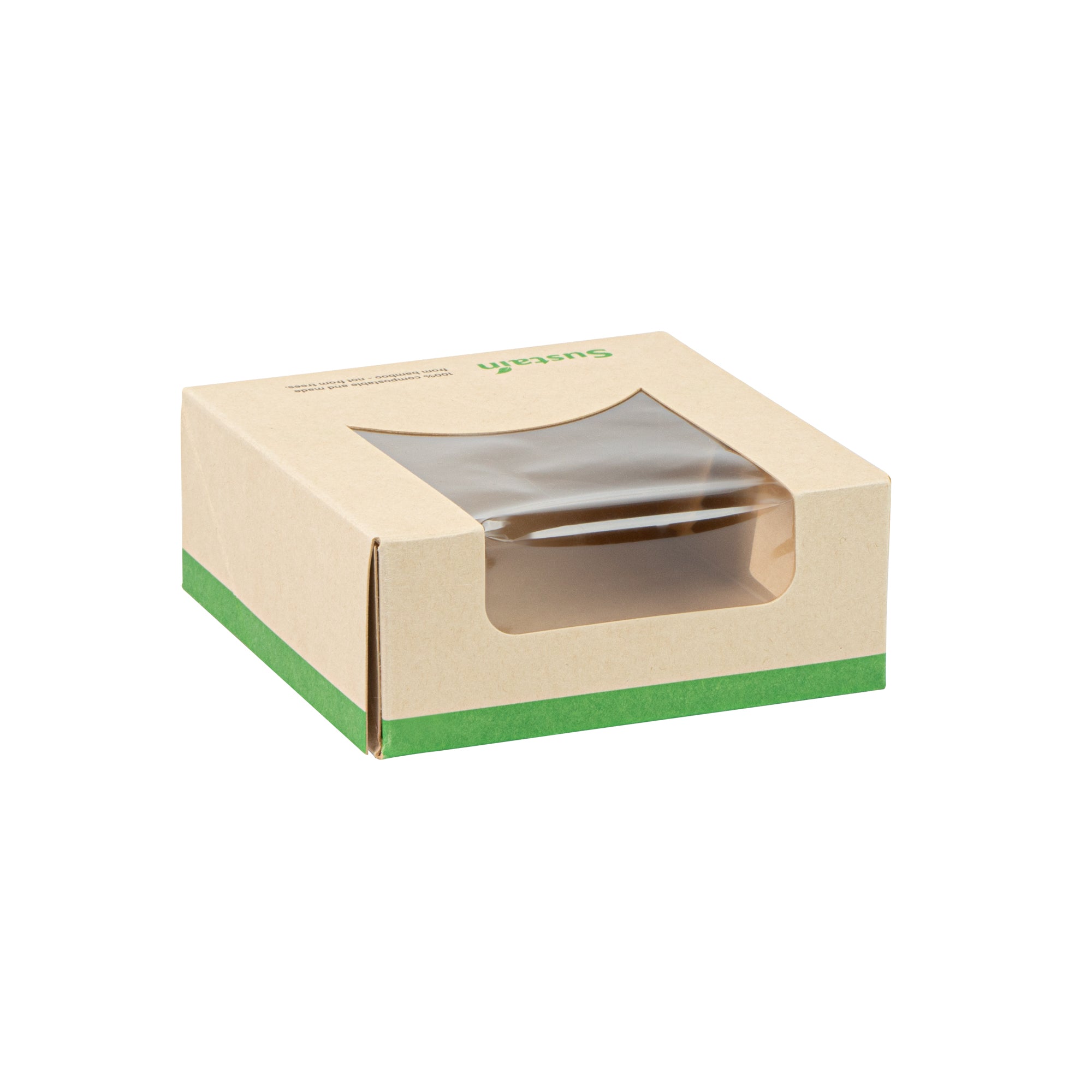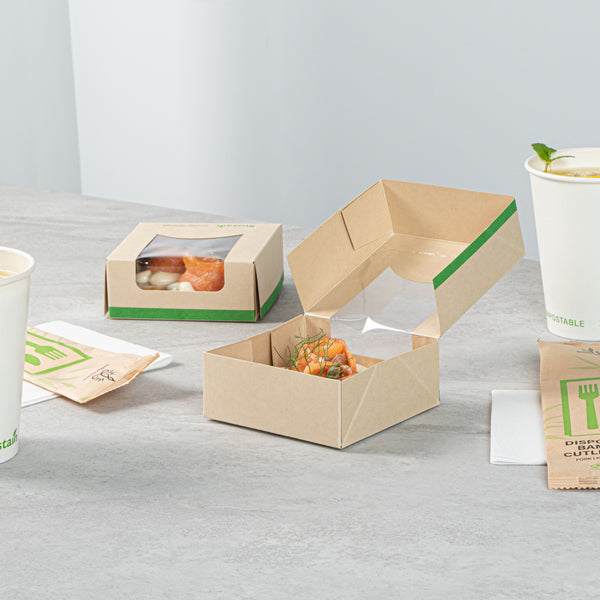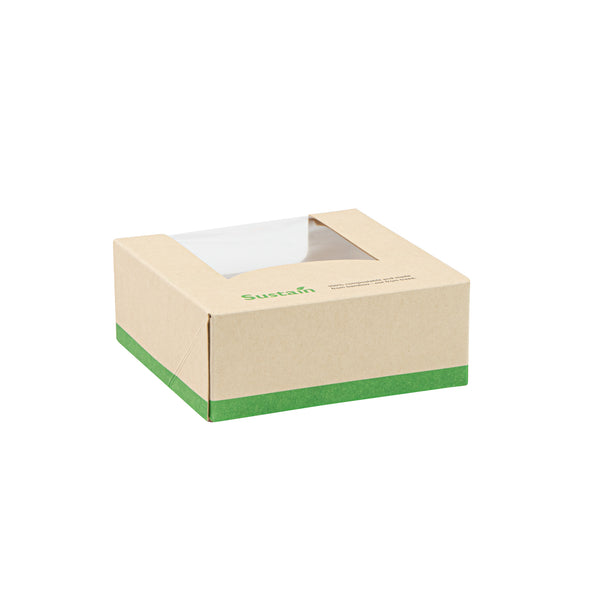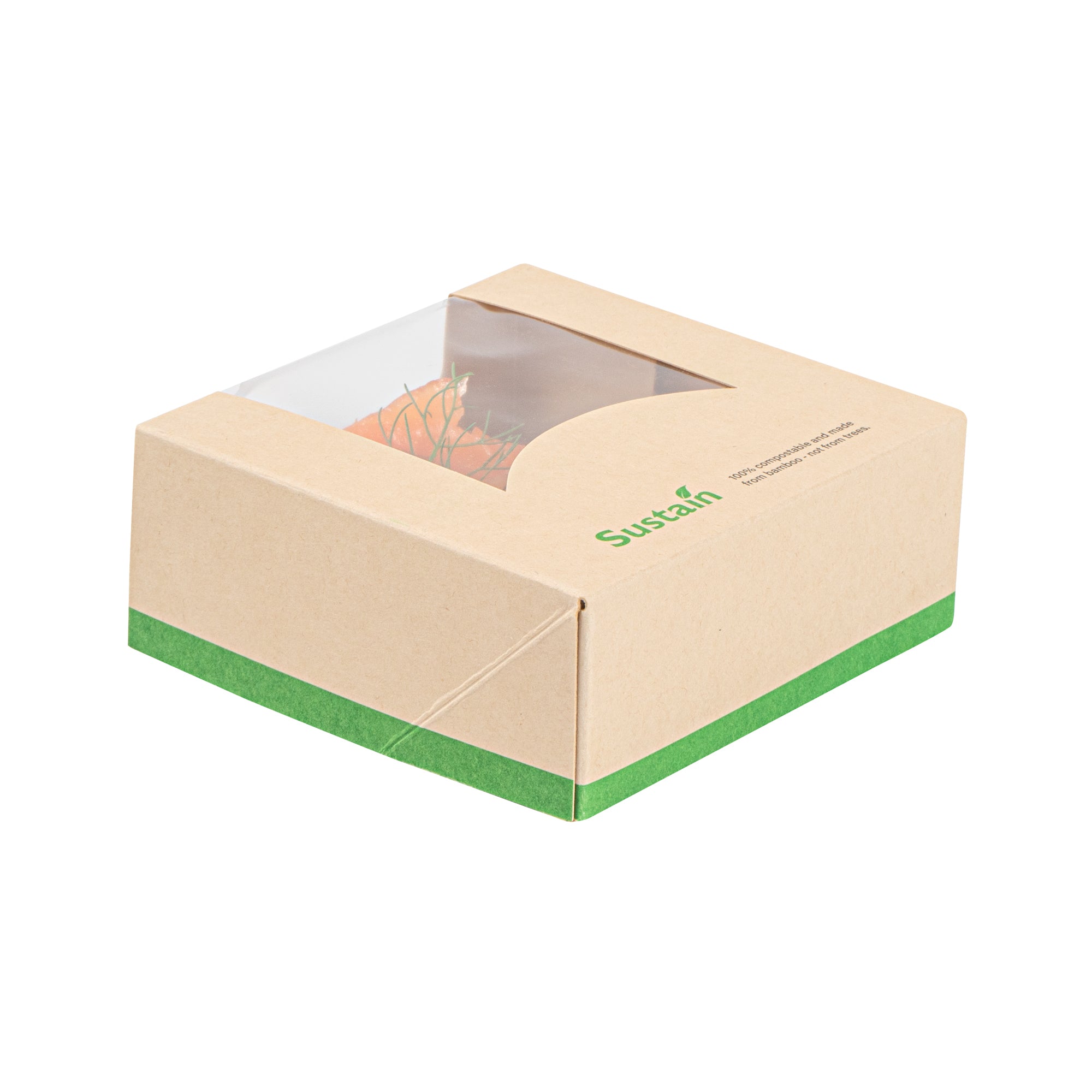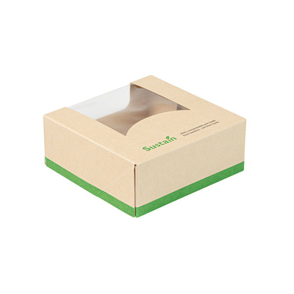 Enhance your eco-friendly packaging with sturdy, sustainable solutions. The Sustain Compostable Clear Window Tab-Lock Takeout Box provides a leak-resistant barrier with its PLA lining, ensuring secure transport and reducing environmental impact—ideal for compostable takeout box needs. Showcasing your culinary creations is effortless with the clear PLA window, offering customers a tempting view of your delectable offerings. The tab-lock design facilitates quick packing and secure closure, optimizing operations for bakeries, restaurants, and catering services. Crafted from compostable bamboo paper, this kraft food container supports green initiatives while its compact size of 3.9 inches by 3.9 inches by 1.6 inches efficiently holds small portions or desserts. This freezer-safe food container is perfect for maintaining food integrity when storing cold dishes. Elevate your takeout service with sustainable and reliable packaging. Each order includes 50 Sustain Compostable Clear Window Tab-Lock Takeout Boxes.