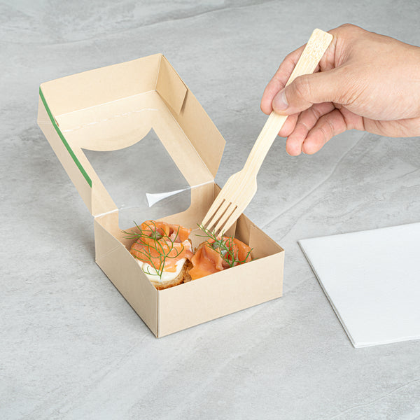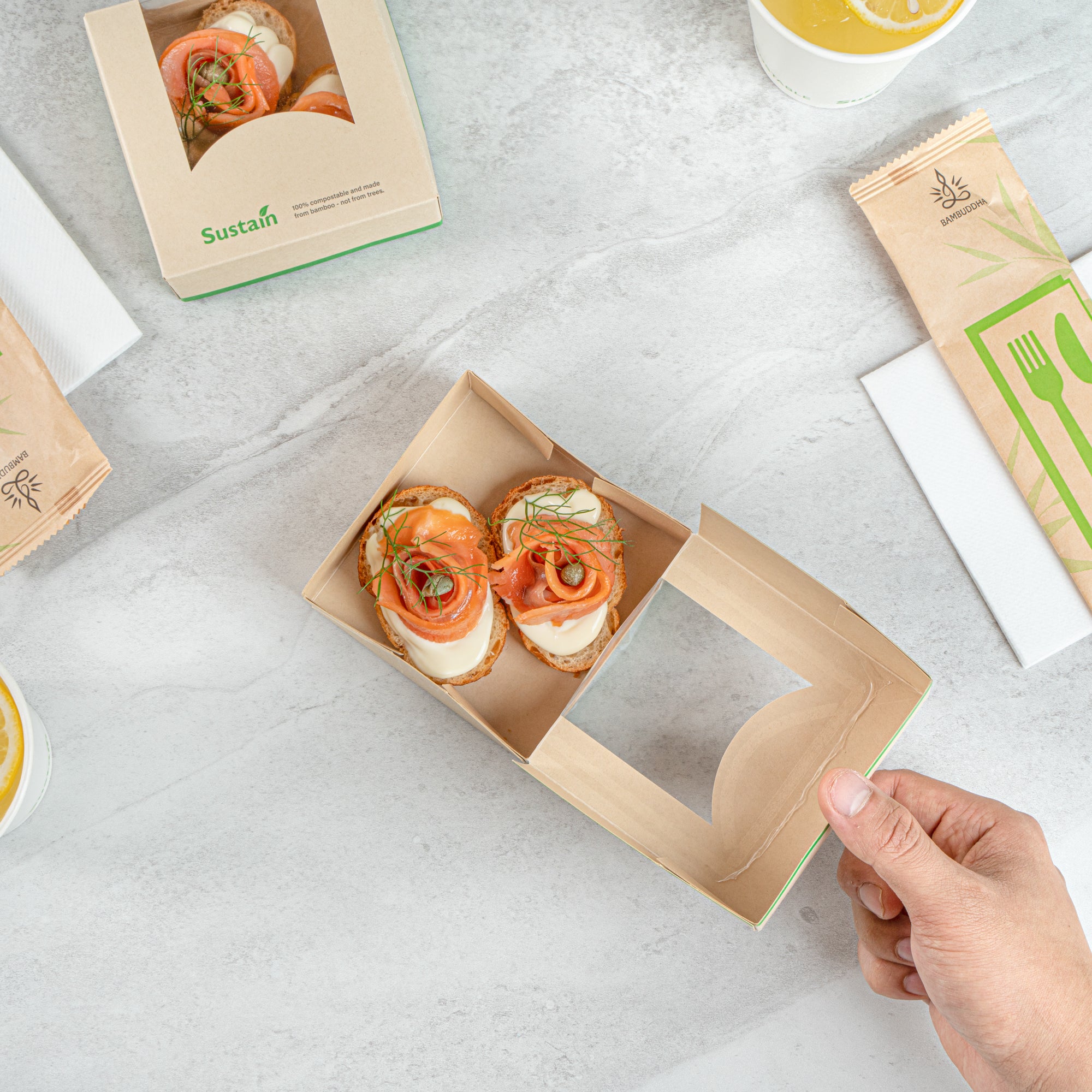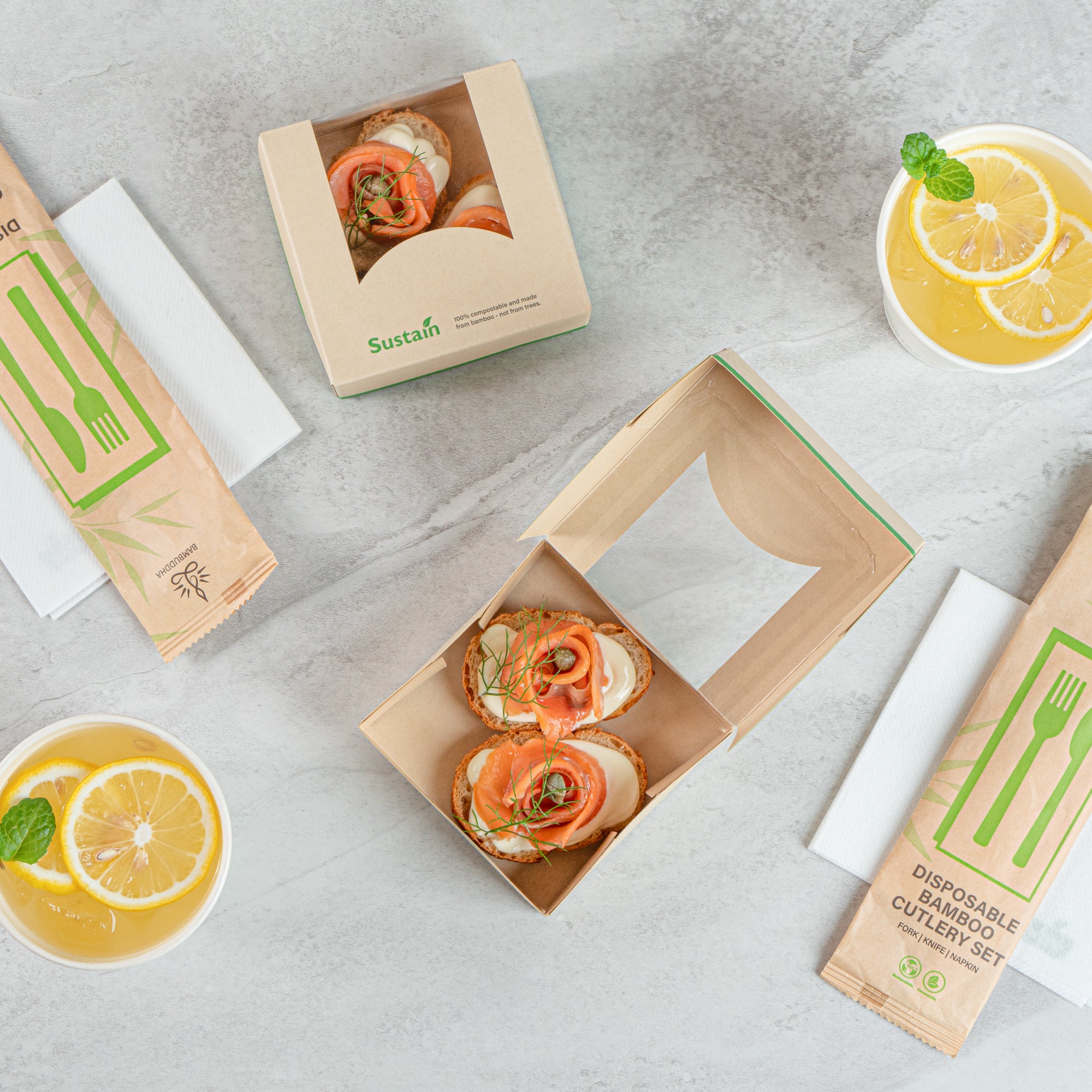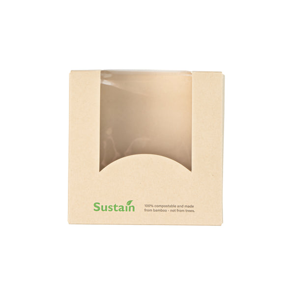 Enhance your eco-friendly packaging with sturdy, sustainable solutions. The Sustain Compostable Clear Window Tab-Lock Takeout Box provides a leak-resistant barrier with its PLA lining, ensuring secure transport and reducing environmental impact—ideal for compostable takeout box needs. Showcasing your culinary creations is effortless with the clear PLA window, offering customers a tempting view of your delectable offerings. The tab-lock design facilitates quick packing and secure closure, optimizing operations for bakeries, restaurants, and catering services. Crafted from compostable bamboo paper, this kraft food container supports green initiatives while its compact size of 3.9 inches by 3.9 inches by 1.6 inches efficiently holds small portions or desserts. This freezer-safe food container is perfect for maintaining food integrity when storing cold dishes. Elevate your takeout service with sustainable and reliable packaging. Each order includes 50 Sustain Compostable Clear Window Tab-Lock Takeout Boxes.