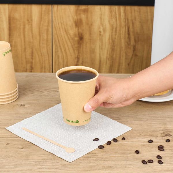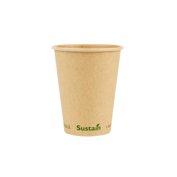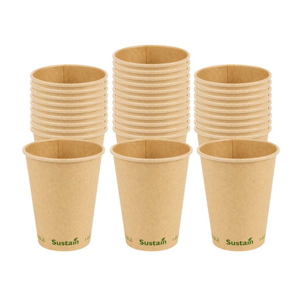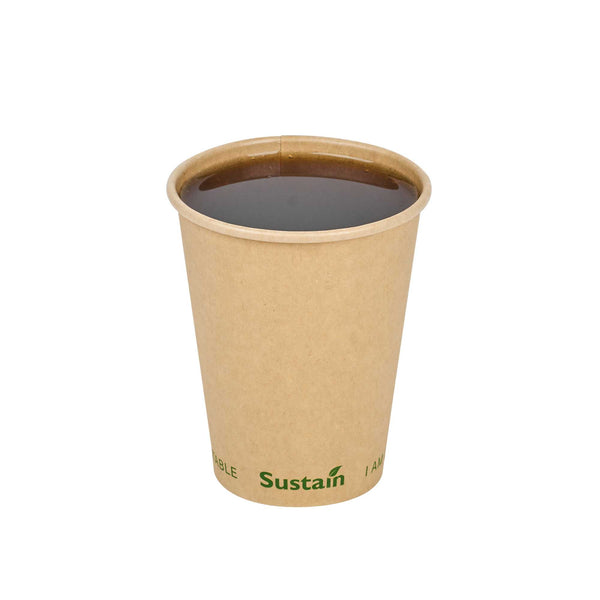 Elevate the experience of your coffee by serving it in our noteworthy Sustain 12-ounce Kraft Paper Coffee Cups. Constructed from top-quality kraft paper, these BPI-certified coffee cups are commercially compostable and biodegradable. These kraft paper coffee cups, sporting a single wall exterior, provide excellent insulation for hot beverages, preserving the warmth inside. Designed with a PLA layer, these disposable coffee cups prevent any leaks. The slightly tapered bottom design makes these single-wall cups easy to stack, making storage a breeze. With a high-temperature tolerance of 212F, these cups are versatile enough for both hot and cold beverages. The "I AM COMPOSTABLE" text on these paper cups ensures that your customers are aware of proper disposal methods. Sip your beverages on the move without a mess, using our perfectly fitting assortment of coffee cup lids. The reinforced edge of these single-wall hot cups stays robust, ensuring a secure fit for the lids. With dimensions of 3.5 inches in diameter by 4.25 inches in height and a capacity of 12 ounces, these compostable cups are perfect for serving a variety of beverages in your café, bistro, or kiosk. Shipped in a 50 count box. Lids are available and sold separately. These items will only degrade outside of the traditional solid waste stream.