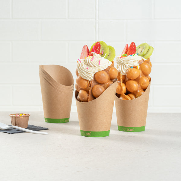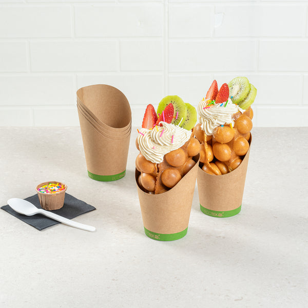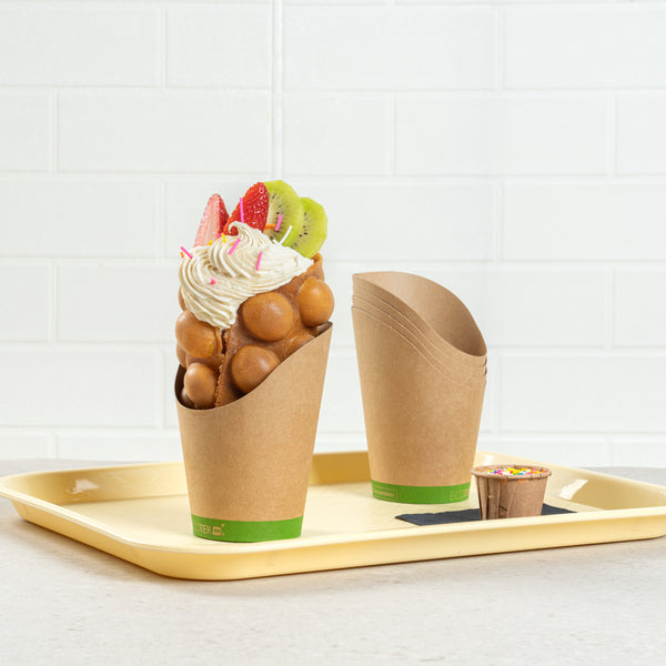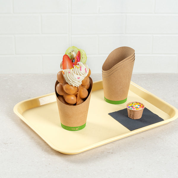 Enhance your beverage service with eco-friendly flair. Sustain Grease-Resistant Kraft Paper Cups feature a unique inclined rim that facilitates quick scooping and serving, perfect for bustling coffee shops and juice bars. With a 12-ounce capacity, these kraft paper cups accommodate both hot and cold beverages, making them versatile disposable beverage cups for any menu offering. The grease-resistant lining ensures no unsightly blotches mar the presentation, maintaining a clean look throughout service. Crafted from durable kraft paper with a compostable PLA lining, these cups align with sustainability goals while providing a sturdy, reliable option for drinkware needs. Measuring 4.65 inches in height, these cups fit comfortably in hand and provide ease of use for guests and staff alike. Incorporate these compostable drinking cups into your establishment to boost your commitment to eco-friendly practices and satisfy environmentally conscious customers. Each order includes 100 Sustain Grease-Resistant Kraft Paper Cups.