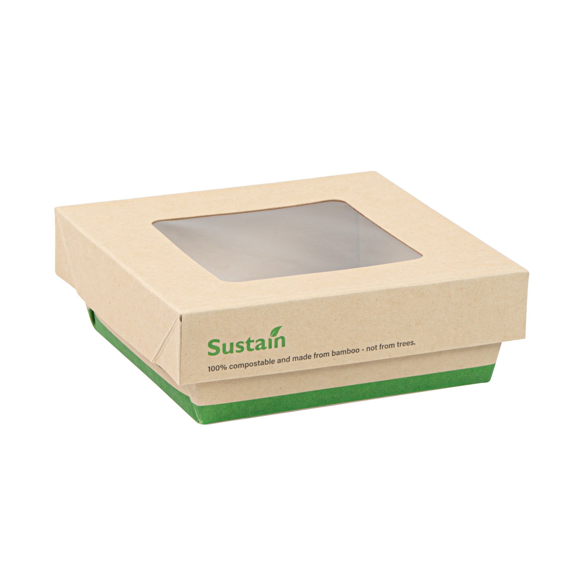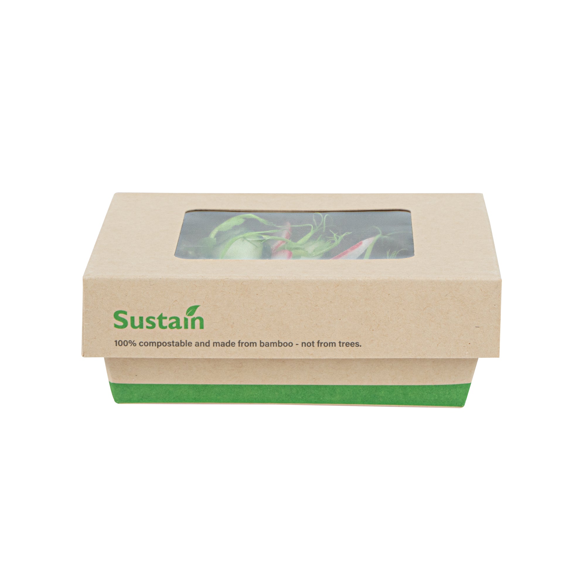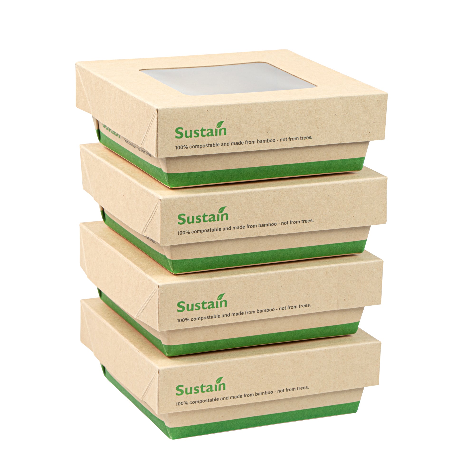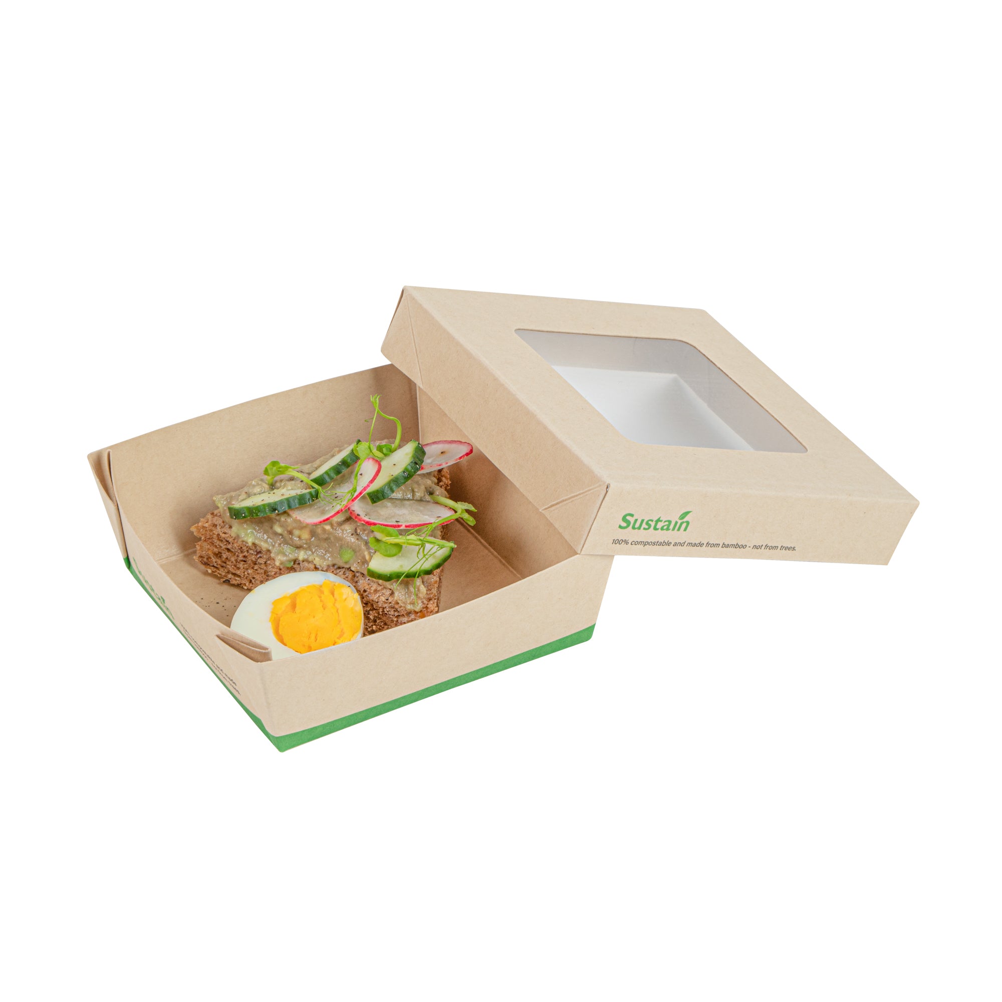 Prevent leaks and showcase your delicious creations effortlessly. Sustain Leak-Resistant Bamboo Paper Takeout Containers feature a PLA lining that prevents leaks, ensuring your 13-ounce meals stay intact during transport. The clear PLA window of these bamboo paper takeout containers enhances visibility, allowing customers to easily view their enticing contents, which can boost impulse purchases. Made from sustainable paper, these compostable takeout containers support eco-friendly disposal practices, aligning with environmentally conscious business goals. Measuring 4.5 inches in length, 4.5 inches in width, and 1.6 inches in height, these disposable food boxes with PLA lining are perfect for a variety of takeout orders. Elevate your foodservice offerings with these biodegradable, greaseproof solutions that promise reliability and clarity. Sold in a 50 count box.