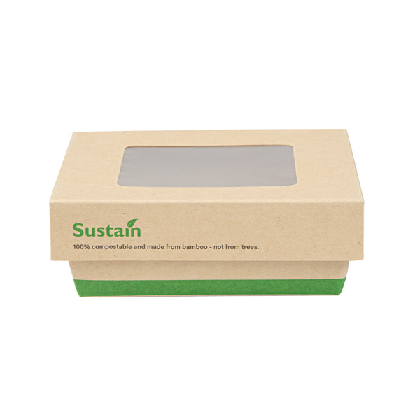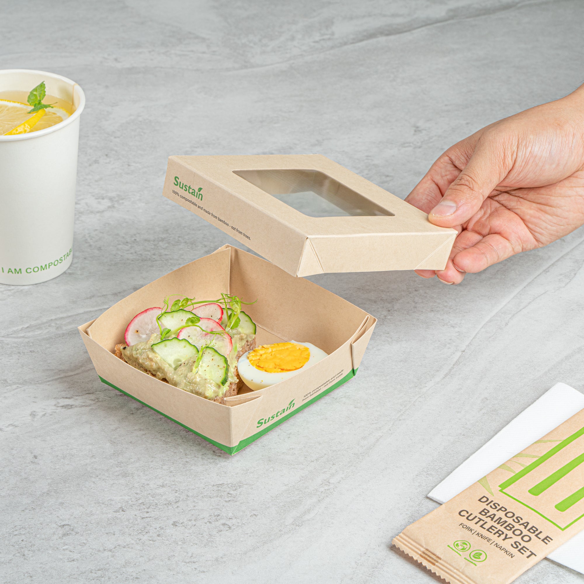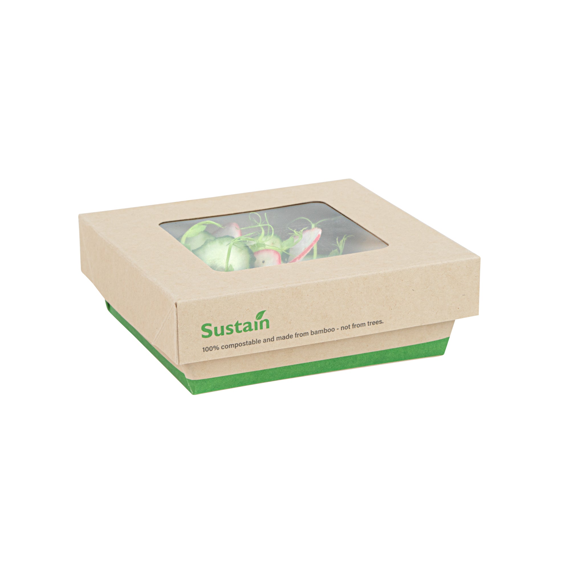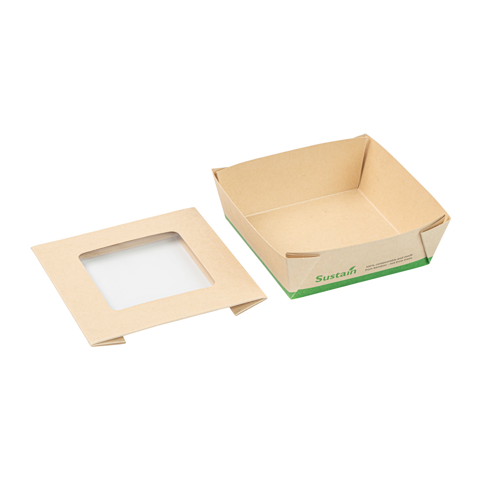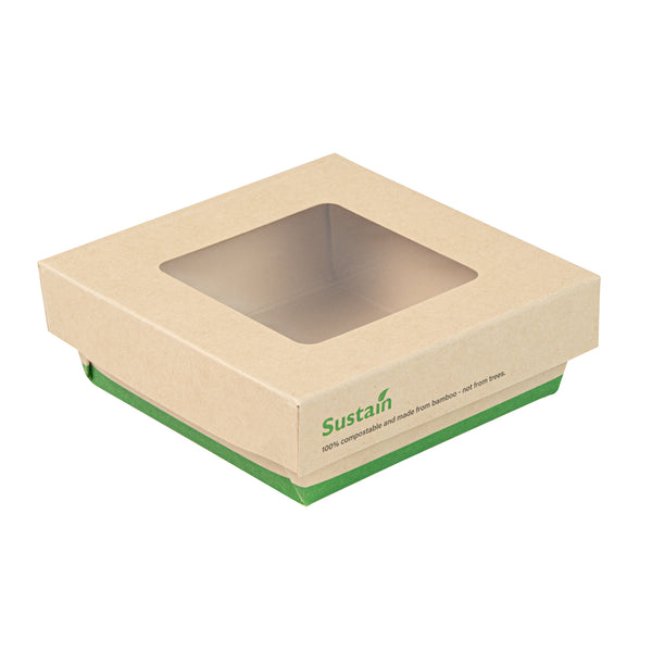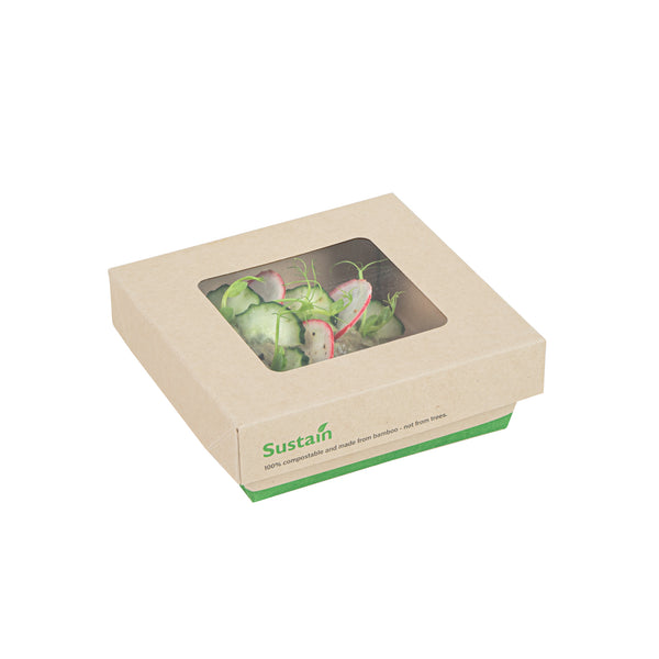 Prevent leaks and showcase your delicious creations effortlessly. Sustain Leak-Resistant Bamboo Paper Takeout Containers feature a PLA lining that prevents leaks, ensuring your 13-ounce meals stay intact during transport. The clear PLA window of these bamboo paper takeout containers enhances visibility, allowing customers to easily view their enticing contents, which can boost impulse purchases. Made from sustainable paper, these compostable takeout containers support eco-friendly disposal practices, aligning with environmentally conscious business goals. Measuring 4.5 inches in length, 4.5 inches in width, and 1.6 inches in height, these disposable food boxes with PLA lining are perfect for a variety of takeout orders. Elevate your foodservice offerings with these biodegradable, greaseproof solutions that promise reliability and clarity. Sold in a 50 count box.
