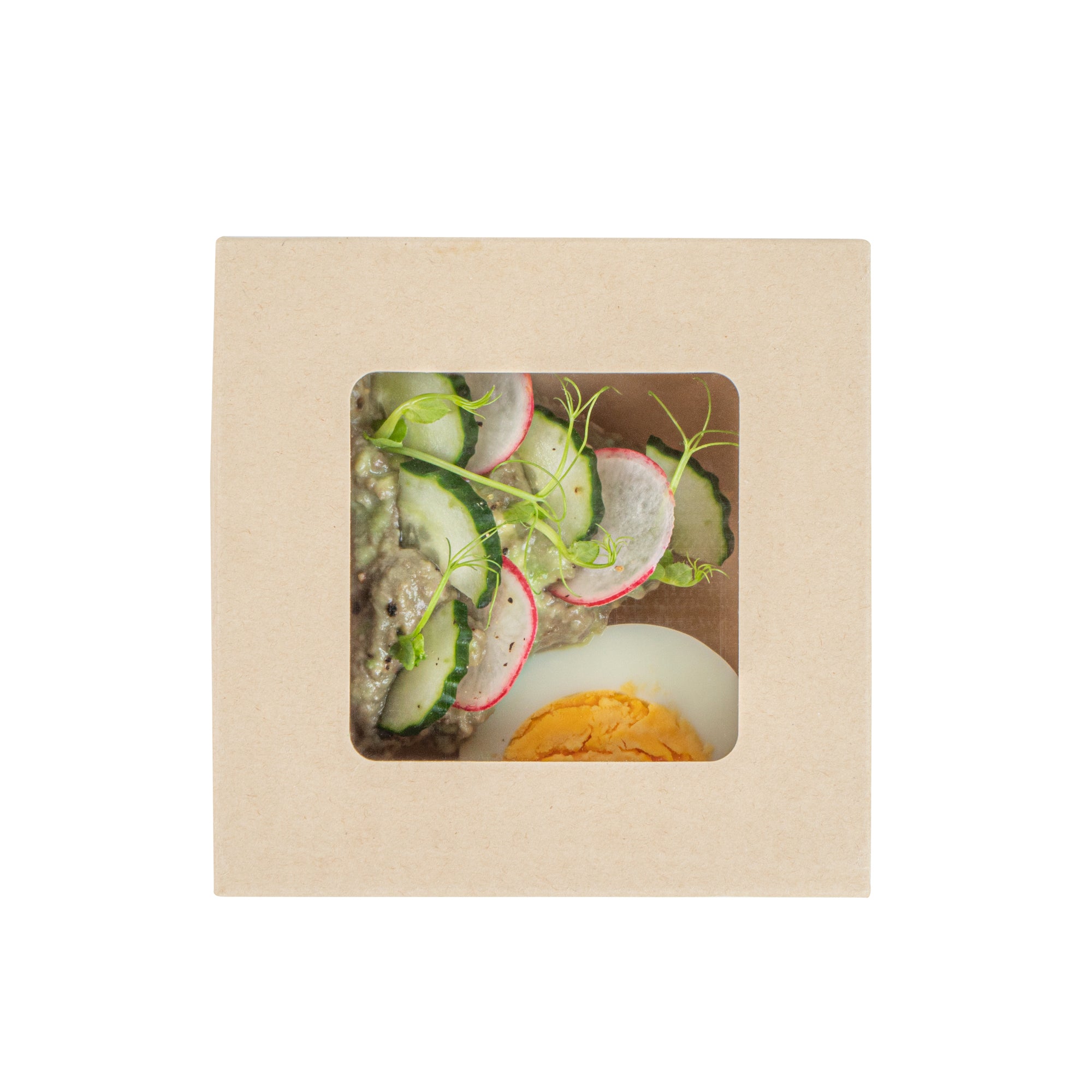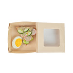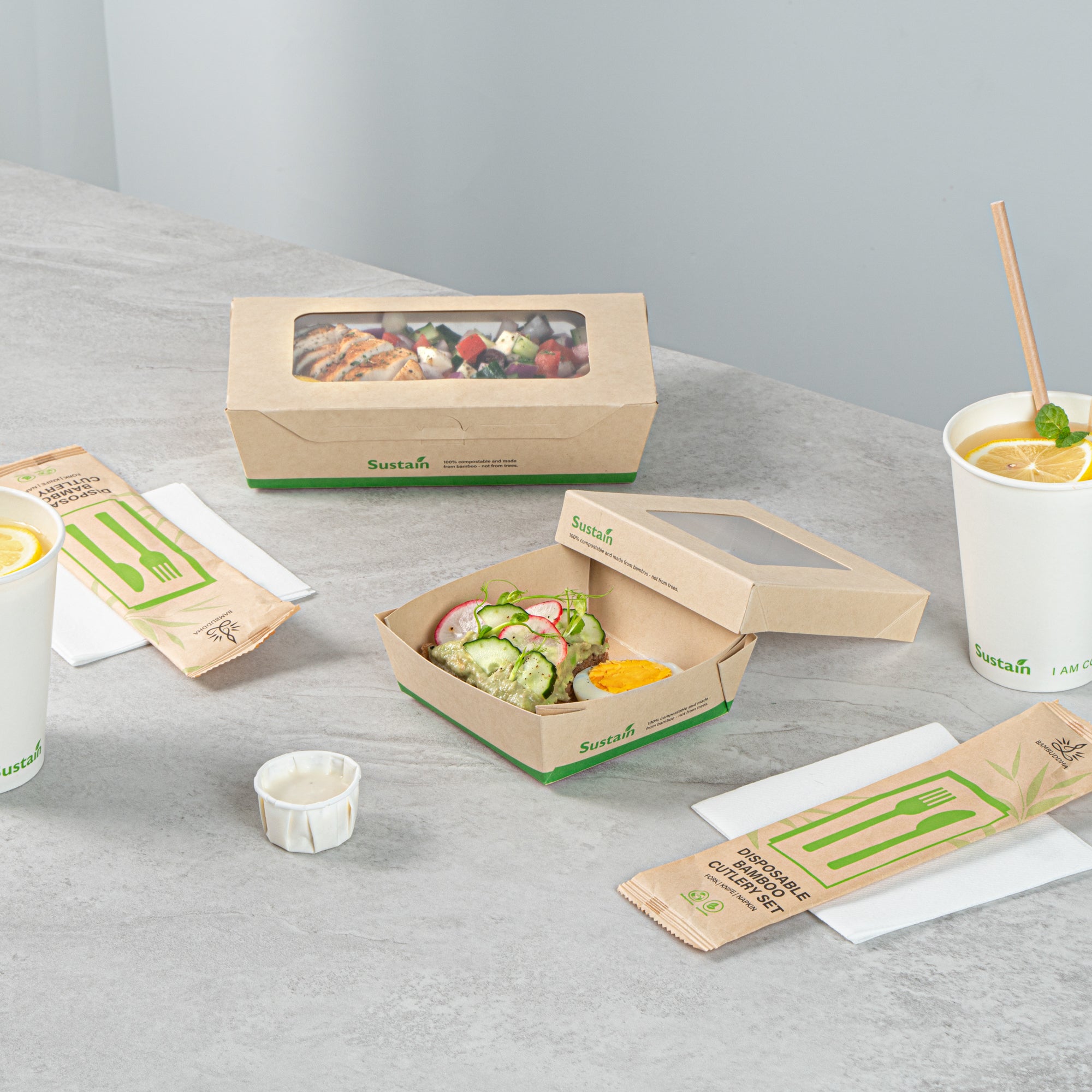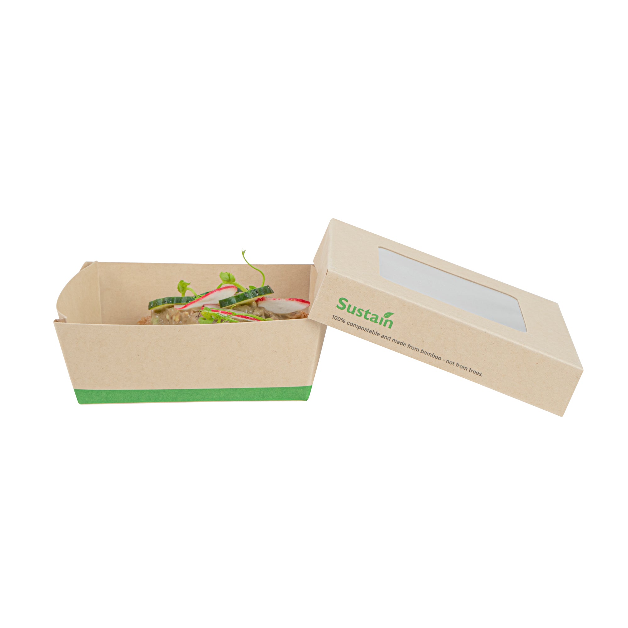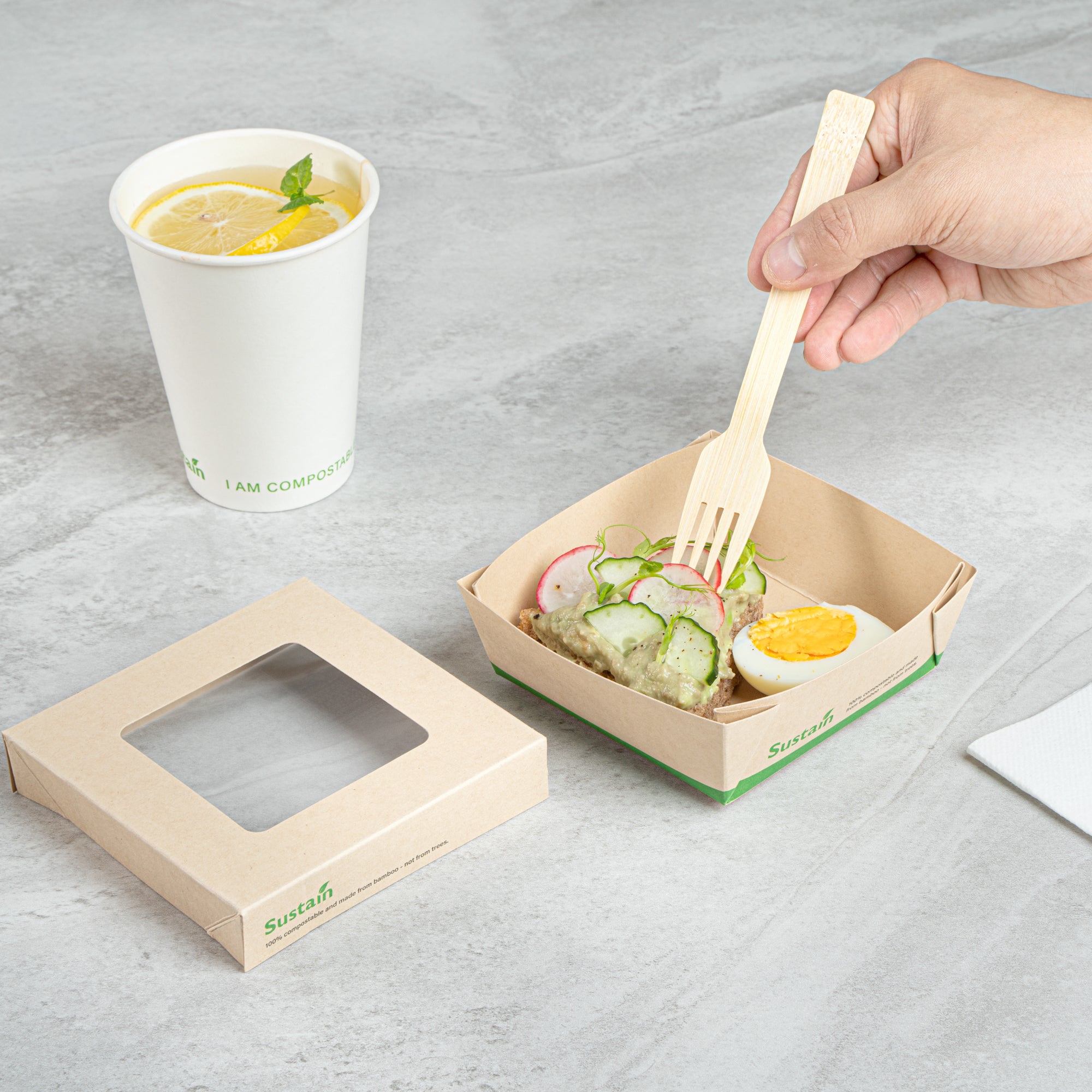 Prevent leaks and showcase your delicious creations effortlessly. Sustain Leak-Resistant Bamboo Paper Takeout Containers feature a PLA lining that prevents leaks, ensuring your 13-ounce meals stay intact during transport. The clear PLA window of these bamboo paper takeout containers enhances visibility, allowing customers to easily view their enticing contents, which can boost impulse purchases. Made from sustainable paper, these compostable takeout containers support eco-friendly disposal practices, aligning with environmentally conscious business goals. Measuring 4.5 inches in length, 4.5 inches in width, and 1.6 inches in height, these disposable food boxes with PLA lining are perfect for a variety of takeout orders. Elevate your foodservice offerings with these biodegradable, greaseproof solutions that promise reliability and clarity. Sold in a 50 count box.