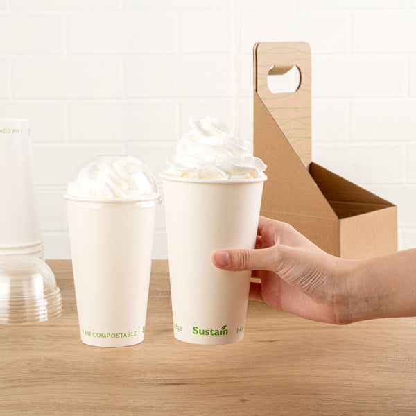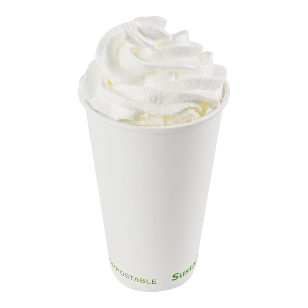 Boost sustainability efforts with our eco-conscious drinkware. The Sustain 16 oz Leak-Resistant Compostable Cold Cup – White Paper, 3.54 inches by 5.39 inches, is crafted from durable paper with a PLA lining, ensuring it stands up to cold beverages without leaking. This 16-oz compostable cold cup is ideal for quick-service restaurants aiming to reduce their environmental footprint. The compostable paper cold cup supports eco-friendly foodservice operations, offering a biodegradable solution for serving iced coffees or smoothies. Invest in this biodegradable cold drink cup to enhance your establishment's sustainability initiatives while providing reliable service. Each order includes 50 Sustain 16 oz Leak-Resistant Compostable Cold Cups.