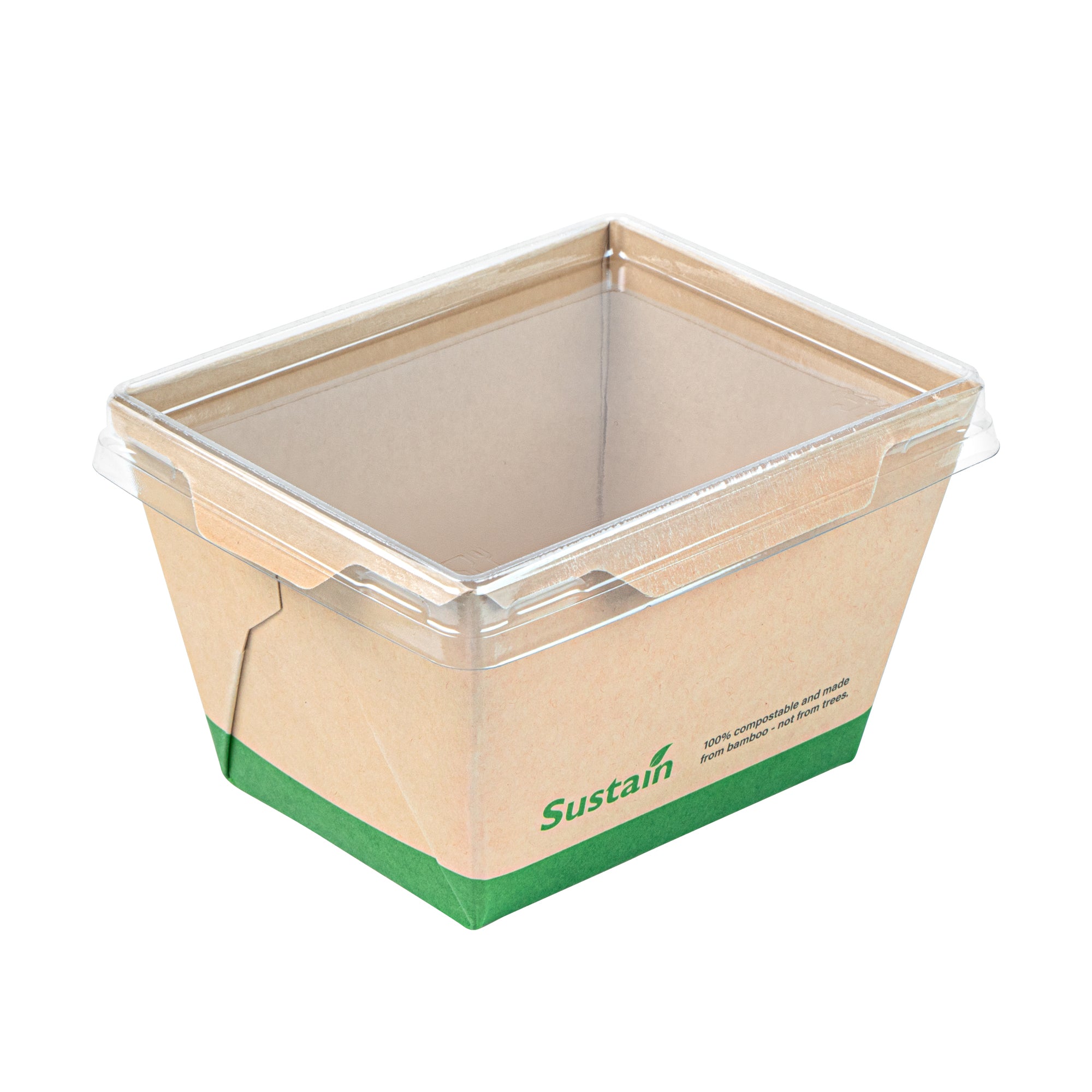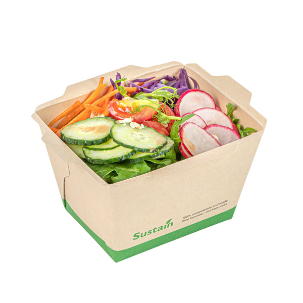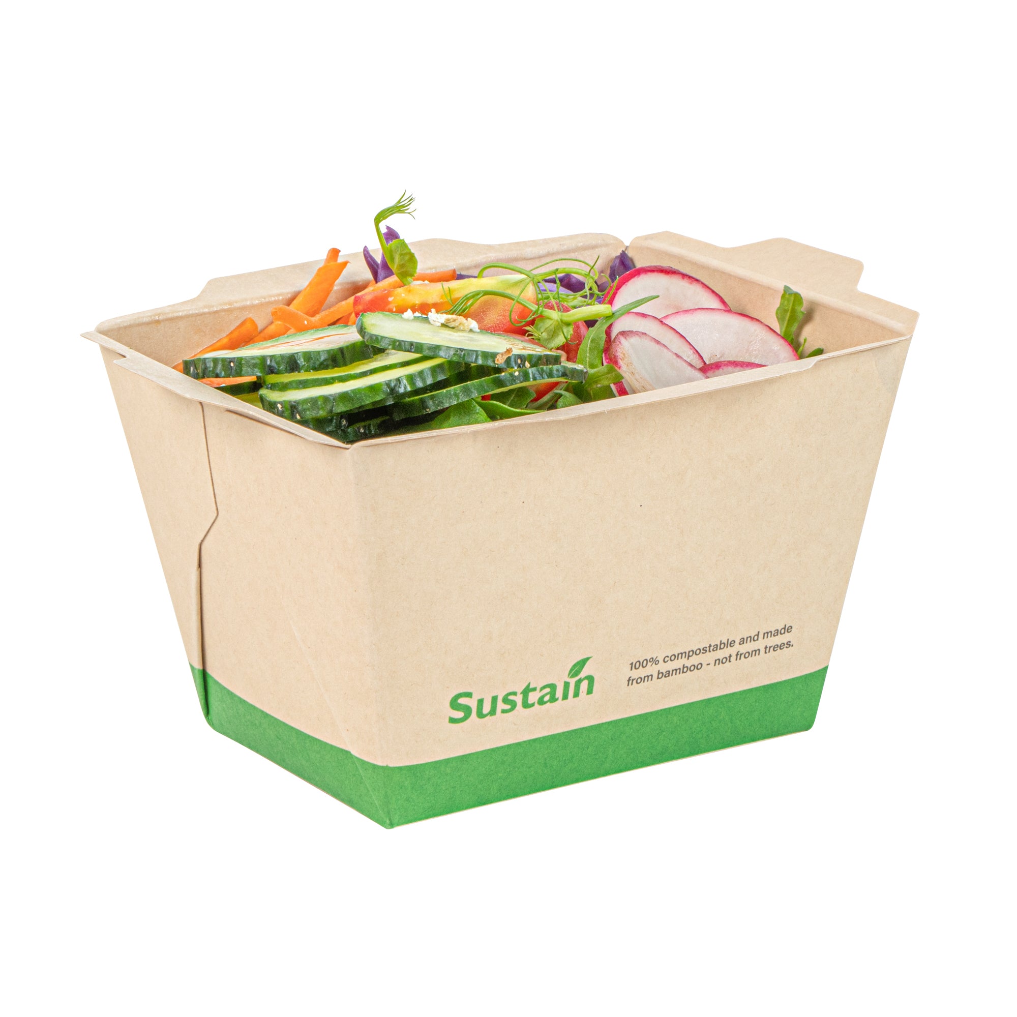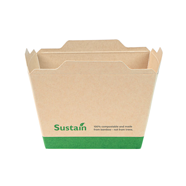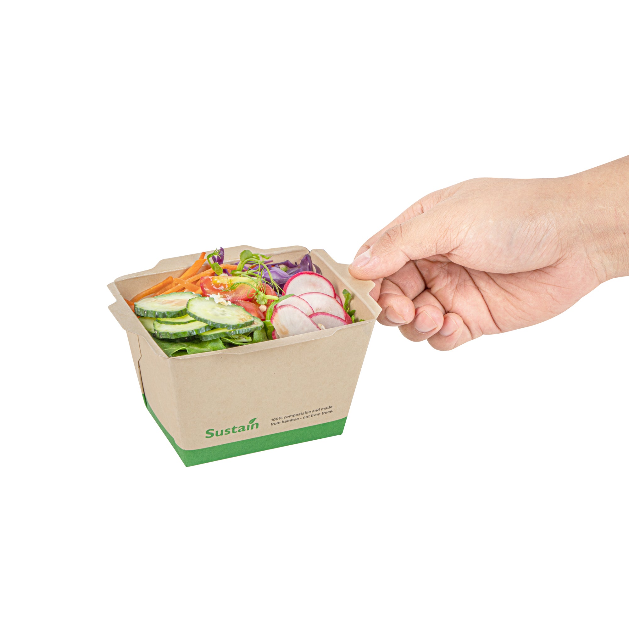 Ensure mess-free transport with a secure food container. The Sustain Leakproof Kraft Paper Compostable Food Container combines eco-friendly design with advanced functionality, featuring a PLA lining that prevents leaks for a seamless service experience. Its click-lock mechanism ensures a secure closure, keeping contents intact during transportation, making it ideal for busy restaurants offering takeout or delivery. Constructed from sturdy bamboo paper, this leakproof bamboo container offers a sustainable alternative to traditional packaging while maintaining structural integrity. Measuring 4.3 inches in length, 3.3 inches in width, and 2.8 inches in height, enhancing operational efficiency. Opt for an environmentally responsible choice with this versatile container, perfect for delis, cafes, and catering events that prioritize sustainability. Each order includes 50 Sustain Leakproof Kraft Paper Compostable Food Containers.