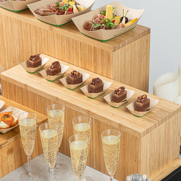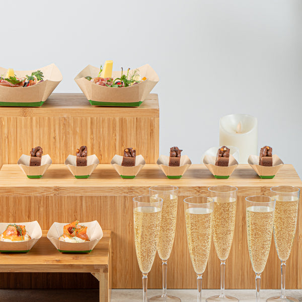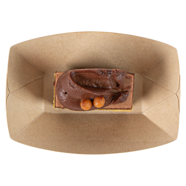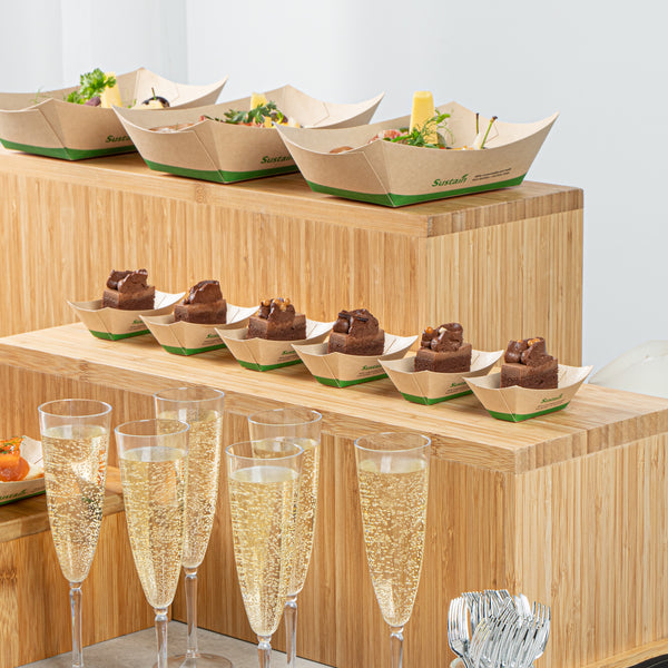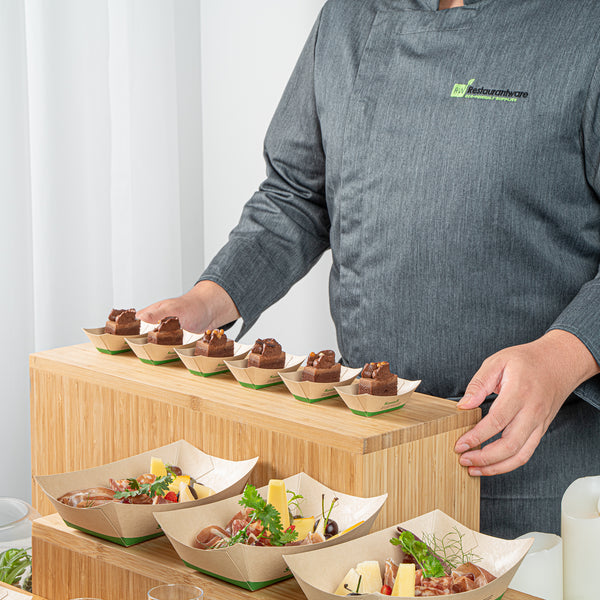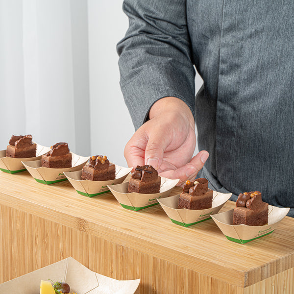 Ensure seamless service with leak-resistant food trays. The Sustain Leak-Resistant Bamboo Paper Food Tray combines a PLA lining with sturdy paper construction to prevent unwanted leaks and maintain the integrity of your dishes. With dimensions of 2 inches in length, 0.8 inches in width, and 1.2 inches in height, these bamboo paper food trays are compact yet robust, ensuring a stable presentation of your culinary creations. Crafted from kraft paper, these trays are commercially compostable, providing an eco-friendly disposal option for environmentally-conscious establishments. The kraft paper boat design resists folding or bending, making it ideal for serving neat samplers without compromising on presentation. Elevate your foodservice operations by choosing this compostable paper tray to impress your guests while reducing your environmental footprint. Each order includes 400 Sustain Leak-Resistant Bamboo Paper Food Trays.