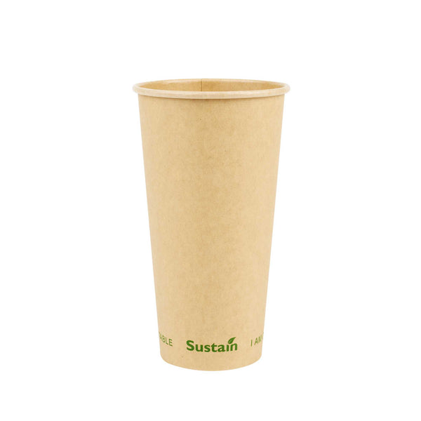 Relish hot or cold coffee using our Sustain 20-ounce Kraft Paper Coffee Cups. An eco-friendly approach is emphasized to your customers with the "I AM COMPOSTABLE" imprint on these cups, indicating their commercial compostability. The single-wall design of these kraft paper coffee cups includes insulation, retaining heat inside the cup, and maintaining the hot contents. These disposable cups exhibit superior endurance with their top-quality kraft paper construction and a PLA coating that ensures leak-proof usage and avoids condensation build-up. With a firm rolled edge and a slightly tapered bottom finish, these single-wall coffee cups are stackable, retaining their form while conserving storage space. These BPI-certified coffee cups have a temperature tolerance of up to 212F, making them suitable for hot or cold beverages alike. For an orderly drinking experience, pair these cups with our assortment of corresponding coffee cup lids. With dimensions of 3.5 inches in diameter by 6.25 inches in height, these hot paper cups offer a 20-ounce capacity, perfect for serving large beverages in your café, diner, or kiosk. Shipped in a 1,000 count box. Lids are available and sold separately. These items will only degrade outside of the traditional solid waste stream.