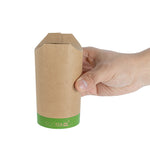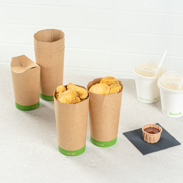 Elevate your take out presentation with our Sustain 20-ounce Round Kraft Paper To Go Fry Cups. The grease-resistant PLA lining of these charcuterie cups prevents oil and grease from seeping through, ensuring a mess-free and enjoyable snacking experience. These disposable paper cups are commercially compostable and biodegradable, providing an environmentally-responsible choice for serving snacks. Made from thick paper, these durable paper cups securely hold your snacks without any risk of tearing. With a kraft finish, these rustic food cups add a stylish look to any food presentation. After use, these disposable cups can be discarded for a straightforward cleanup, making them ideal for busy foodservice environments. Holding a generous capacity of 20 ounces, these snack cups measure 3.35 inches in diameter by 4.92 inches in height, perfectly sized for a variety of snacks. Sold in a 100 count box. These items will only degrade outside of the traditional solid waste stream.