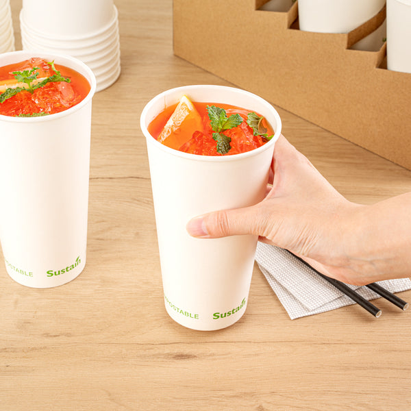 Enhance your beverage service with eco-friendly drinkware solutions. Sustain Compostable Paper Cold Cups boast a PLA lining that creates a leak-resistant barrier, ensuring your 20-ounce cold beverages are securely contained without messy spills. The compostable design supports eco-friendly operations and branding, making these biodegradable paper cups an excellent choice for establishments prioritizing sustainability. Ideal for serving smoothies, iced drinks, and more, these cold food-friendly cups are perfect for quick-service restaurants and food courts. Constructed from white paper with a tightly-rolled rim, these cups provide a clean appearance and a comfortable drinking experience that enhances customer satisfaction. With dimensions of 3.54 inches by 3.54 inches by 6.26 inches, these PLA-lined cups are compatible with standard lids, ensuring spill-free transport. Choose these cups to reinforce your commitment to the environment. Each order includes 1000 Sustain Leak-Resistant 20 oz Compostable Paper Cold Cups.