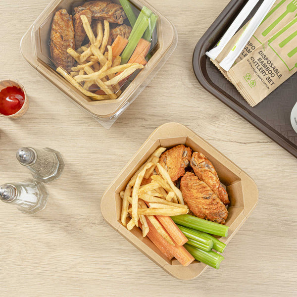 These disposable kraft food containers are highly versatile and suitable for hot and cold foods, offering reliable performance across a wide range of temperatures. Serve stews, noodles, salads, chilled desserts, and more!