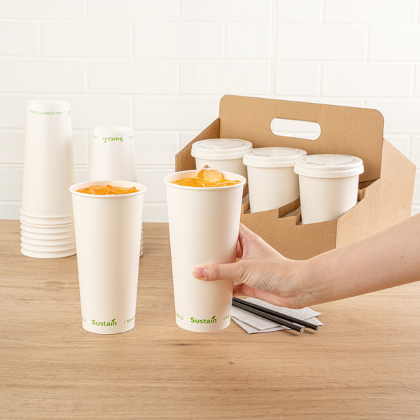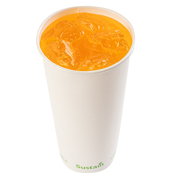 Ensure sustainable beverage service with eco-friendly drinkware. The Sustain Leak-Proof Compostable Cold Cup features compostable PLA lining that reduces landfill waste impact while maintaining beverage quality. This paper cup, measuring 3.54 inches in diameter and 6.65 inches in height, features a tightly rolled rim for a leakproof beverage service, ensuring customer satisfaction at fast casual restaurants and cafés. Its slightly tapered bottom allows for easy stackability, optimizing storage in busy foodservice environments. Enhance your drink presentation while communicating your eco-friendly commitment. Each order includes 1000 Sustain 22 oz Leakproof Compostable Cold Cups.