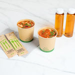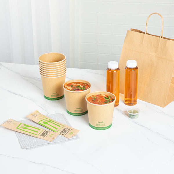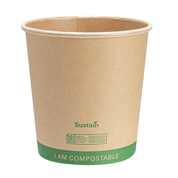 Elevate your food presentation with our Sustain 24-ounce Round Kraft Paper Soup Containers, designed to meet all your serving needs. These kraft soup containers are BPI-certified commercially compostable, significantly reducing waste and minimizing your carbon footprint. Leak-resistant design of this paper food cup ensures safe transportation, preventing messes and allowing you to serve soups, stews, noodles, and more at any temperature. Crafted from durable paper, these take out soup bowls are perfect for serving both hot and cold foods with ease. These to go food containers are stackable, making them ideal for easy storage in busy kitchens. Measuring 4.53 inches in diameter by 4.45 inches in height, this hot food paper cup boasts a generous 24-ounce capacity, perfectly catering to large portions. Sold in a 200 count box.