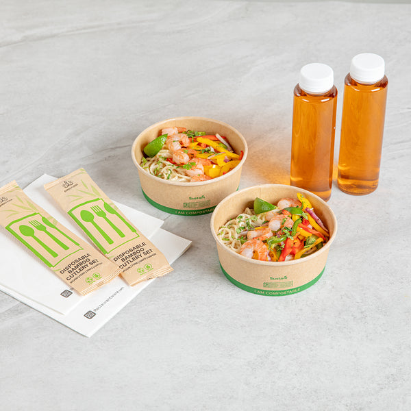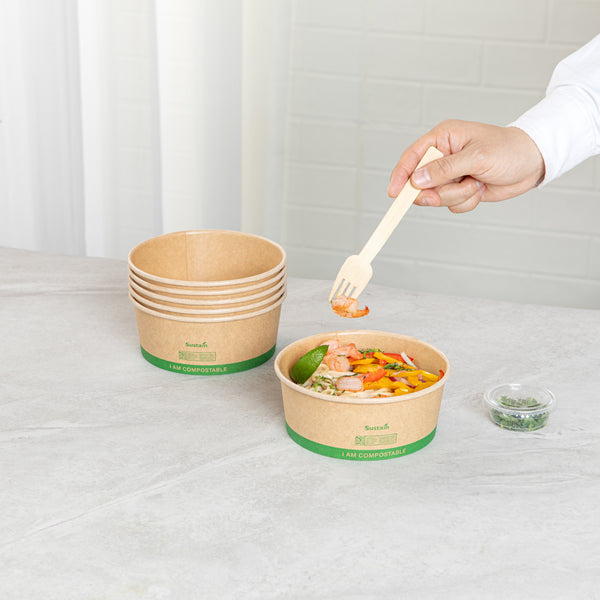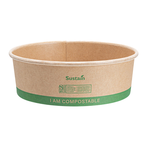 Our Sustain 25-ounce Round Kraft Paper Take Out Containers are the perfect eco-friendly solution for your foodservice needs. These paper meal prep bowls are BPI-certified commercially compostable, helping reduce waste and minimize your carbon footprint. Featuring a grease-resistant PLA lining, these disposable salad bowls keep oil from soaking through for a neat and appetizing food presentation. Stackable and easy to store, these kraft food containers optimize your kitchen space. Ideal for takeaway orders, these to go containers are suitable for serving both hot and cold foods. Measuring 5.87 inches in diameter by 2.36 inches in height, these takeaway boxes have a substantial 25-ounce capacity to accommodate generous portions. Sold in a 50 count box.