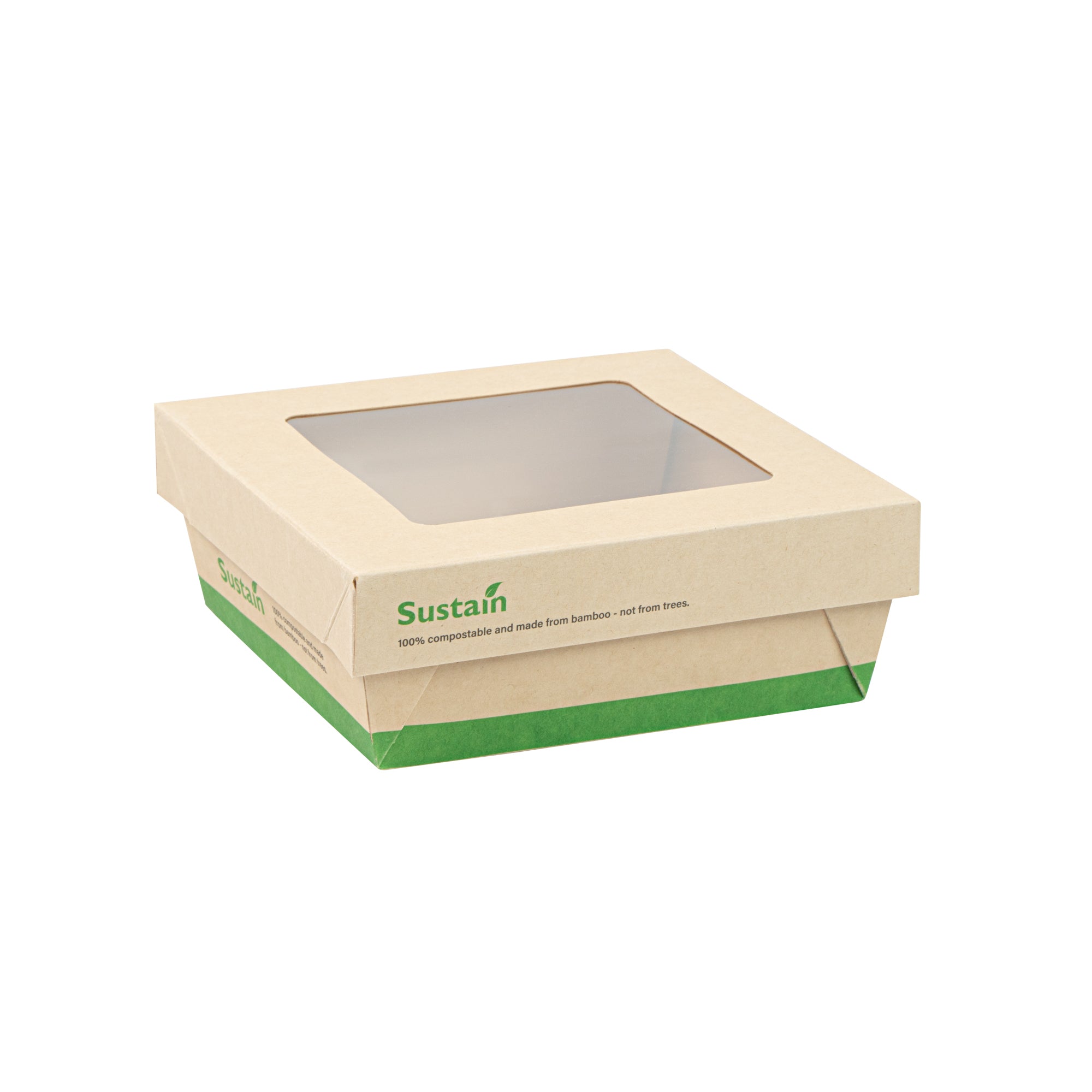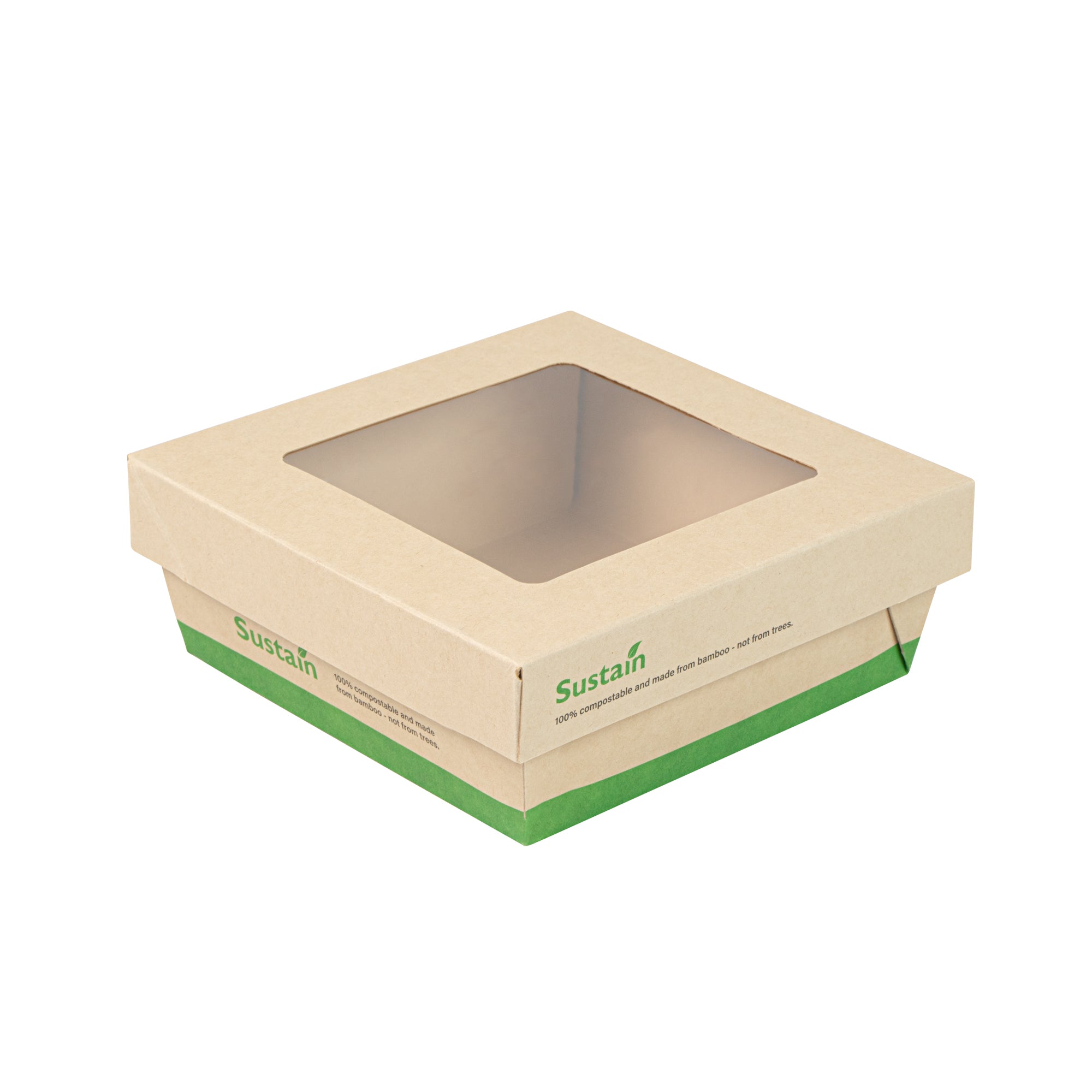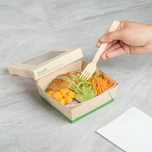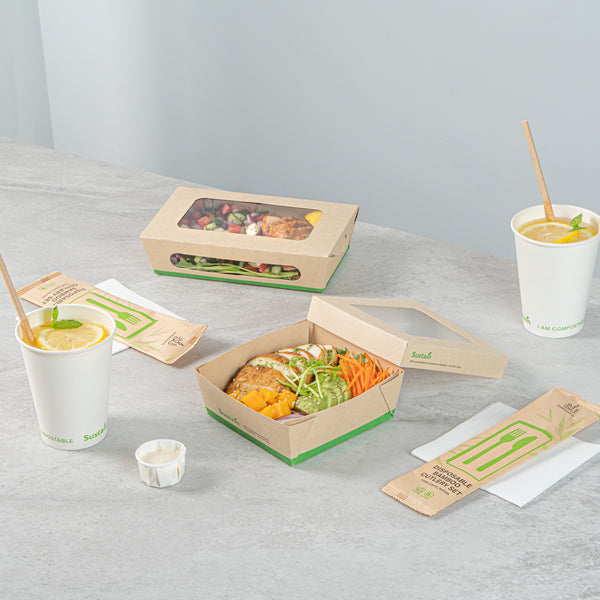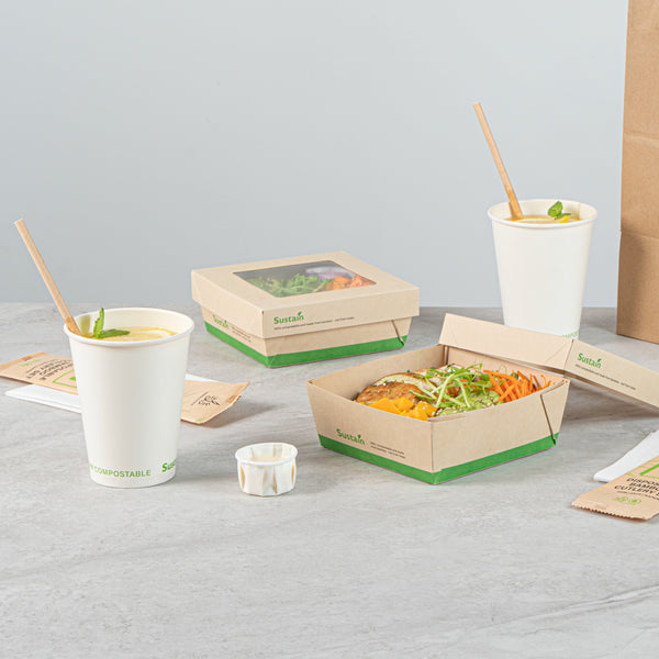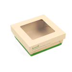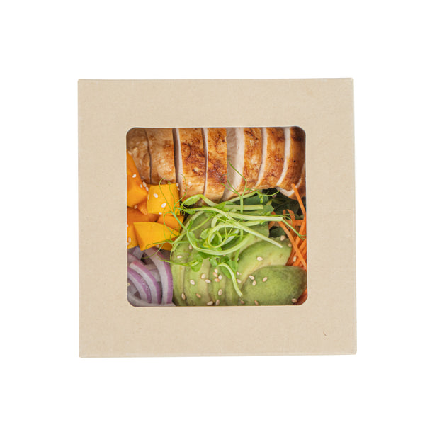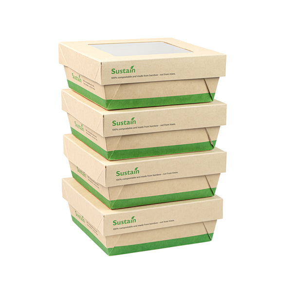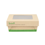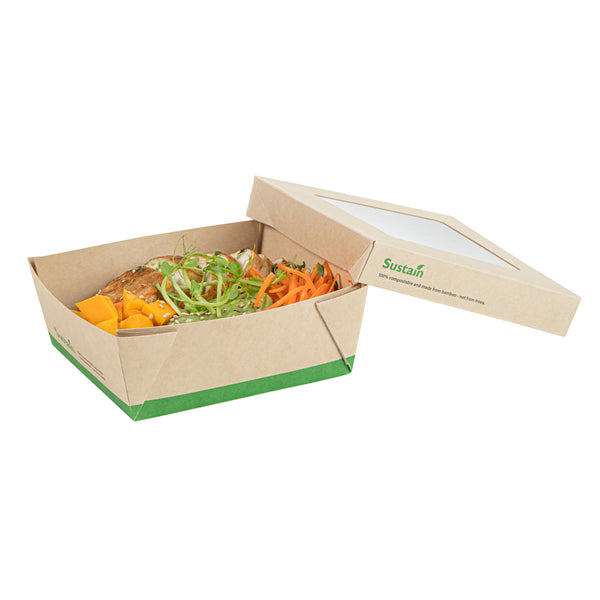 Ensure fresh presentations with leak-resistant takeout solutions. The Sustain Leak-Resistant Takeout Box features a PLA lining that prevents leaks, maintaining the quality of your dishes while reducing mess, making it an ideal takeout box for busy foodservice environments. The clear PLA window allows customers to easily view the contents, enhancing the appeal of your offerings and encouraging repeat orders. Constructed from kraft paper, this takeout box is commercially compostable, providing an eco-friendly disposal solution that aligns with sustainable practices and reduces environmental impact. With dimensions of 5.3 inches by 5.3 inches by 2 inches, this compostable container offers ample space to securely package a variety of meals for on-the-go dining. Seamlessly integrate these kraft paper take out boxes into your operations to optimize efficiency and demonstrate your commitment to sustainability. Sold in a 50 count box.