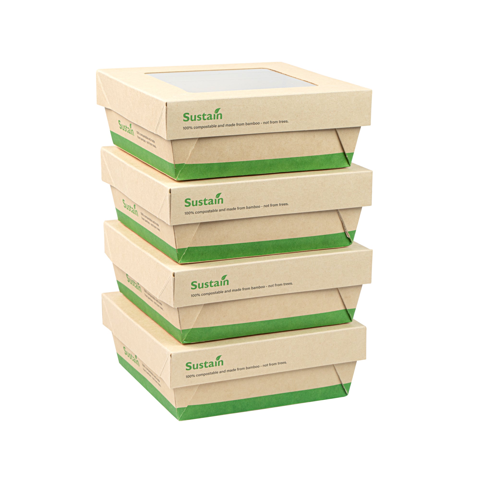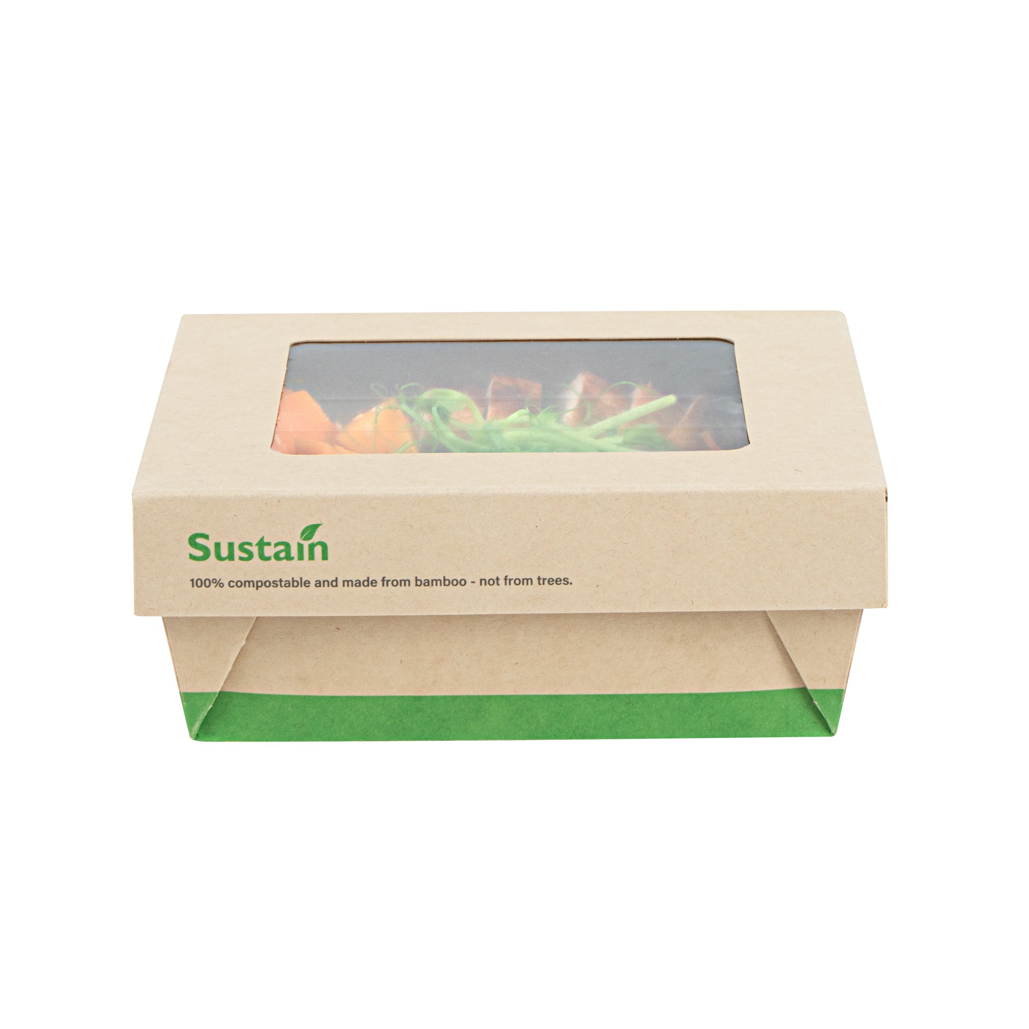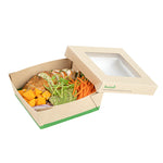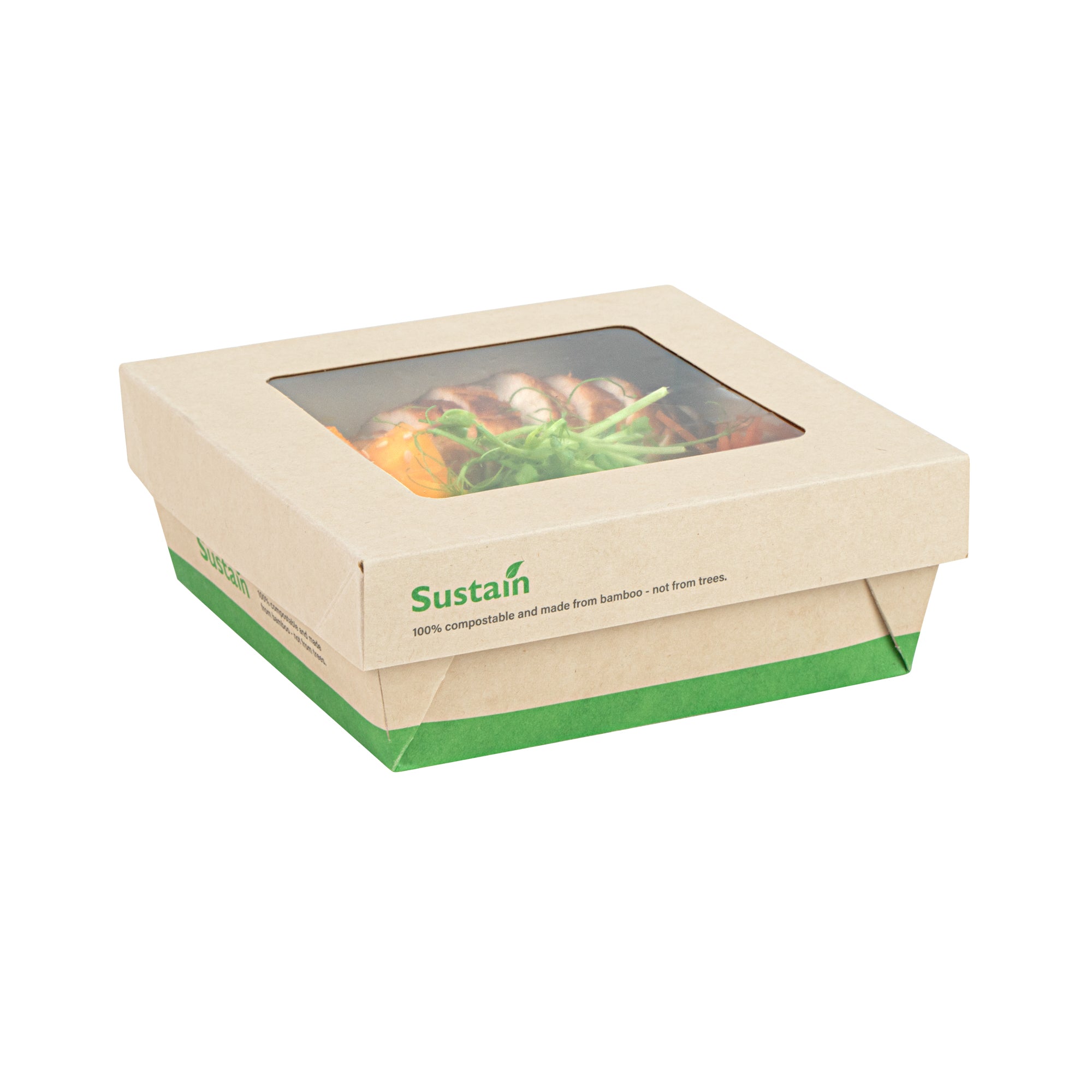 Ensure fresh presentations with leak-resistant takeout solutions. The Sustain Leak-Resistant Takeout Box features a PLA lining that prevents leaks, maintaining the quality of your dishes while reducing mess, making it an ideal takeout box for busy foodservice environments. The clear PLA window allows customers to easily view the contents, enhancing the appeal of your offerings and encouraging repeat orders. Constructed from kraft paper, this takeout box is commercially compostable, providing an eco-friendly disposal solution that aligns with sustainable practices and reduces environmental impact. With dimensions of 5.3 inches by 5.3 inches by 2 inches, this compostable container offers ample space to securely package a variety of meals for on-the-go dining. Seamlessly integrate these kraft paper take out boxes into your operations to optimize efficiency and demonstrate your commitment to sustainability. Sold in a 50 count box.