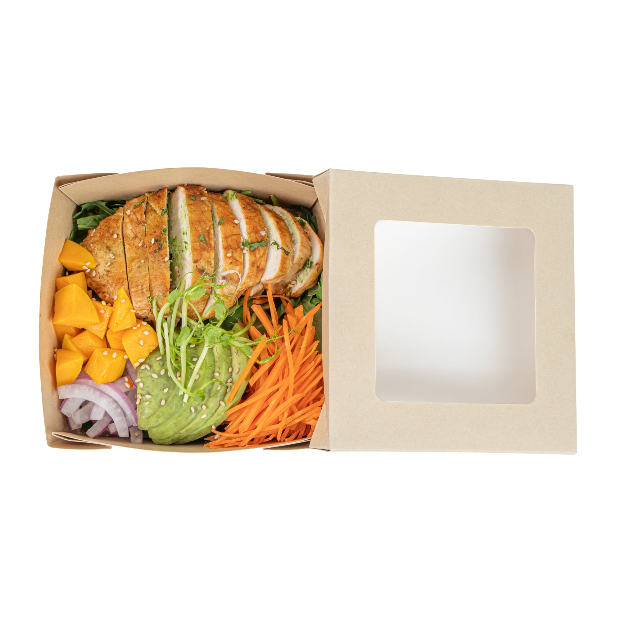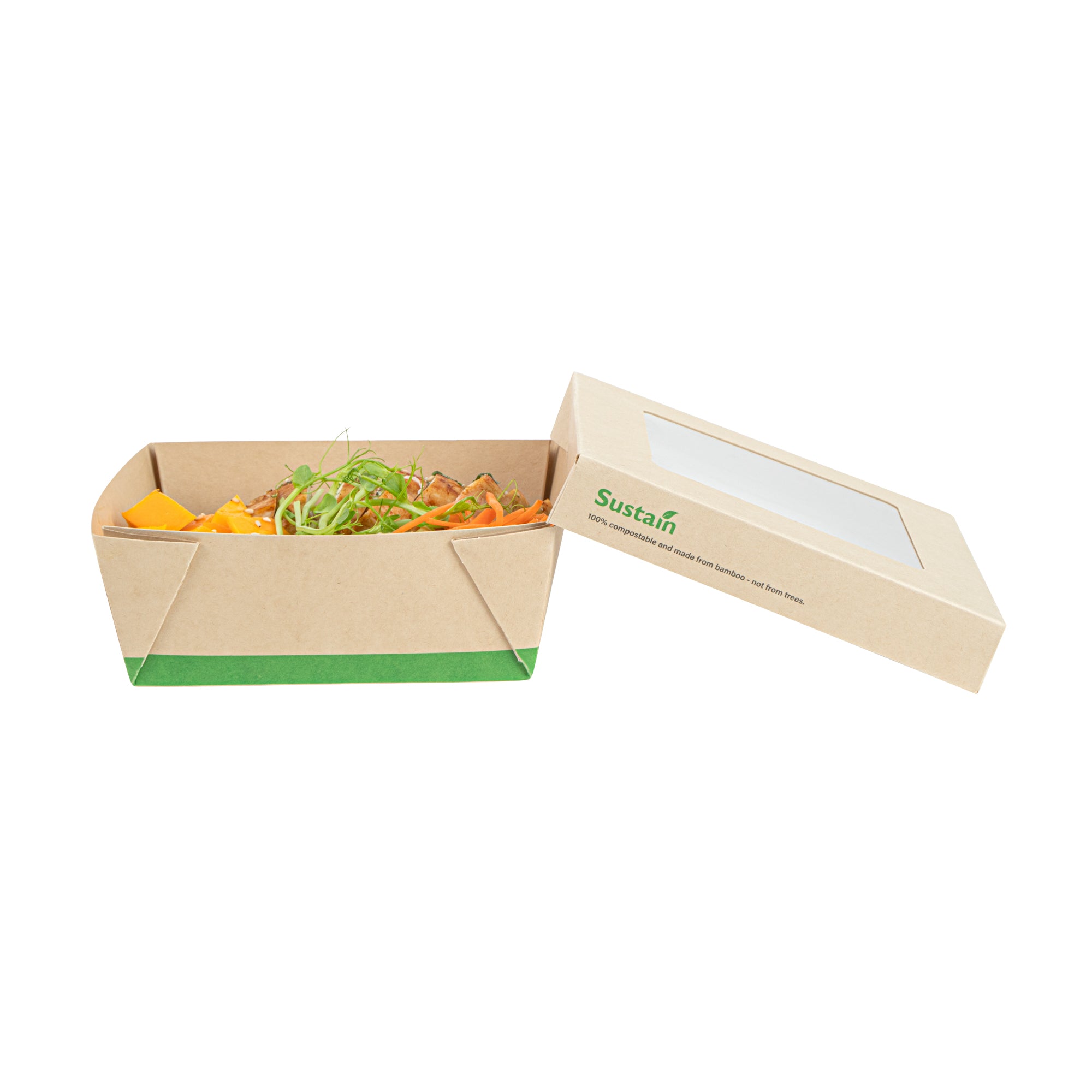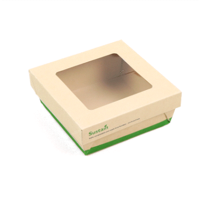 - Clear PLA windows improve visibility of packaged goods