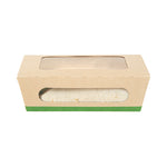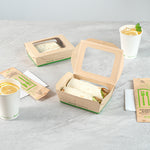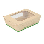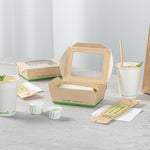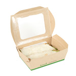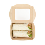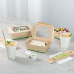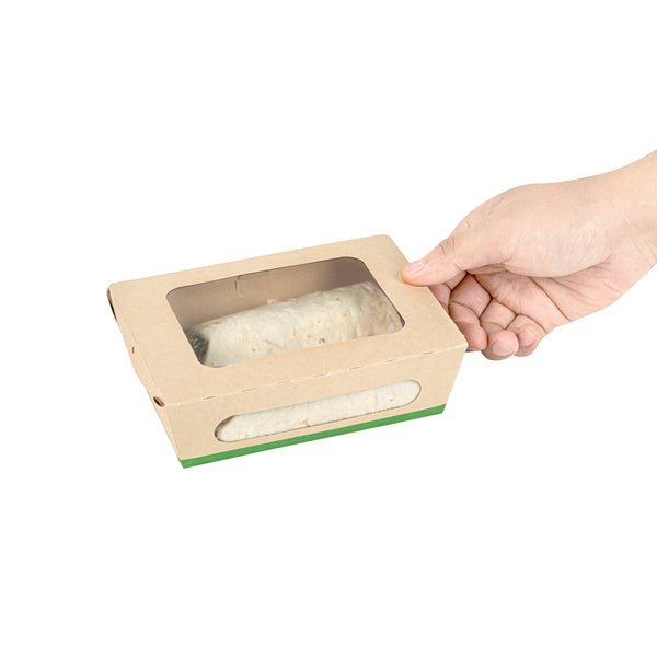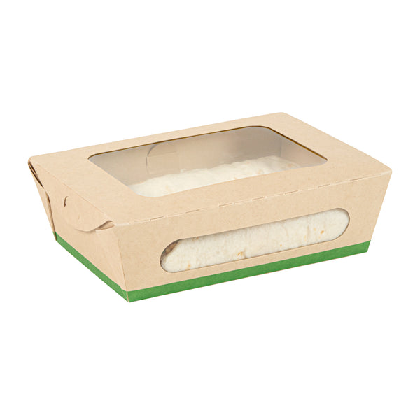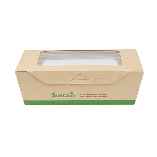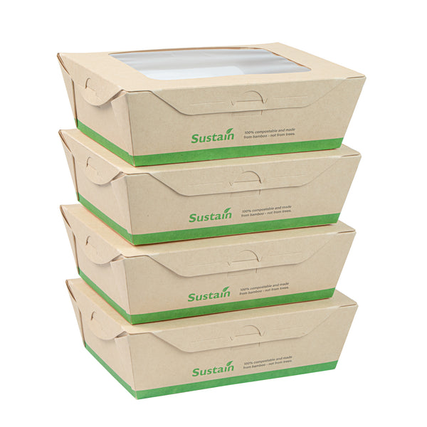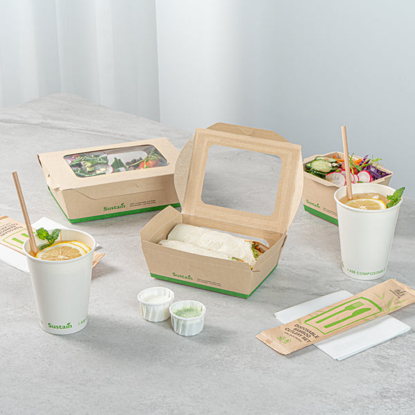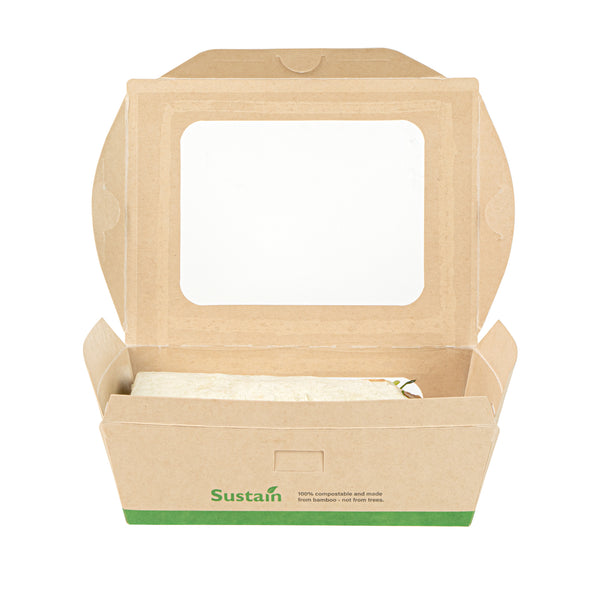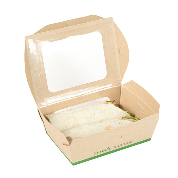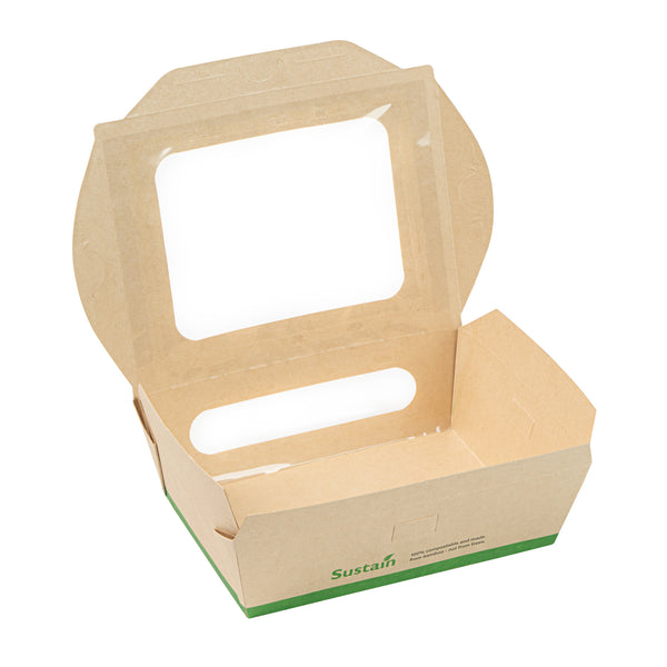 Ensure seamless service with leak-resistant, eco-friendly packaging. The Sustain Leak-Resistant Compostable Takeout Container features a PLA lining that prevents leaks, ensuring mess-free transport for your dishes. This compostable takeout container is crafted from sustainable paper, making it commercially compostable and supporting eco-friendly disposal practices. With dimensions of 6.3 inches in length, 4.7 inches in width, and 2 inches in height, this kraft paper food box is perfect for accommodating a variety of foods. The clear PLA windows enhance visibility, allowing customers to easily view and select their desired meals, making this clear window food box ideal for restaurants and cafes aiming to improve customer experience. Offer your patrons an environmentally responsible dining option without sacrificing convenience. Sold in a 200 count box.
