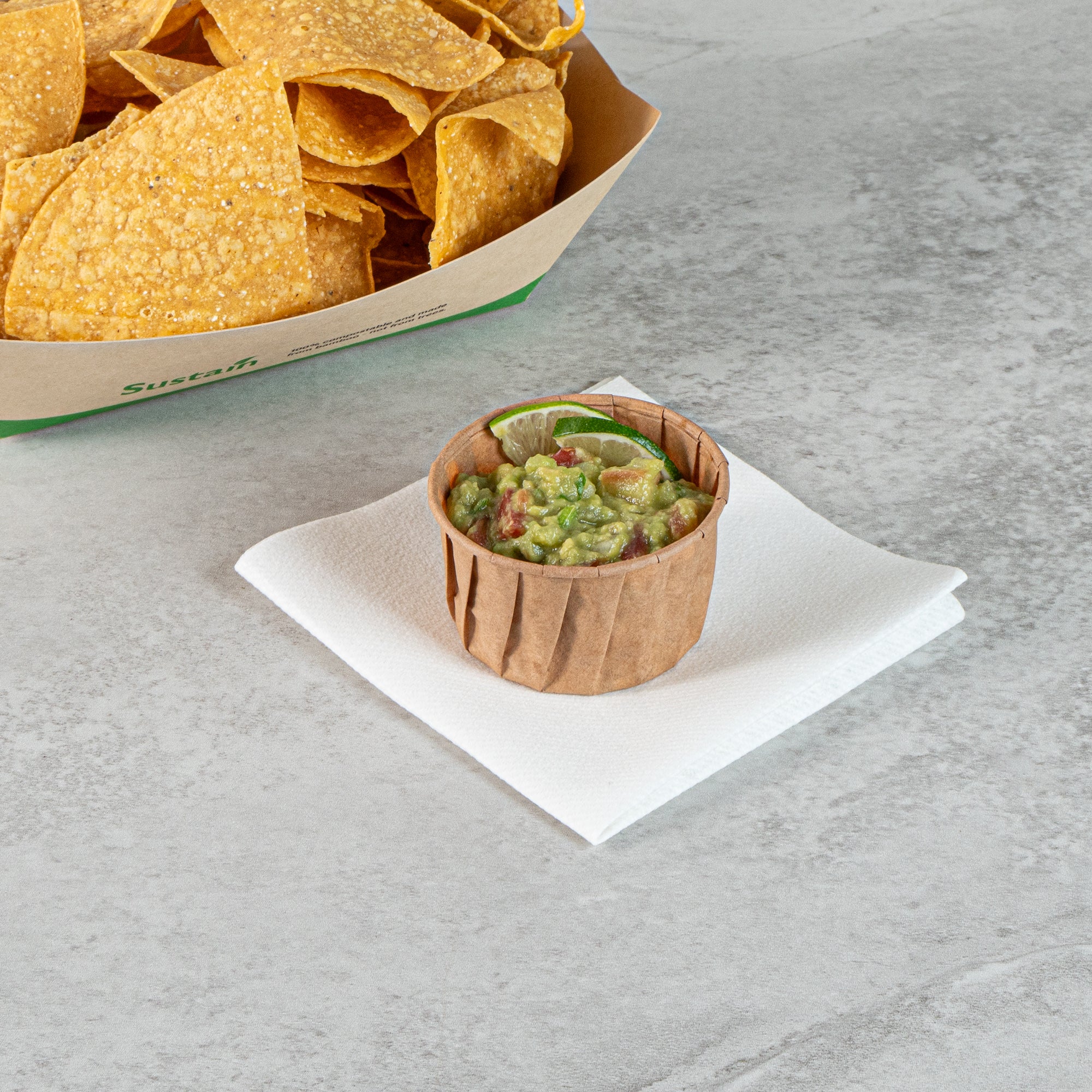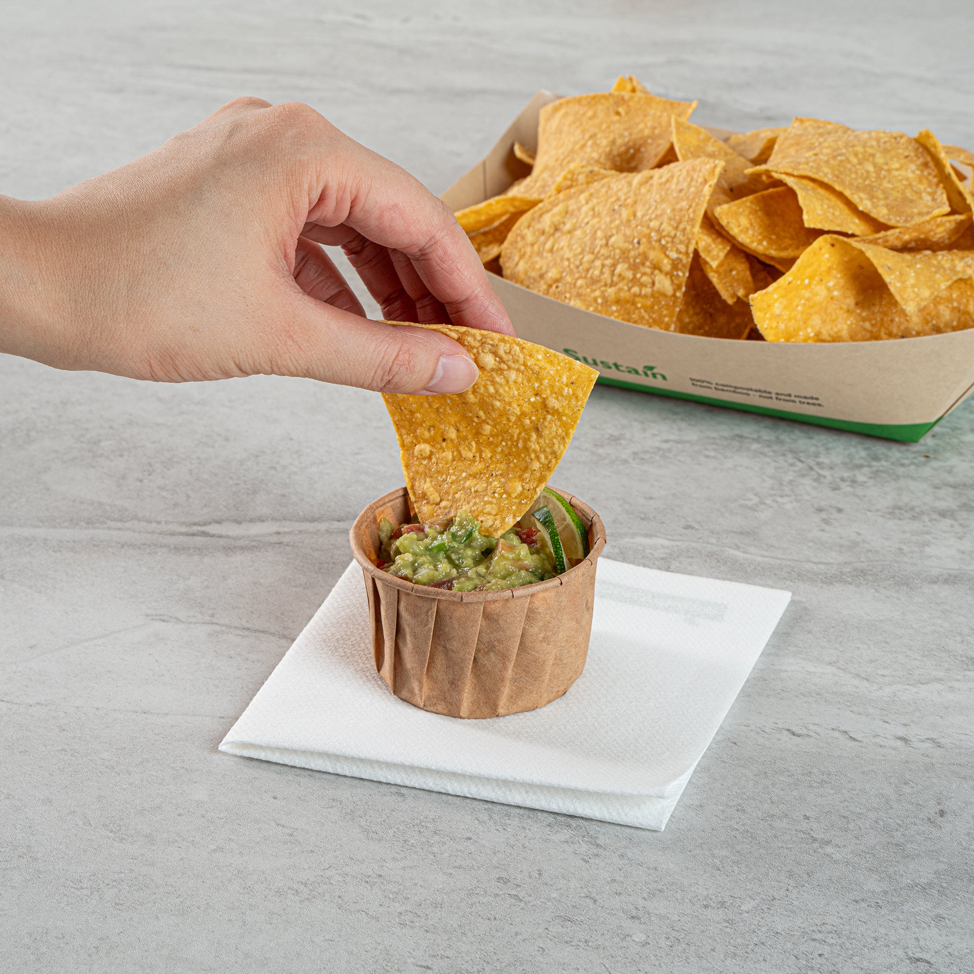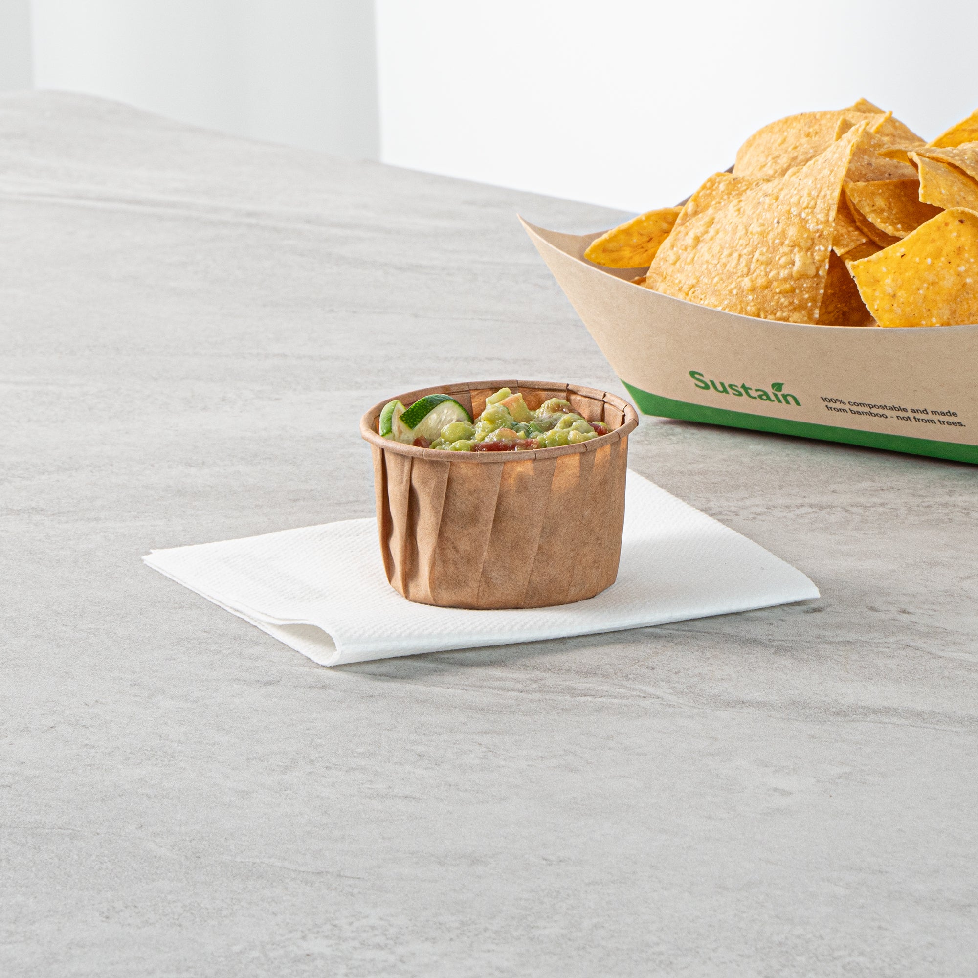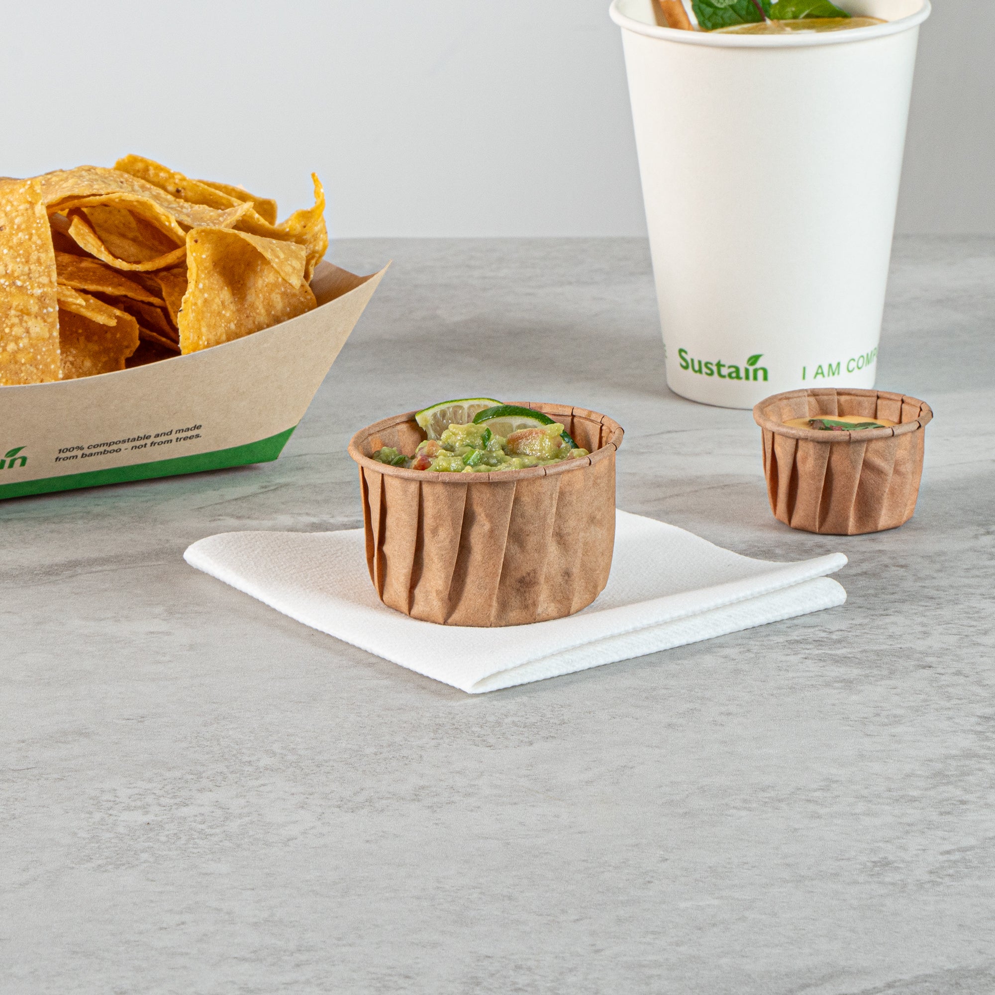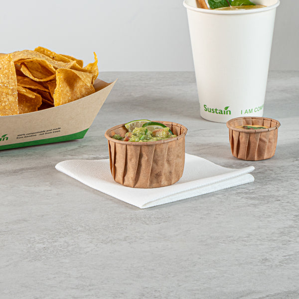 Elevate your food offerings with our Sustain 3.25-ounce Kraft Paper Portion Cups. These commercially compostable and biodegradable paper condiment cups provide an environmentally-conscious alternative to traditional plastic options. Crafted from premium paper, these condiment cups are designed to withstand thick barbecue sauce, chunky salsa, and more. Perfect for serving samples, these paper ketchup cups are versatile and a fantastic choice for events, tastings, and food promotions. The kraft finish of these paper sauce cups enhances your food presentation, adding a rustic charm. For hassle-free cleanup, these disposable sauce cups can be easily tossed after use. Measuring 2.48 inches in diameter by 1.61 inches in height, these ketchup cups offer a 3.25-ounce capacity, making them ideal for various condiments. Sold in a 100 count box. These items will only degrade outside of the traditional solid waste stream.