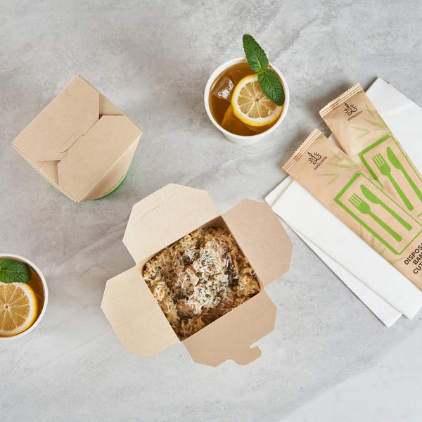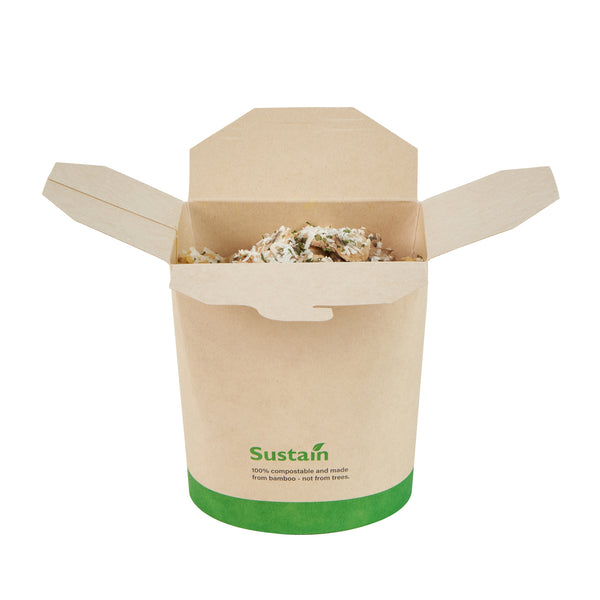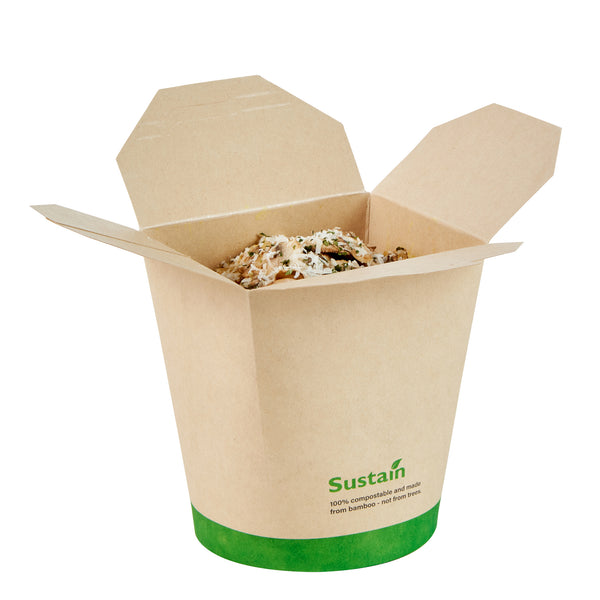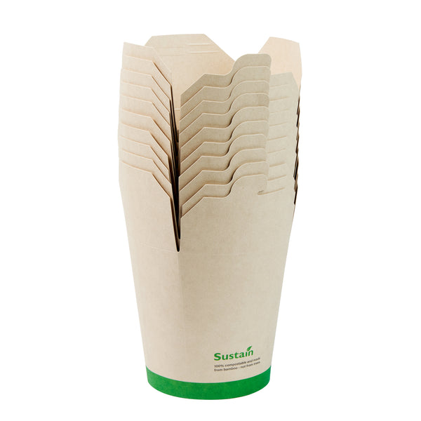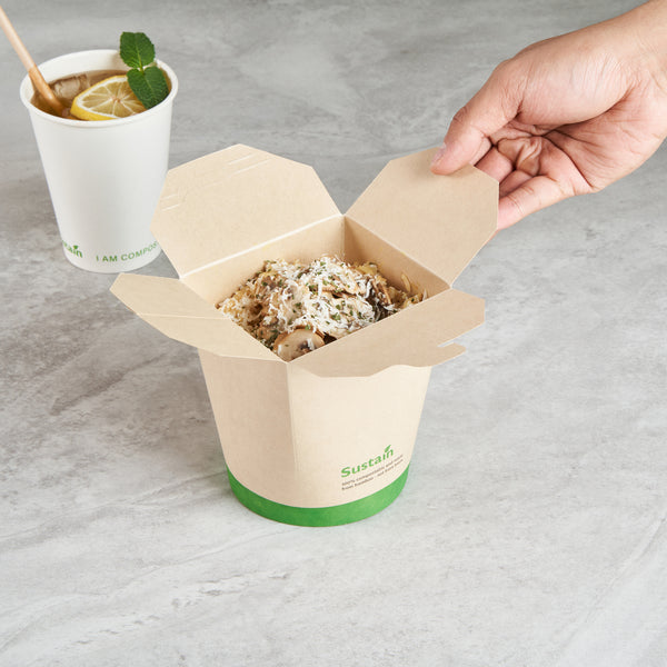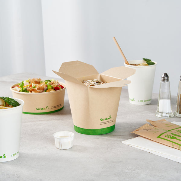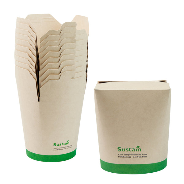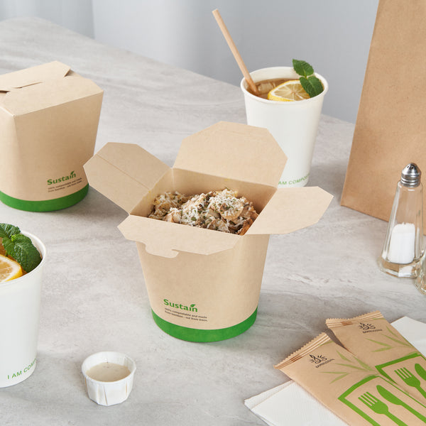 Ensure eco-friendly meal delivery with reliable leak resistance. The Sustain Leak-Resistant Noodle Take Out Container features a PLA lining that prevents leaks, ensuring hassle-free transport and maintaining the integrity of your dishes. With a tab-lock closure, this kraft takeout container secures meals during delivery, reducing the risk of spills and keeping food intact. Made from sustainable, commercially compostable paper, it supports environmentally-conscious practices and simplifies disposal. Measuring 4 inches in length, 3.5 inches in width, and 4.5 inches in height, this 32 oz takeout container offers ample space for hearty meals, while its kraft color adds a rustic aesthetic to your packaging. Trust in its biodegradable and greaseproof properties to enhance your foodservice operations with both practicality and sustainability. Each order includes 50 Sustain Leak-Resistant Noodle Take Out Containers.
