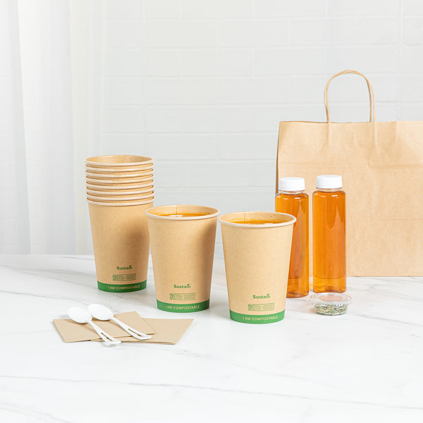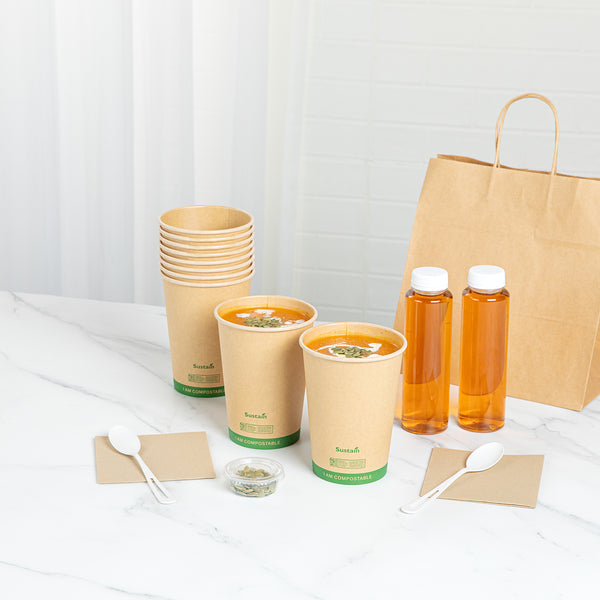 Effortlessly serve your customers their favorite soups with our Sustain 32-ounce Round Kraft Paper Soup Containers. These BPI-certified commercially compostable paper food cups help reduce waste and minimize your carbon footprint. The leak-resistant design of these take out soup bowls prevents messes, ensuring safe transportation of soups, stews, and noodles at any temperature. Suitable for both hot and cold foods, this durable paper food cup is perfect for versatile menu offerings. These hot food paper cups are stackable, providing easy storage for busy kitchens. Measuring 4.53 inches in diameter by 5.79 inches in height, these kraft soup containers accommodate a generous 32-ounce capacity. Sold in a 200 count box.