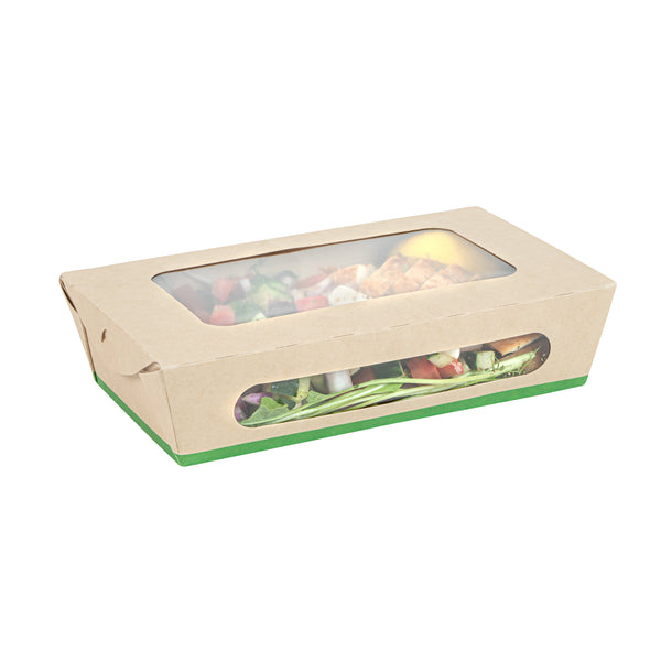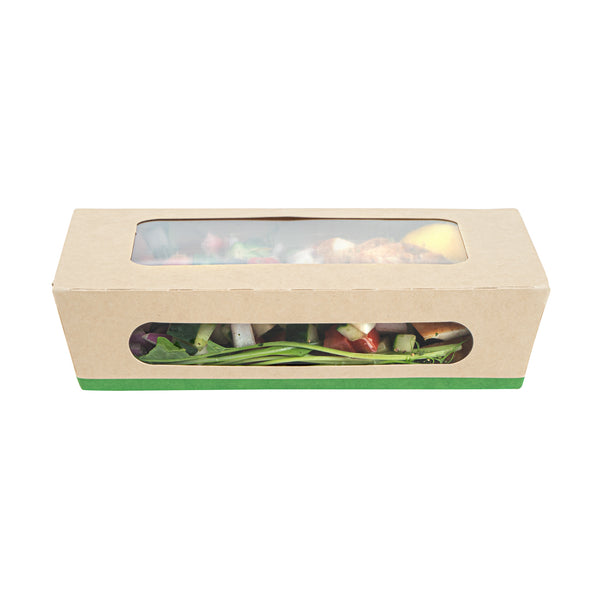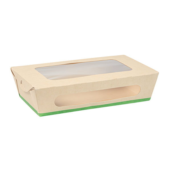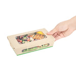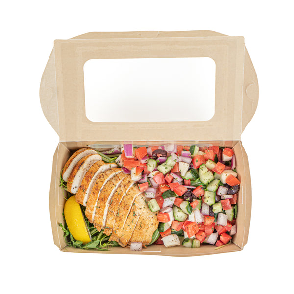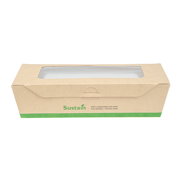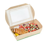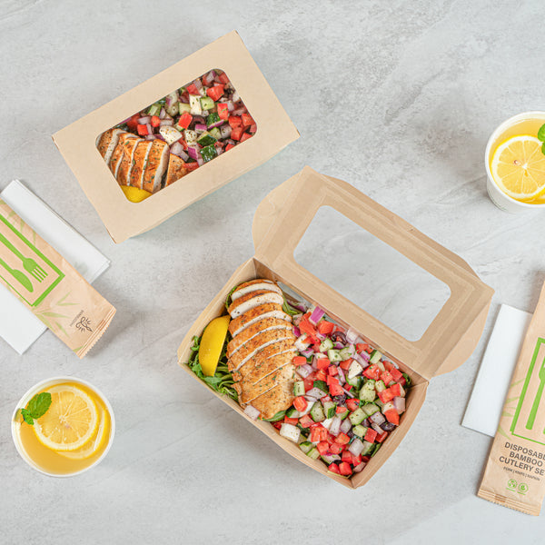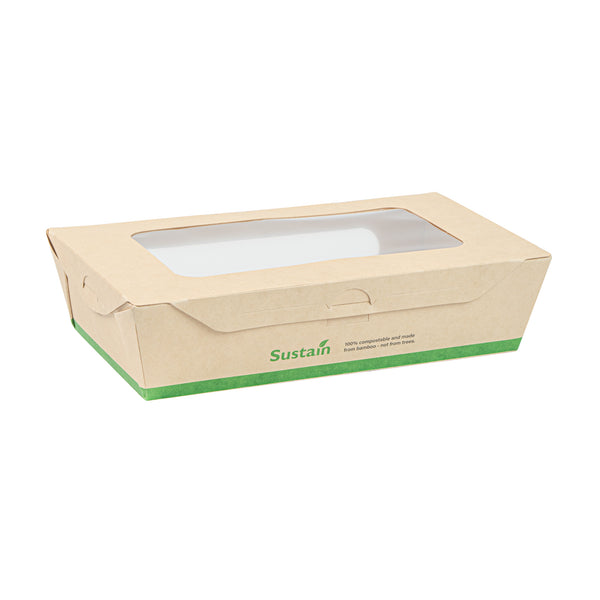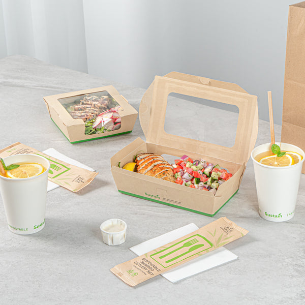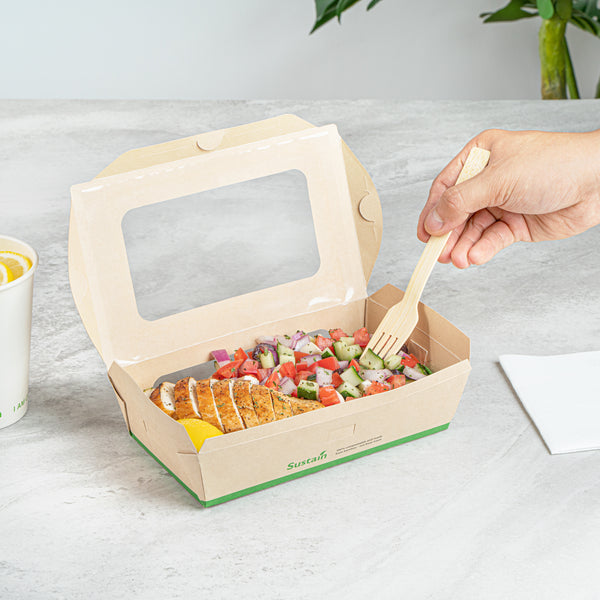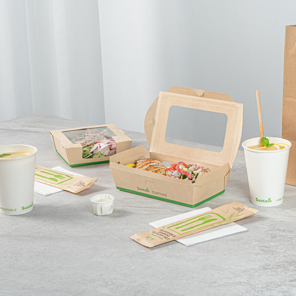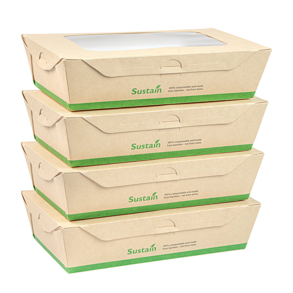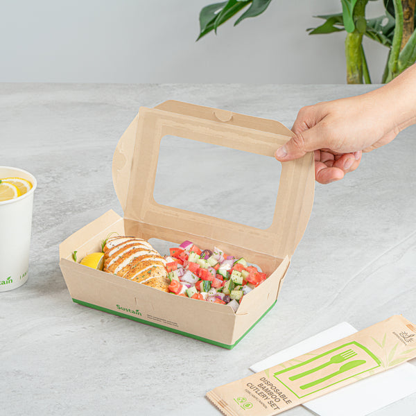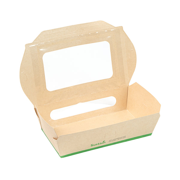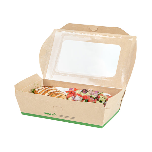Elevate your takeout service with eco-friendly, reliable packaging. Sustain Leak-Resistant Kraft Paper Take Out Boxes feature a PLA lining that prevents leaks and ensures mess-free service, making them an ideal choice for take out boxes. The clear PLA windows provide enhanced visibility, allowing customers to easily view their delicious meals, which is essential for any compostable food container. Crafted from sustainable paper, these boxes are commercially compostable, supporting eco-friendly disposal and appealing to environmentally conscious diners. Measuring 7.9 inches in length, 4.7 inches in width, and 2 inches in height, they offer a convenient capacity of 35 ounces, making them perfect for a variety of meals. The kraft paper construction is not only greaseproof but also biodegradable, providing a dependable and sustainable option for any disposable lunch box need. Sold in a 200 count box.