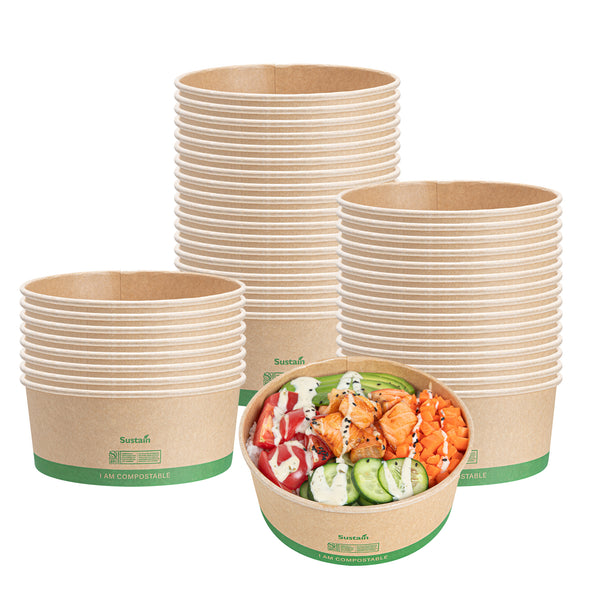 Our Sustain 37-ounce Round Kraft Paper Take Out Containers are the sustainable choice for your foodservice needs. These BPI-Certified salad bowls are commercially compostable, contributing to reducing waste and minimizing your carbon footprint. With a grease-resistant PLA lining, these paper meal prep bowls ensure a neat food presentation by stopping oil from soaking through. Designed for convenience, these kraft food containers are stackable, allowing for easy storage in busy kitchens. Apt for transporting meals, these to go containers are suitable for salads, pastas, and ice creams. Measuring 6.46 inches in diameter by 2.56 inches in height, these takeaway boxes boast a generous 37-ounce capacity to accommodate large servings. Sold in a 200 count box.