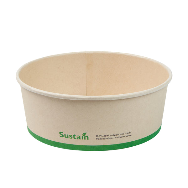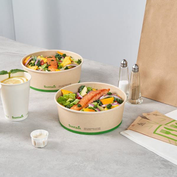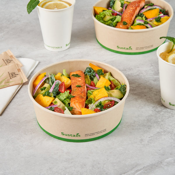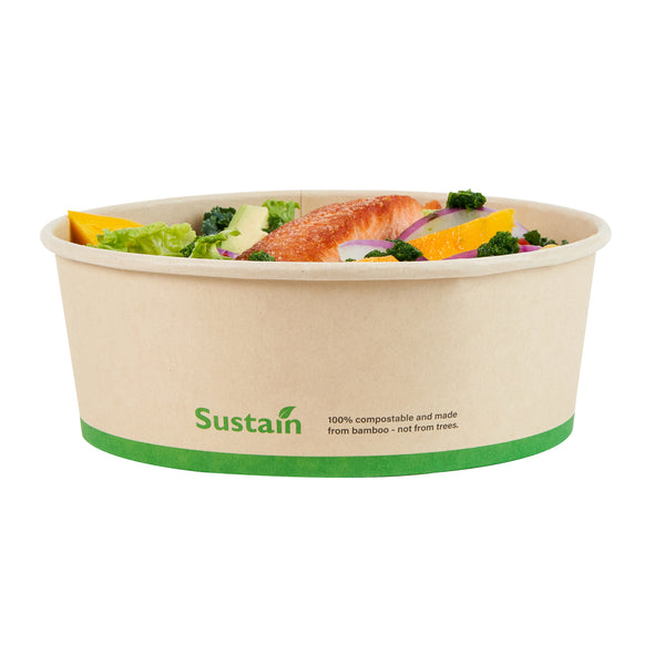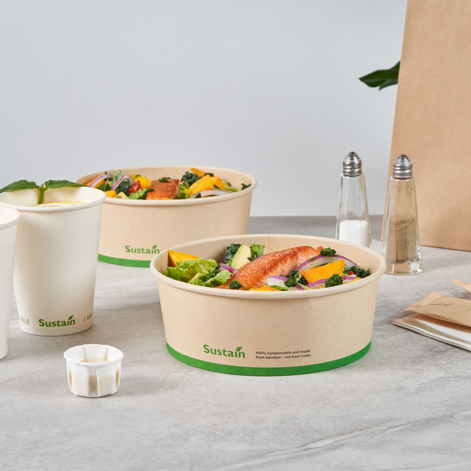 Ensure eco-friendly foodservice with reliable leak prevention. Sustain Leak-Resistant Compostable Salad Bowls offer a dependable solution with a PLA lining that prevents leaks, ensuring mess-free transport for your takeout orders. These sturdy bowls, measuring 7.3 inches by 7.3 inches by 2.4 inches, feature robust walls that provide secure packaging, making them ideal for on-the-go customers who rely on consistent and efficient service. Crafted from sustainable paper, these bowls are commercially compostable, supporting eco-friendly disposal and aligning with the growing demand for biodegradable takeout bowls. Enhance your operations with these round bamboo paper bowls, which combine functionality with sustainability. Elevate your establishment’s commitment to the environment while maintaining the quality of service with this compostable salad bowl. Each order includes 200 Sustain Leak-Resistant Compostable Salad Bowls.
