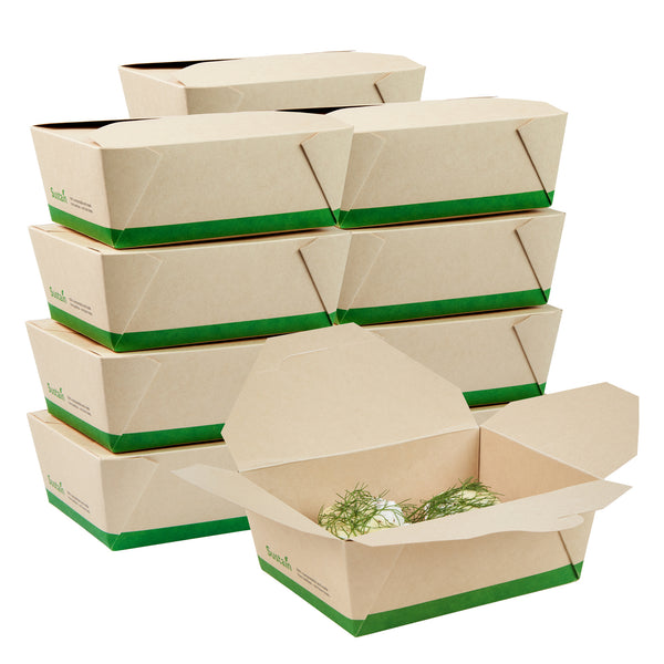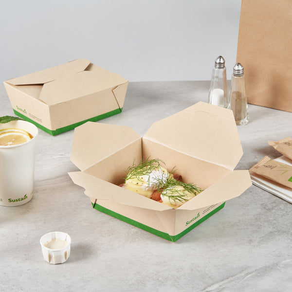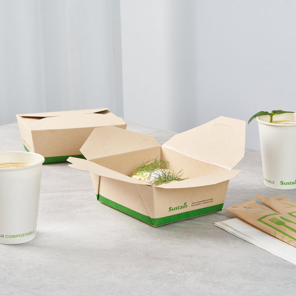 Ensure secure meal delivery with our Sustain Leak-Resistant Kraft Paper Takeout Container. Designed with a robust PLA lining, this takeout container effectively prevents leaks, ensuring a mess-free service for your patrons. The convenient tab-lock closure keeps meals intact during transport, making it an ideal to-go box for restaurants and catering businesses focused on maintaining meal presentation. Crafted from sustainably sourced paper, these disposable food containers are commercially compostable, supporting eco-friendly disposal practices and appealing to environmentally conscious consumers. Measuring 6.75 inches in length, 5.5 inches in width, and 2.6 inches in height, each container accommodates up to 45 ounces, providing ample space for various dishes. Enhance your service with reliable, biodegradable packaging that aligns with your sustainability goals. Each order includes 200 Sustain Leak-Resistant Kraft Paper Takeout Containers.