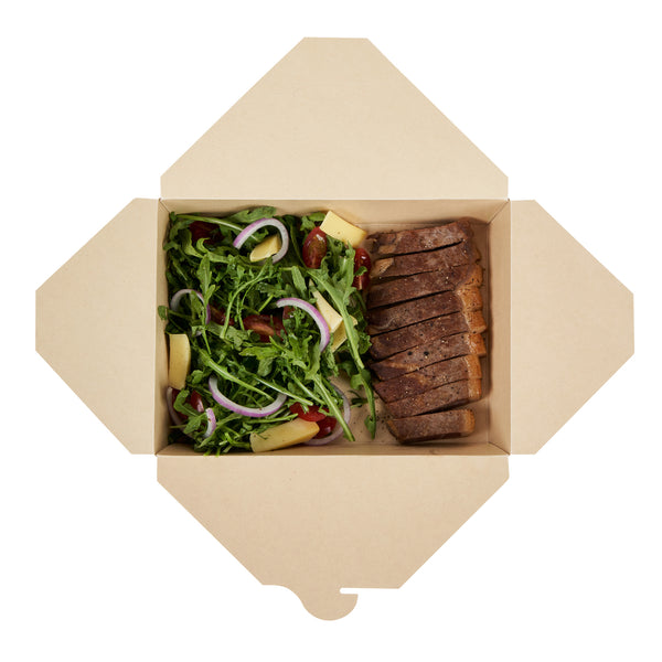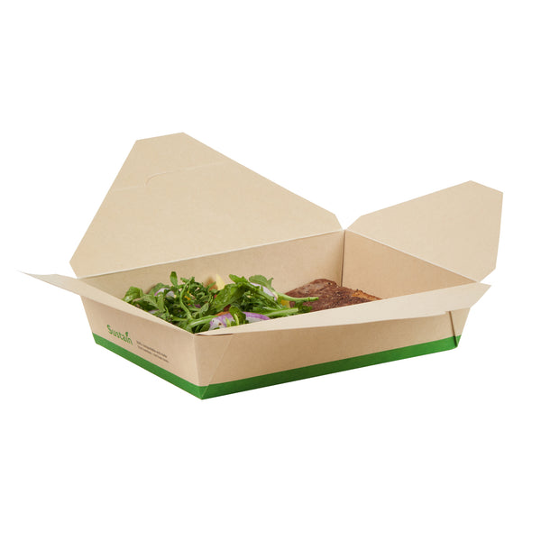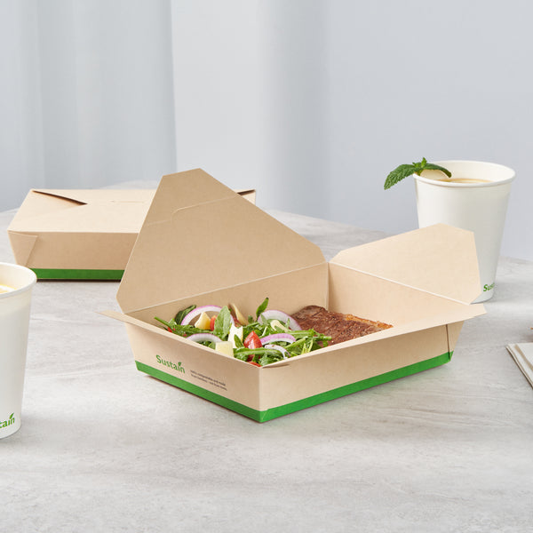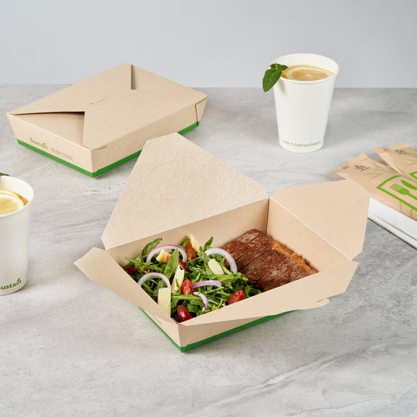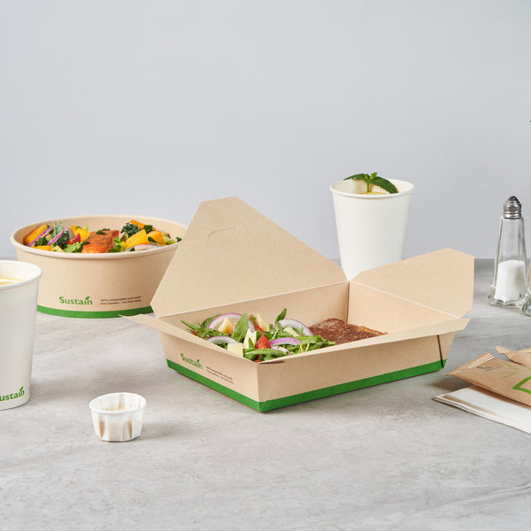 Ensure eco-friendly meal transport with leak-proof efficiency. The Sustain Leak-Resistant Biodegradable Takeout Container features a PLA lining that prevents leaks, ensuring mess-free service for your food establishment. Designed with a secure tab-lock closure, this biodegradable takeout container keeps meals intact during transport, offering a hassle-free experience for your customers. Crafted from sustainable paper, this container is commercially compostable, allowing for responsible disposal in composting facilities. With dimensions of 8.5 inches in length, 6.2 inches in width, and 1.9 inches in height, this compostable to-go box is perfect for packaging a variety of meals, from salads to entrees. Ideal for restaurants seeking environmentally conscious solutions, this takeout box is also greaseproof, providing reliable protection against oil and sauce spills. Enhance your foodservice operations with this kraft-colored container that combines functionality and sustainability. Each order includes 200 Sustain Leak-Resistant Biodegradable Takeout Containers.