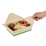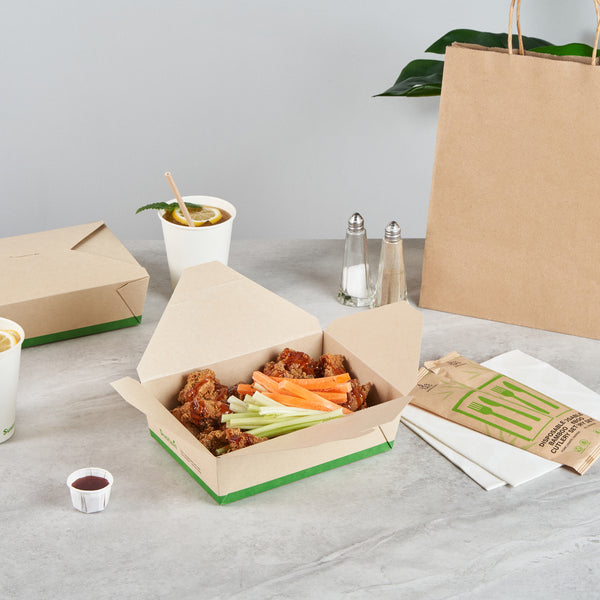 Ensure seamless meal delivery with our Sustain Leak-Resistant Takeout Boxes. These takeout boxes feature a PLA lining that prevents leaks, ensuring a smooth experience and maintaining the integrity of your culinary creations. The tab-lock closure is designed to secure meals during transport, offering clean delivery and peace of mind for busy foodservice operations. Made from sustainable paper, these biodegradable takeout boxes are commercially compostable, providing an eco-friendly disposal option that supports your commitment to the environment. With dimensions of 8.5 inches in length, 6.2 inches in width, and 2.6 inches in height, these compostable food containers are perfect for a wide range of dishes. Elevate your takeout service with these reliable and sustainable solutions. Each order includes 200 Sustain Leak-Resistant Takeout Boxes.
