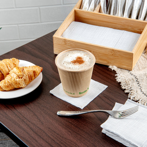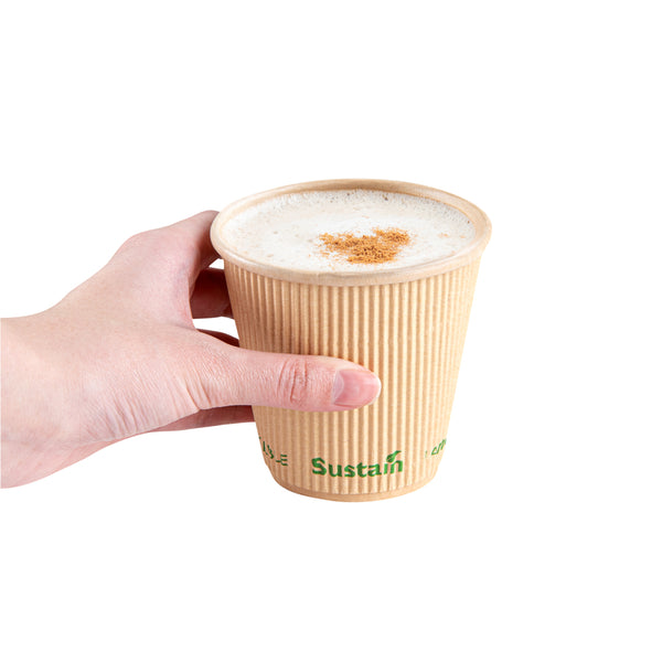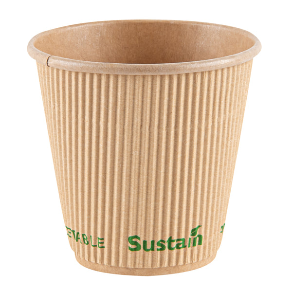 Elevate your beverage service with eco-conscious convenience. The Sustain 8 oz Kraft Paper Coffee Cup, crafted from durable kraft paper and measuring 3.5 inches in height, features a ripple wall design that keeps drinks insulated and warm, ensuring customer comfort without external sleeves. This compostable coffee cup is lined with PLA, offering an eco-friendly alternative to traditional plastic linings, supporting sustainable business practices. Its biodegradable build reinforces your commitment to environmental stewardship while maintaining its shape and integrity, preventing spills and leaks during use. Ideal for coffee shops and cafés, this ripple wall coffee cup fits standard 8-ounce lids, facilitating secure, on-the-go consumption. Additionally, these disposable coffee cups are freezer-safe, making them suitable for storing cold beverages, enhancing their versatility in catering and foodservice operations. Each order includes 500 cups.