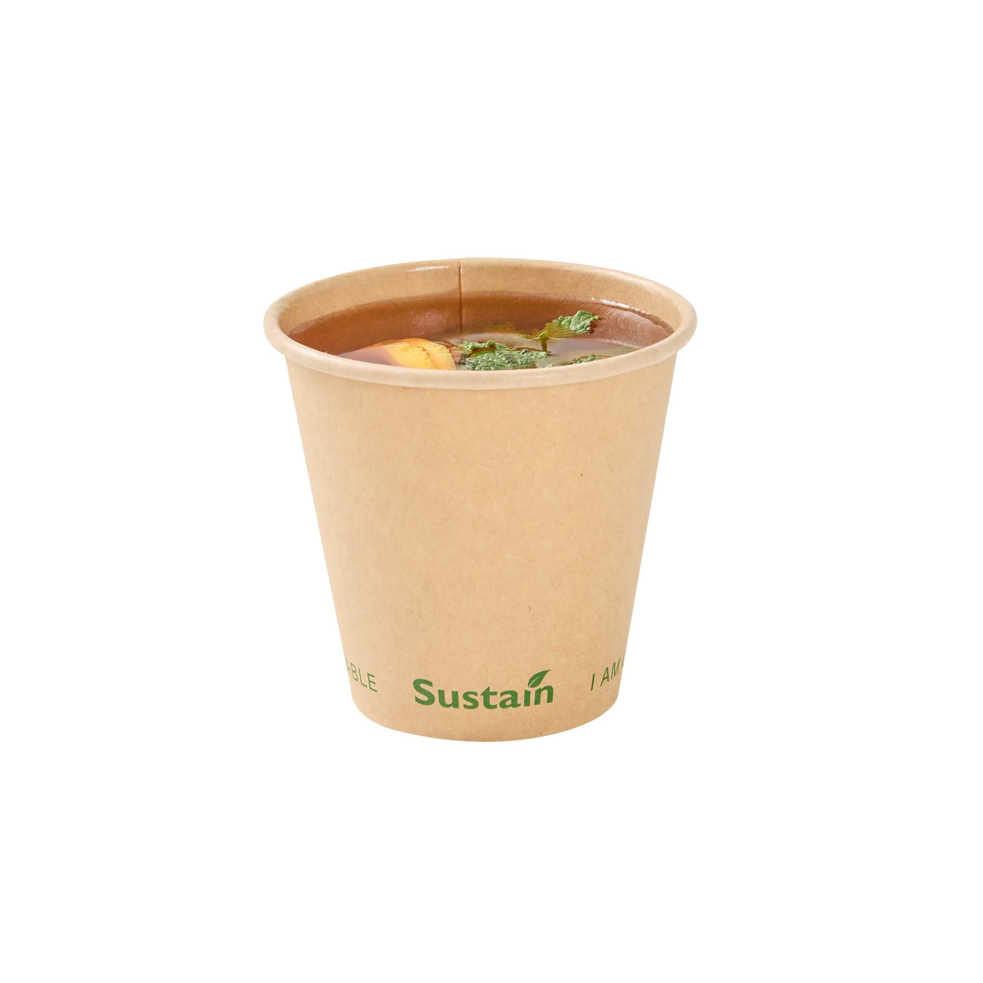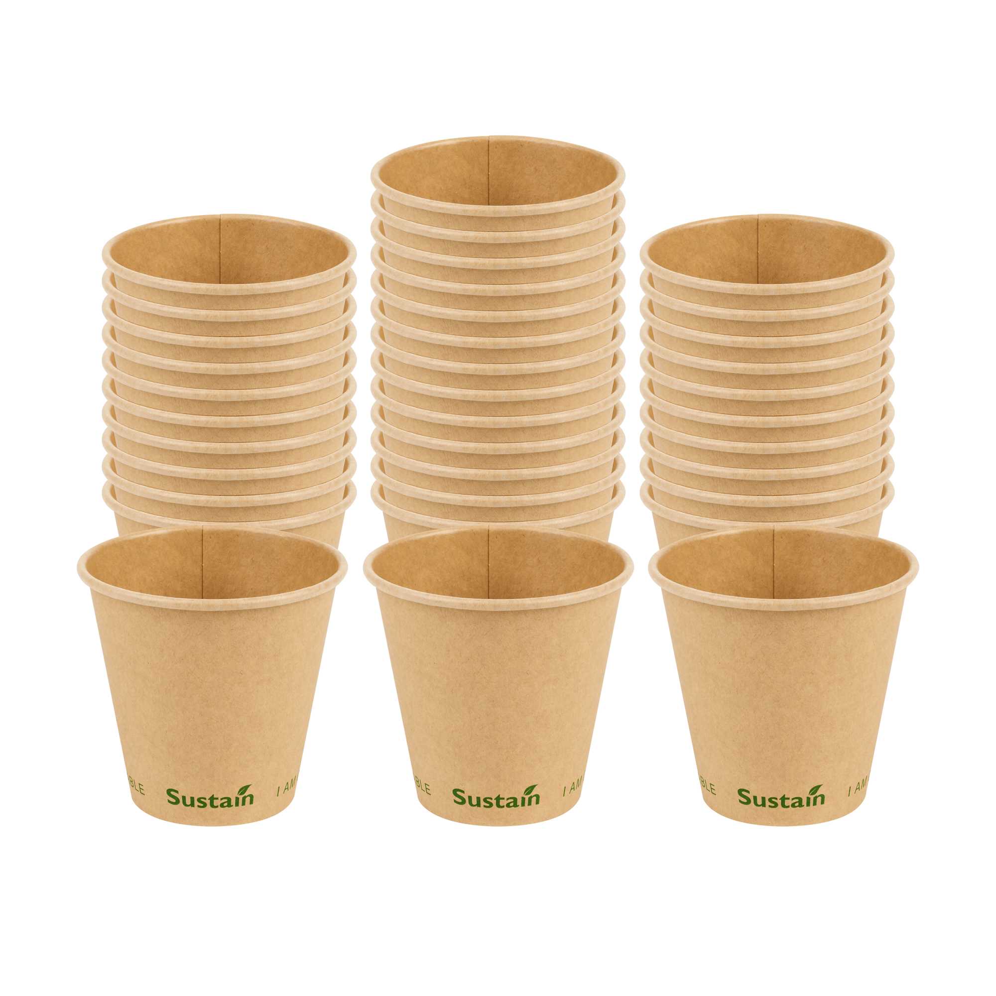 Ensure eco-friendly beverage service with every cup. The Sustain Compostable Coffee Cup combines a durable kraft paper exterior with a PLA lining, providing a leak-resistant barrier that keeps beverages secure without spills. This compostable coffee cup, certified by BPI, supports eco-friendly operations by breaking down naturally, leaving minimal residue and no harmful substances. Its single-wall design offers a lightweight and cost-effective solution, making this disposable coffee cup ideal for high-volume environments like coffee shops and catering events. The freezer-safe construction ensures quality is maintained for stored items, while its 8-ounce capacity meets customer expectations for standard servings of coffee and tea. With dimensions of 3.5 inches in top diameter and 3.3 inches in height, this pla lined coffee cup provides a natural, rustic aesthetic that enhances presentation. Choose this cold food friendly option to serve sandwiches and salads sustainably. Each order includes 1000 Sustain Compostable Coffee Cups.