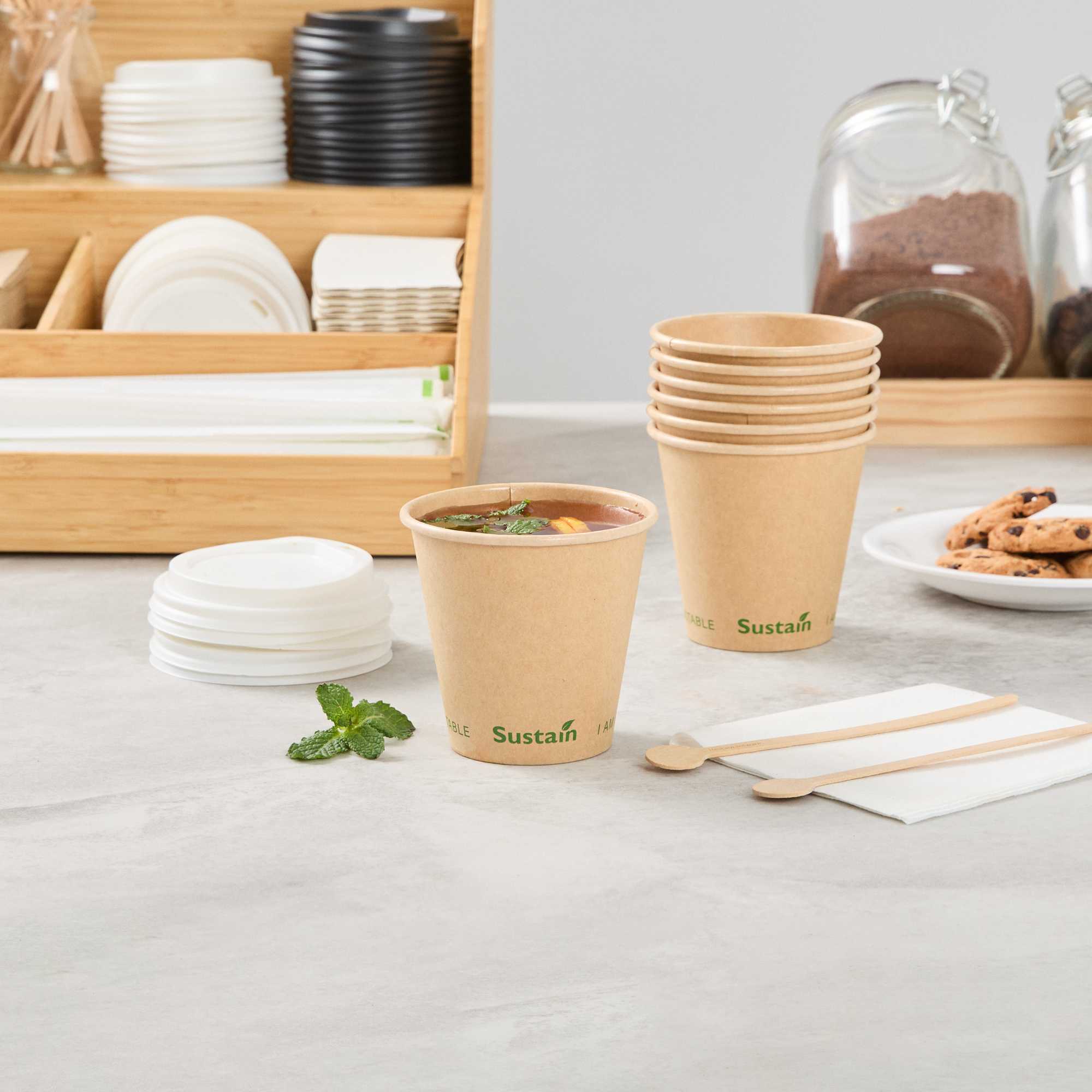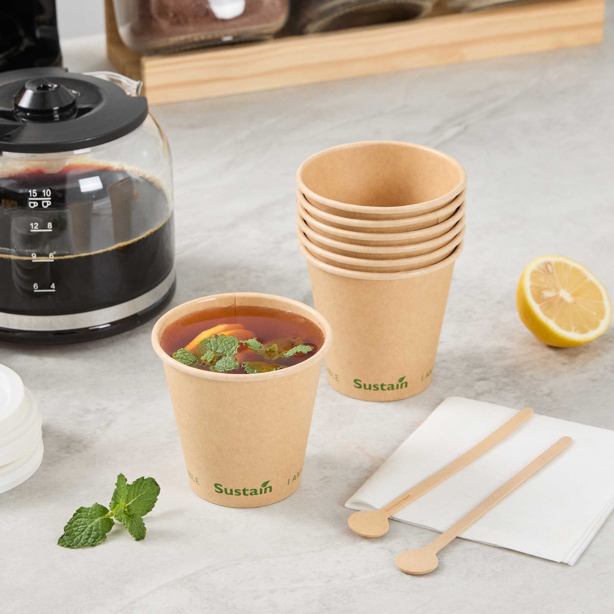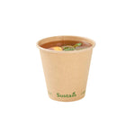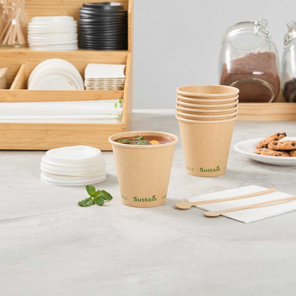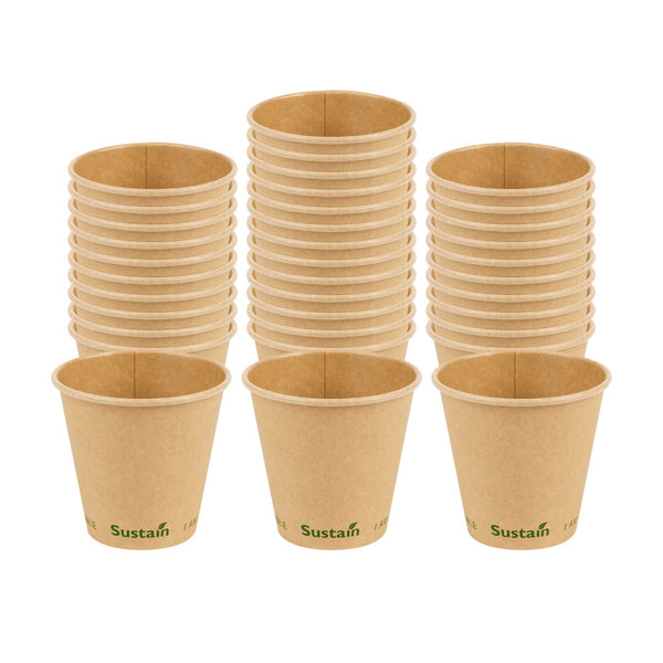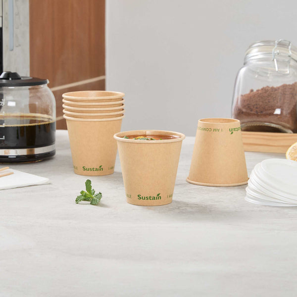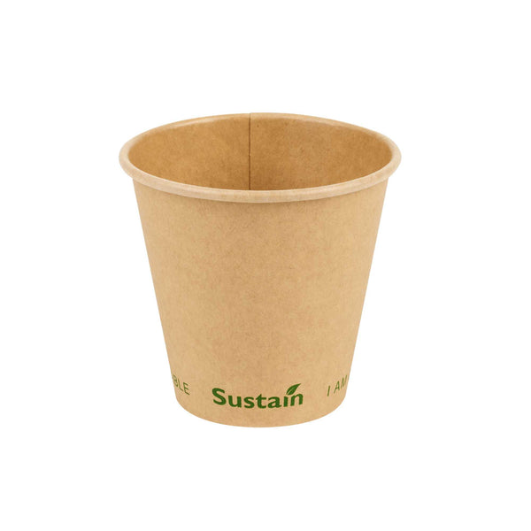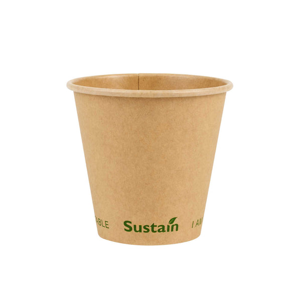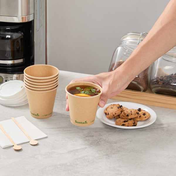 Ensure eco-friendly beverage service with every cup. The Sustain Compostable Coffee Cup combines a durable kraft paper exterior with a PLA lining, providing a leak-resistant barrier that keeps beverages secure without spills. This compostable coffee cup, certified by BPI, supports eco-friendly operations by breaking down naturally, leaving minimal residue and no harmful substances. Its single-wall design offers a lightweight and cost-effective solution, making this disposable coffee cup ideal for high-volume environments like coffee shops and catering events. The freezer-safe construction ensures quality is maintained for stored items, while its 8-ounce capacity meets customer expectations for standard servings of coffee and tea. With dimensions of 3.5 inches in top diameter and 3.3 inches in height, this pla lined coffee cup provides a natural, rustic aesthetic that enhances presentation. Choose this cold food friendly option to serve sandwiches and salads sustainably. Each order includes 50 Sustain Compostable Coffee Cups.