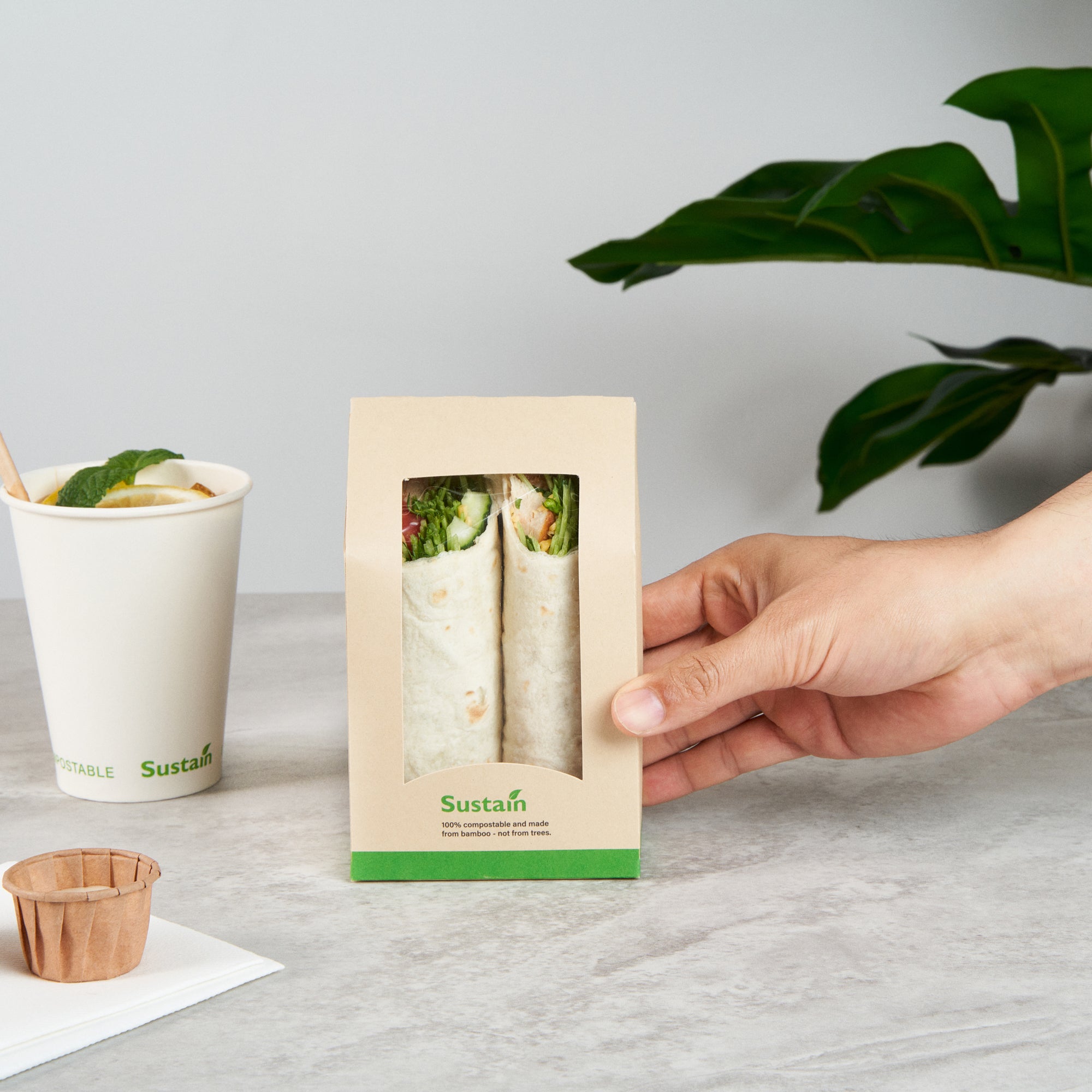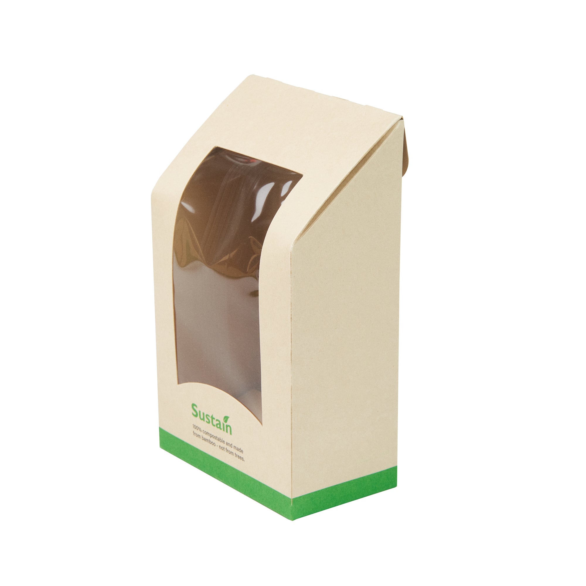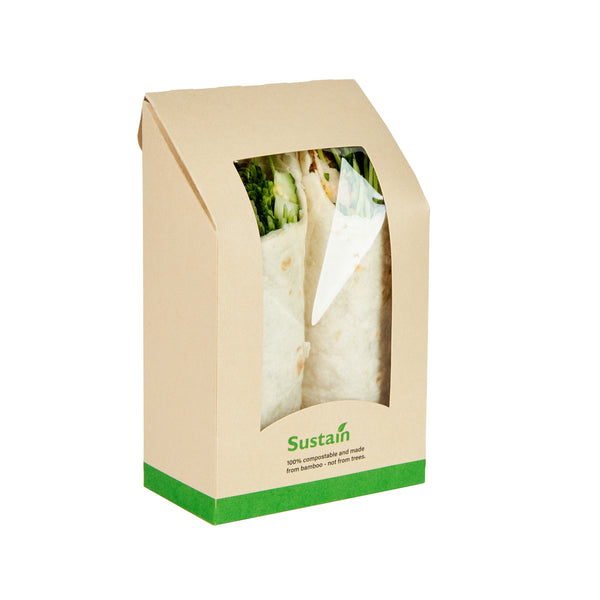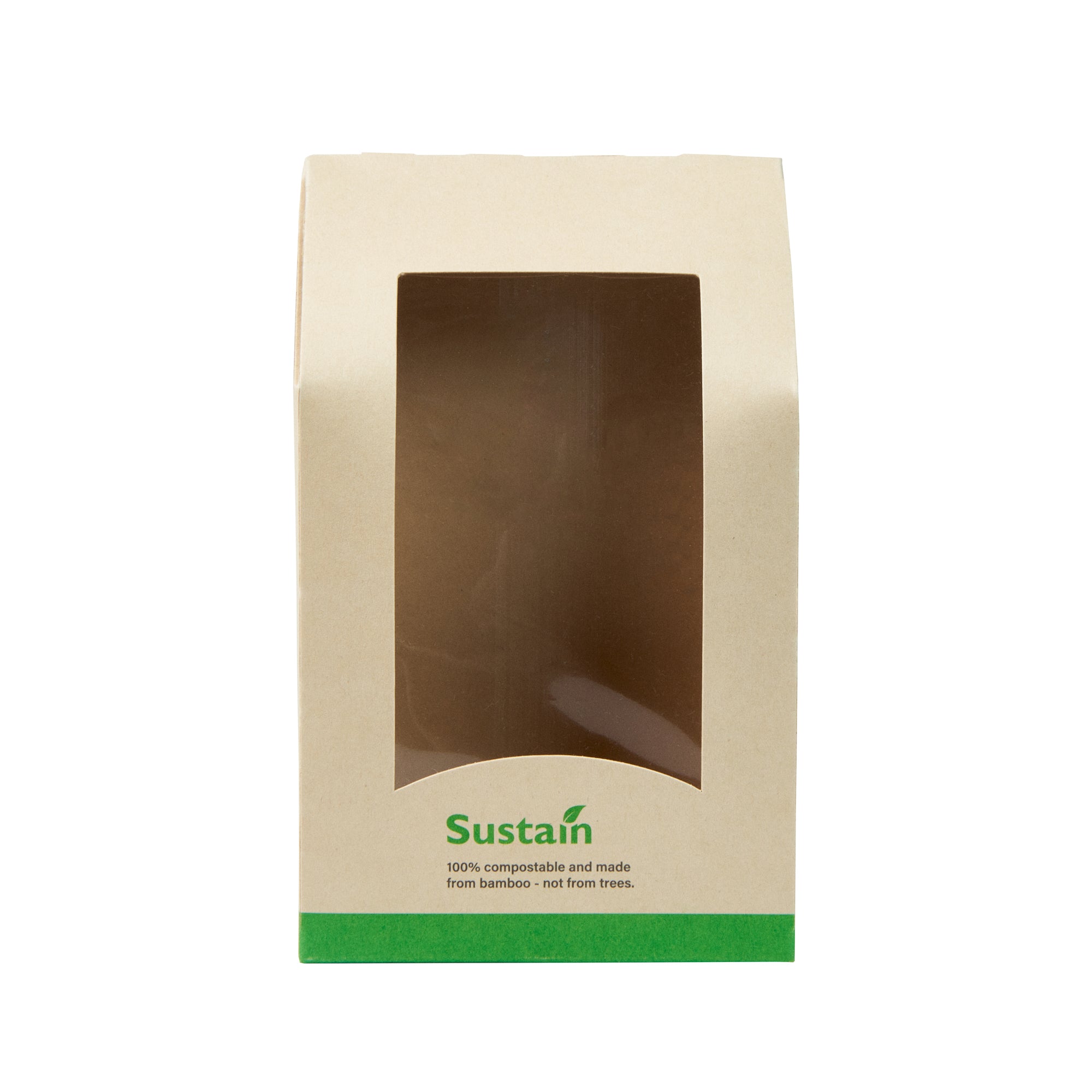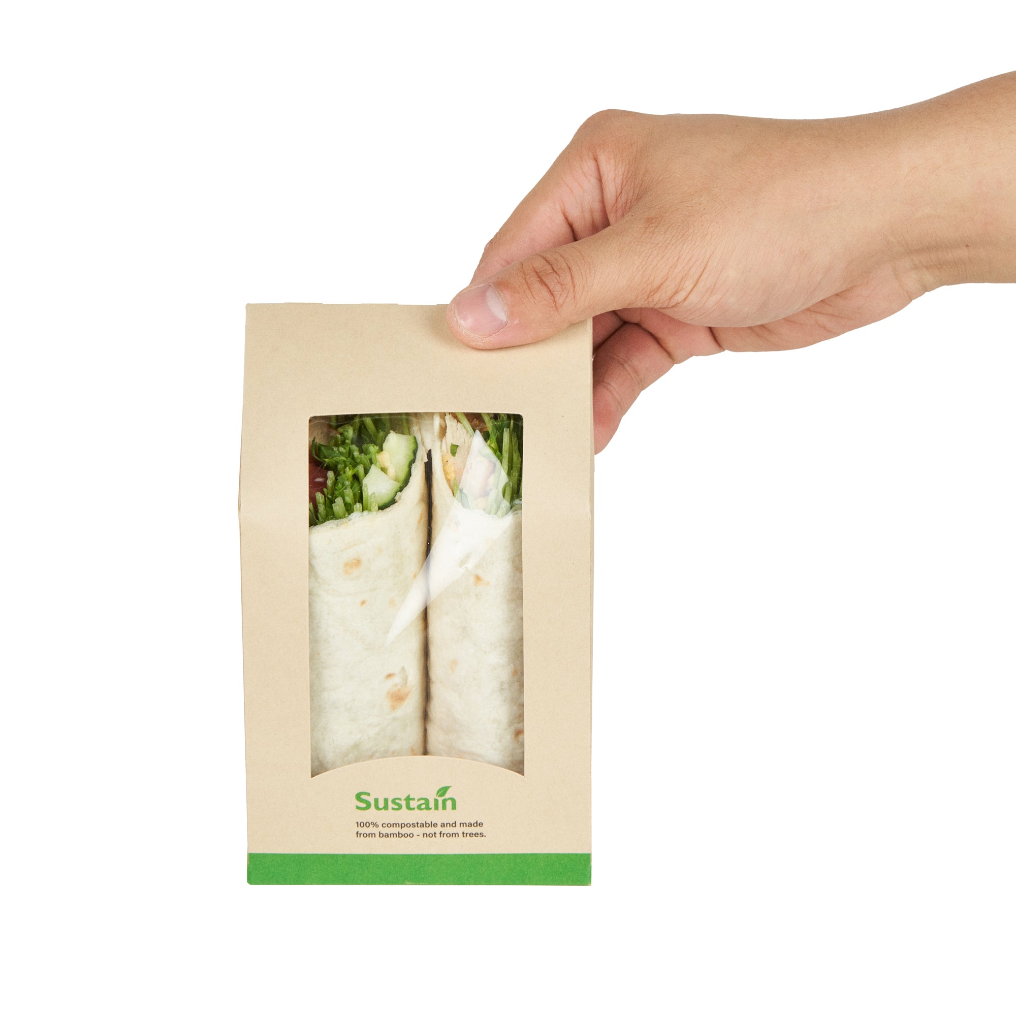 Ensure fresh, spill-free meals with eco-friendly packaging. The Sustain Leak-Resistant Take Out Food Container features a PLA lining that prevents leaks for hassle-free transport, making it an ideal take out food container for busy restaurants and cafes. With its clear window, this biodegradable take out box allows customers to easily view the contents, enhancing presentation and boosting impulse sales. Crafted from compostable paper, this container ensures eco-friendly disposal after use, supporting your establishment's sustainability initiatives. Measuring 5.9 inches in length, 3.7 inches in width, and 2.1 inches in height, this compostable sandwich container is perfect for delis and sandwich shops looking to package fresh, delicious wraps and sandwiches. The natural kraft color of this container complements any branding, while the sturdy bamboo paper construction holds up during delivery and transport. Choose this reliable and sustainable solution to meet the needs of environmentally conscious diners. Each order includes 200 Sustain Leak-Resistant Take Out Food Containers.