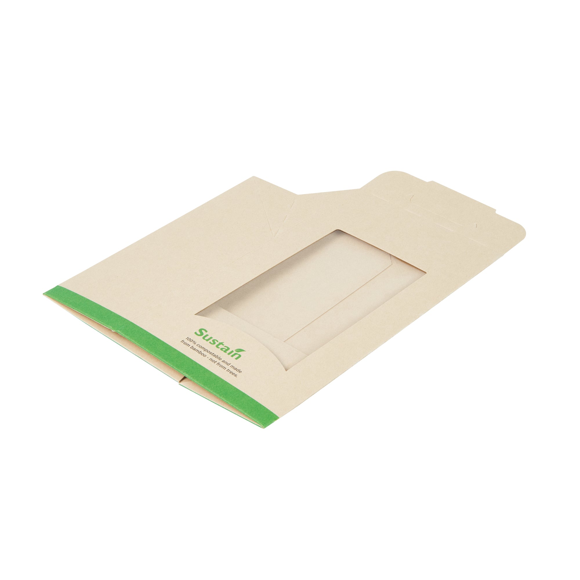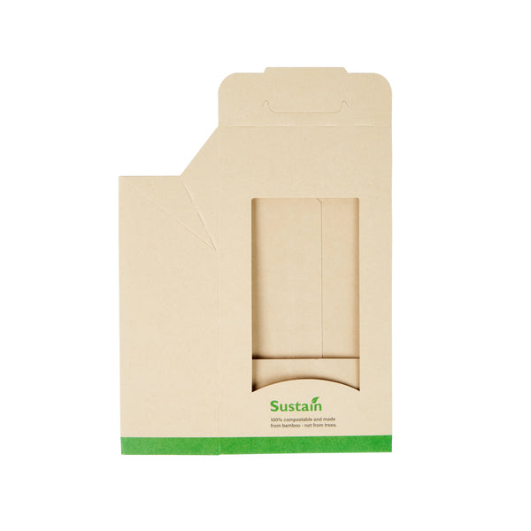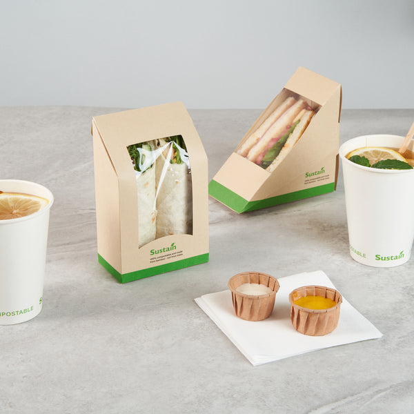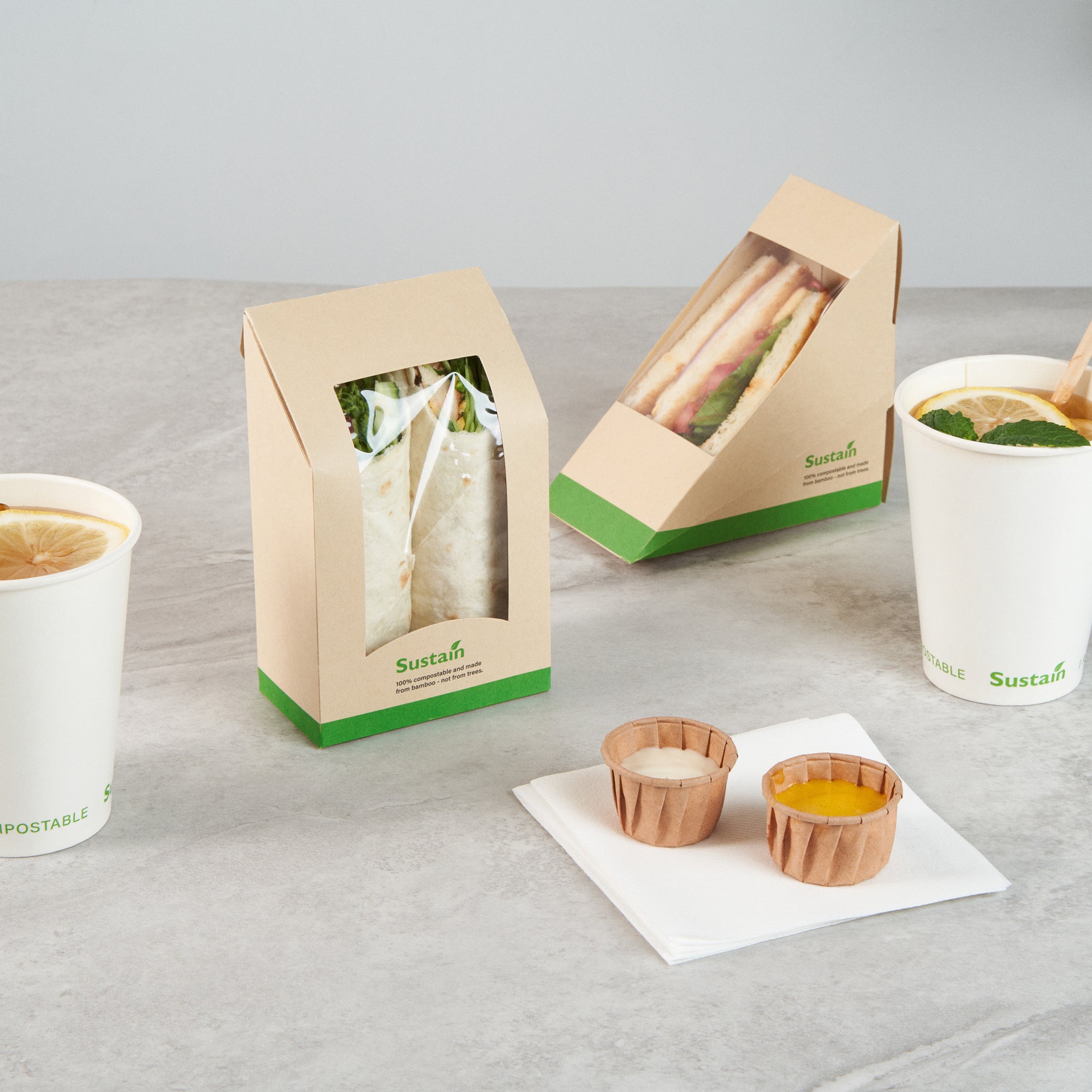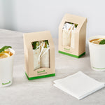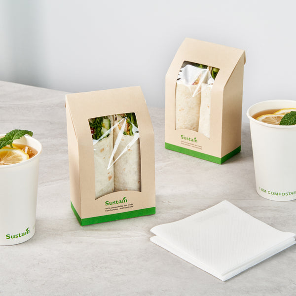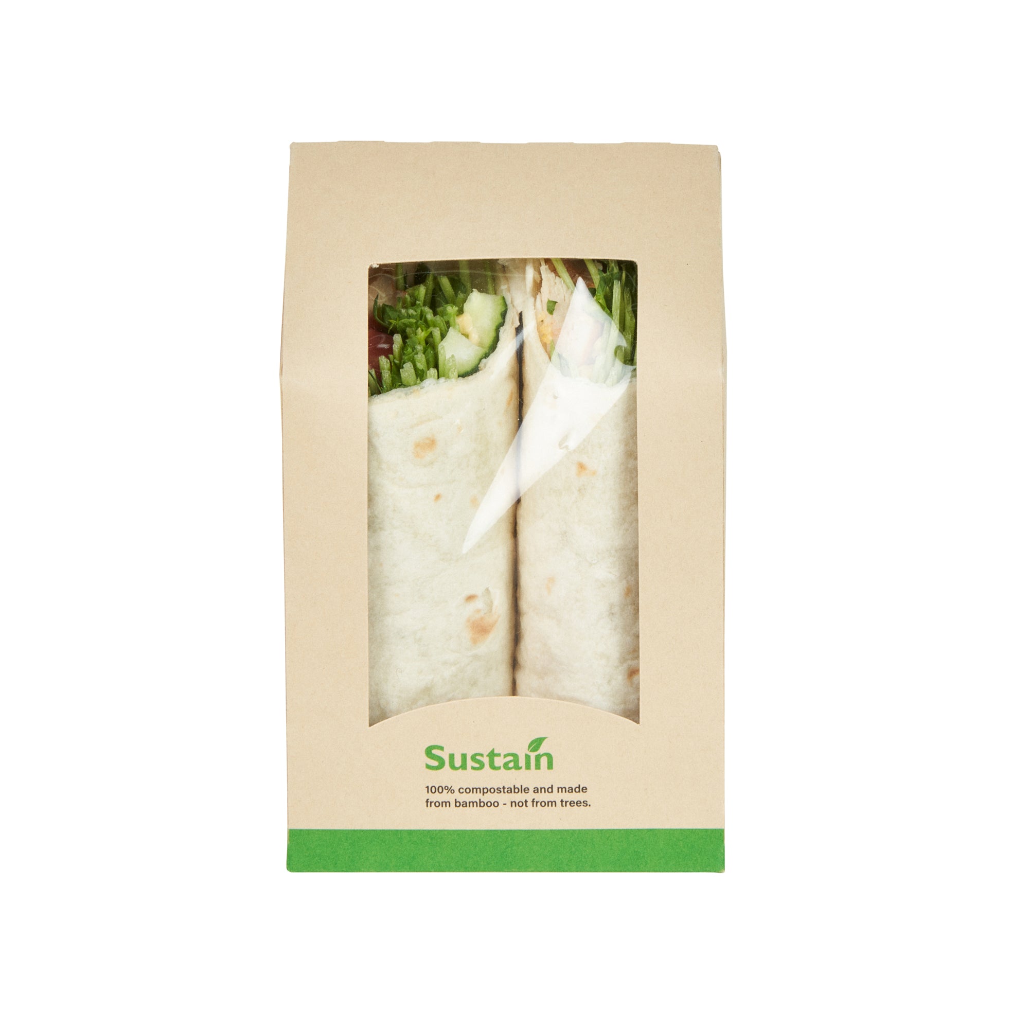 Ensure fresh, spill-free meals with eco-friendly packaging. The Sustain Leak-Resistant Take Out Food Container features a PLA lining that prevents leaks for hassle-free transport, making it an ideal take out food container for busy restaurants and cafes. With its clear window, this biodegradable take out box allows customers to easily view the contents, enhancing presentation and boosting impulse sales. Crafted from compostable paper, this container ensures eco-friendly disposal after use, supporting your establishment's sustainability initiatives. Measuring 5.9 inches in length, 3.7 inches in width, and 2.1 inches in height, this compostable sandwich container is perfect for delis and sandwich shops looking to package fresh, delicious wraps and sandwiches. The natural kraft color of this container complements any branding, while the sturdy bamboo paper construction holds up during delivery and transport. Choose this reliable and sustainable solution to meet the needs of environmentally conscious diners. Each order includes 200 Sustain Leak-Resistant Take Out Food Containers.