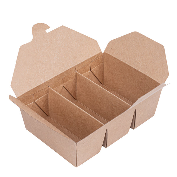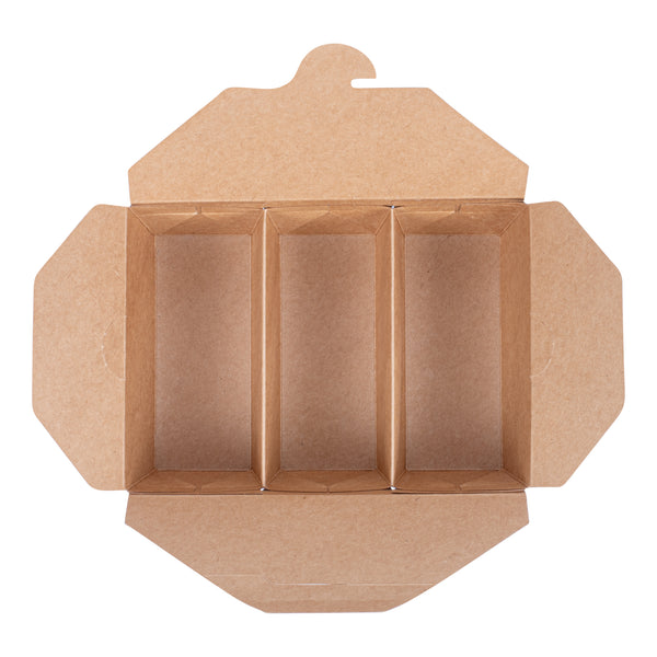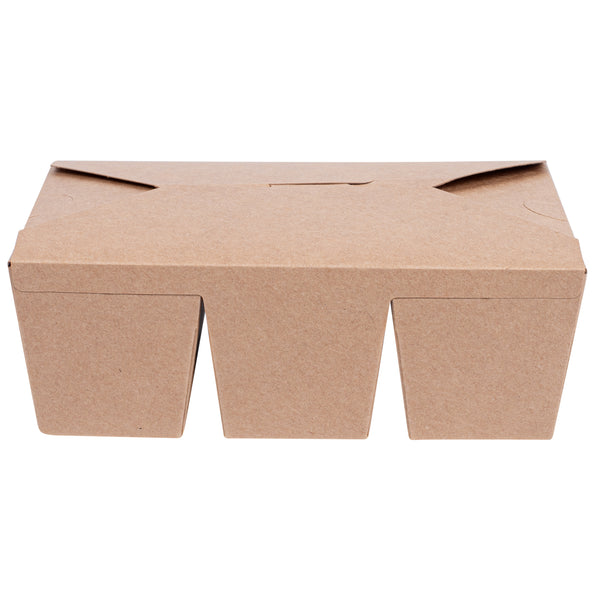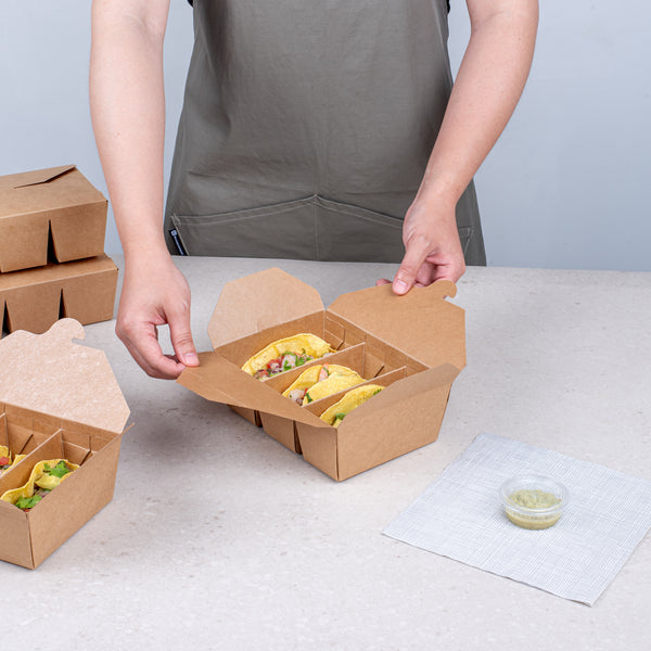 Keep your tacos and sides perfectly organized with our Sustain Kraft Paper Taco Take out Containers. Designed with 3 separate compartments, these take out boxes ensure that tacos, sides, and sauces stay divided for a mess-free presentation. The interior features a PLA lining, providing added durability and leak protection, making these taco containers ideal for both saucy dishes and dry cold foods. A reliable tab lock lid keeps your meals secure during delivery, making these take out food containers an excellent choice for safe transport. Crafted from compostable kraft paper, these takeaway boxes are an eco-conscious solution that helps reduce your environmental impact. Measuring 7.5 inches in length by 5.5 inches in width by 2 inches in height, these containers easily hold three tacos or hot dogs. Sold in a 100 count box.