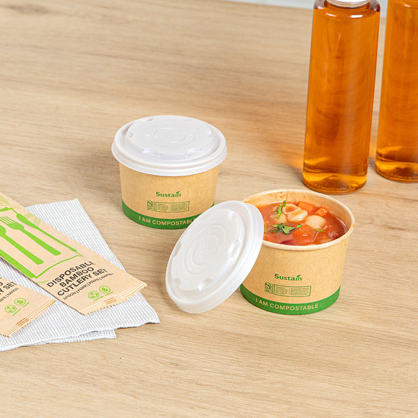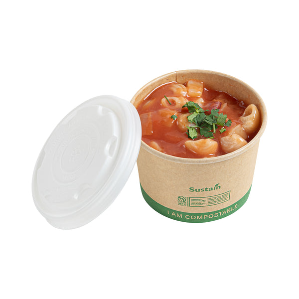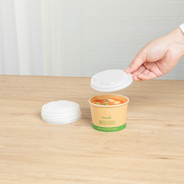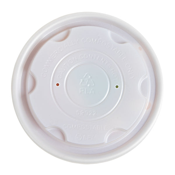 Ensure leakproof delivery with our eco-friendly compostable lid. The Sustain Compostable Lid provides a secure fit to prevent spills during transport, making it an ideal choice for foodservice professionals who prioritize both functionality and sustainability. Crafted from PLA plastic, this plastic food cup lid is commercially compostable, aligning with green initiatives and supporting your establishment's commitment to reducing environmental impact. With the ability to withstand temperatures up to 200 degrees Fahrenheit, this disposable hot cup lid ensures safe handling of hot soups and beverages. The vented design allows steam to escape, preserving the freshness of your culinary creations while maintaining the lid's integrity on 8-ounce containers with a diameter of 3.54 inches. Enhance your restaurant's eco-conscious packaging solutions with this sustainable lid, and experience the seamless integration of practicality and responsibility. Each order includes 200 Sustain Compostable Lids.