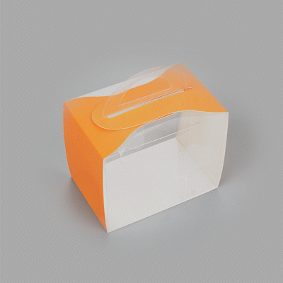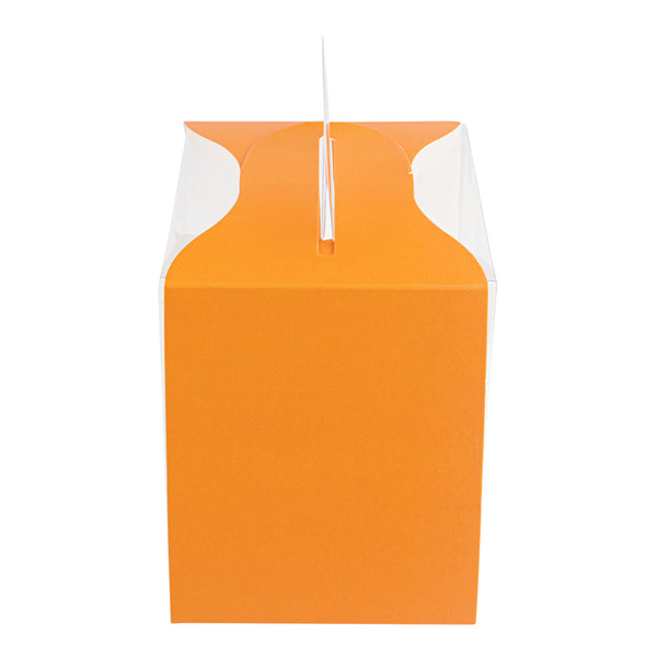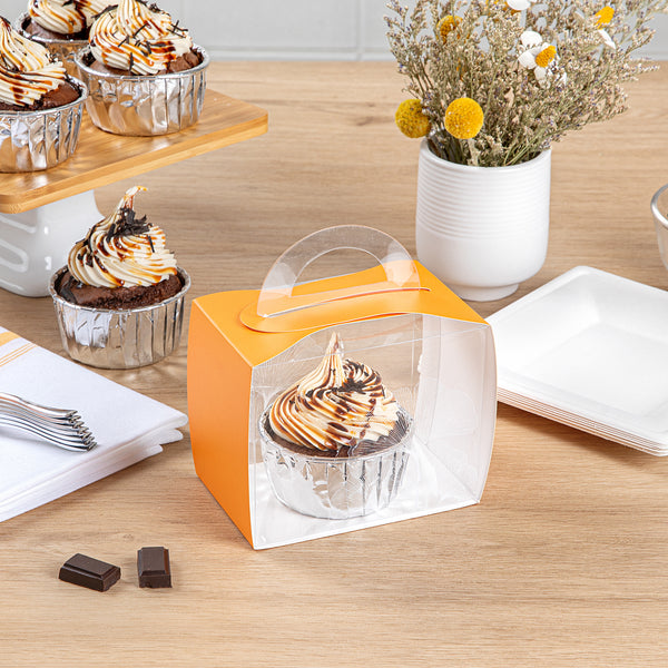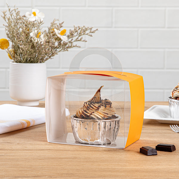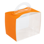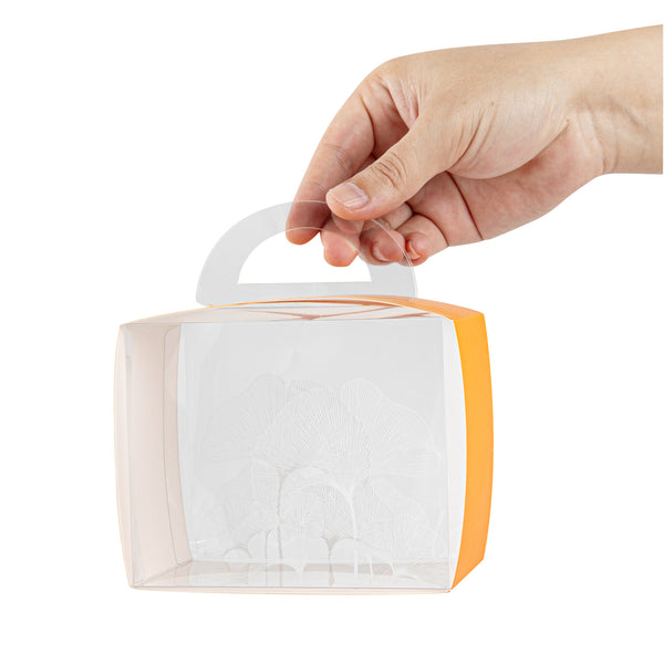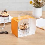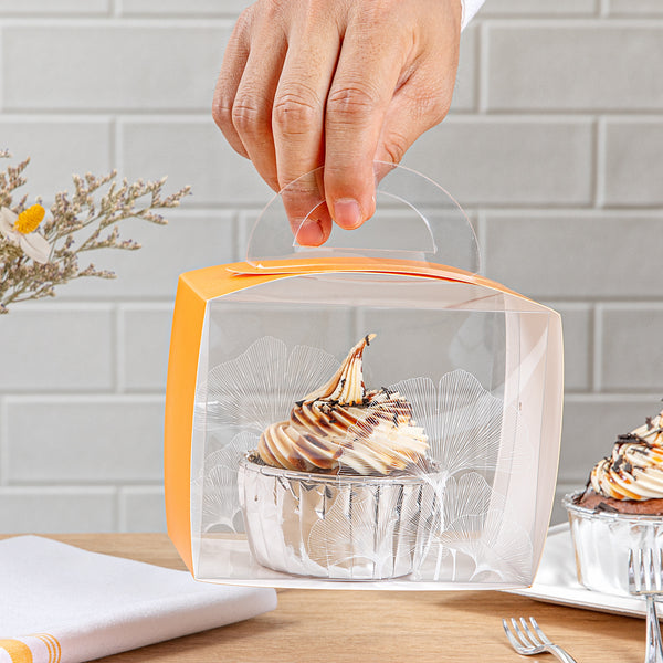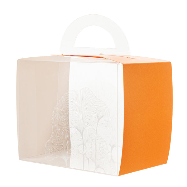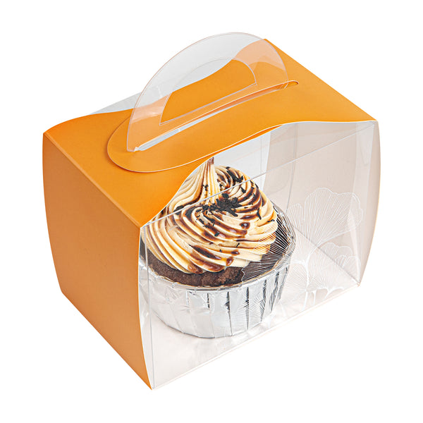 PLASTIC CUPCAKE BOX - WITH HANDLE, ORANGE PAPER WRAP, LEAF ACCENT