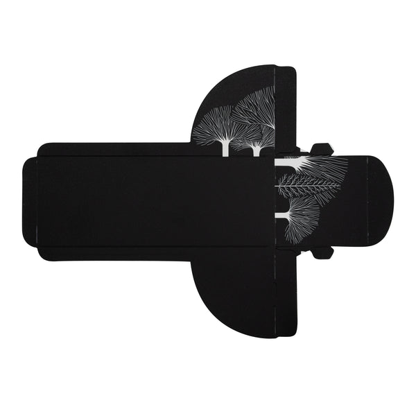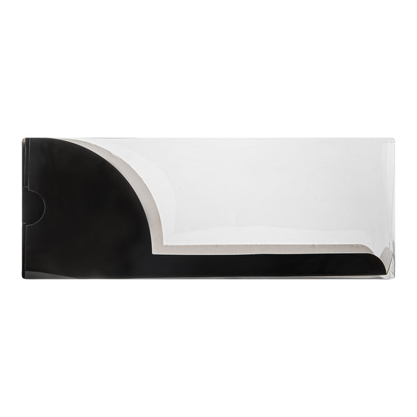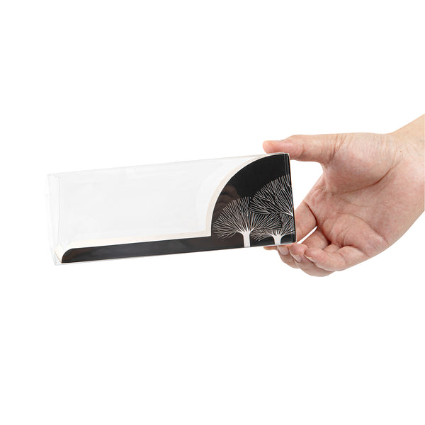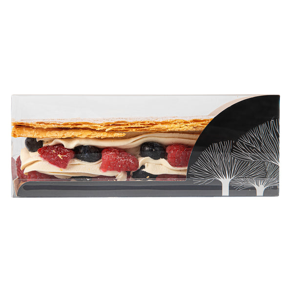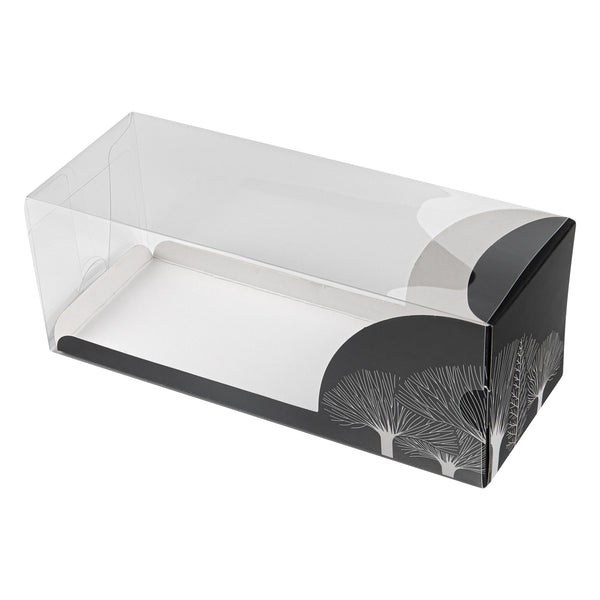 RECTANGLE CLEAR PLASTIC ECLAIR BOX - BLACK PAPER SLEEVE, TREE ACCENT