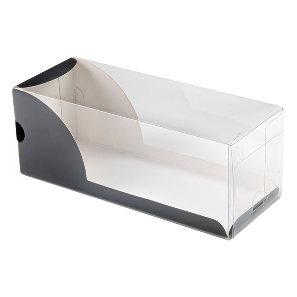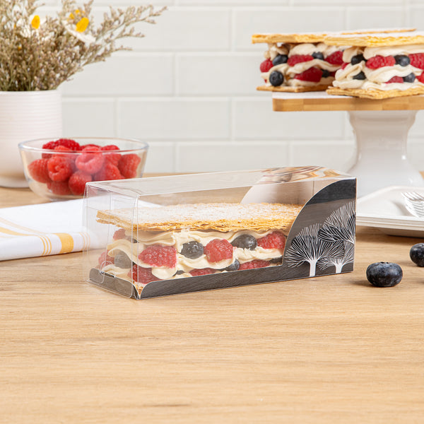 Pack up lemon loaf cakes and other treats using our Sweet Vision Black Rectangle Clear Plastic Eclair Boxes. Featuring a sleek black bottom and a chic tree accent, these small cake boxes instantly add a stylish touch to pastries and capture the attention of guests. These clear dessert boxes have greaseproof paper liners that ensure desserts stay fresh and don't stick to the base. With easy-to-open flaps, these small pastry boxes are perfect for streamlining the packaging process at your bakery, restaurant, or cafe. These bakery boxes have a see-through top that seamlessly showcases the vibrant colors of baked goods. Constructed from PET plastic, these small cake boxes are naturally crack-resistant for a mess-free way to transport desserts. These disposable dessert boxes are shipped flat and unassembled for space-efficient storage in your storage room or prep area. Measuring 7 inches in length by 2.5 inches in width, these clear dessert boxes are excellent for packaging mini cakes or pastries. Sold in a 100 count box.