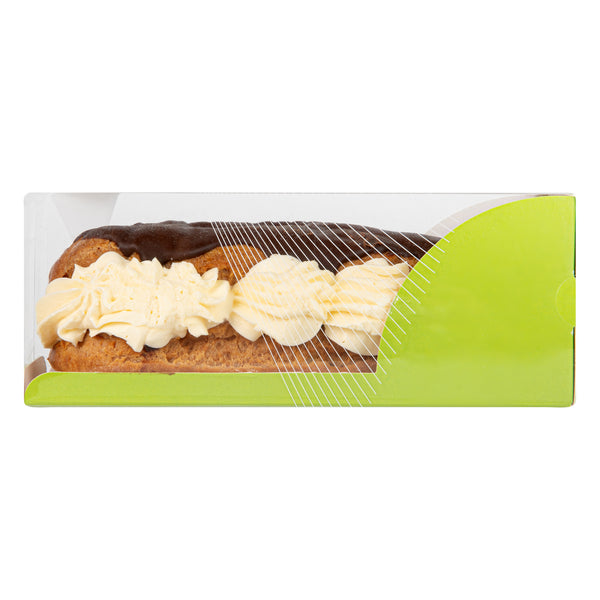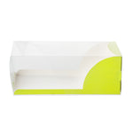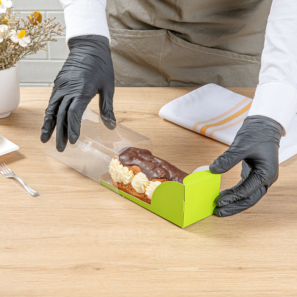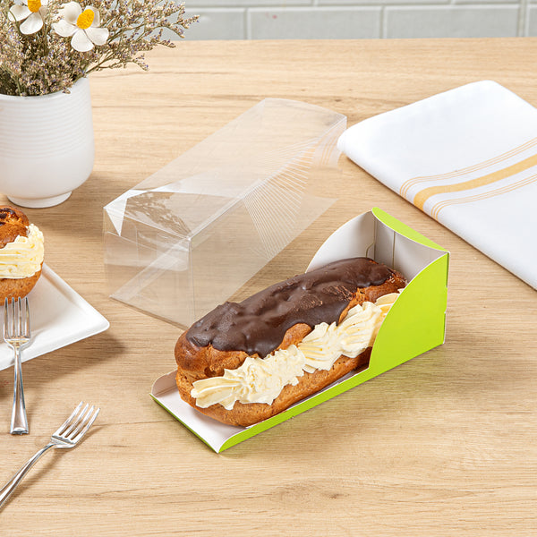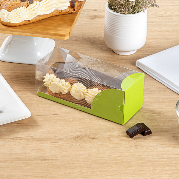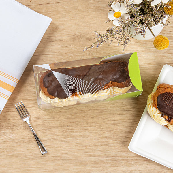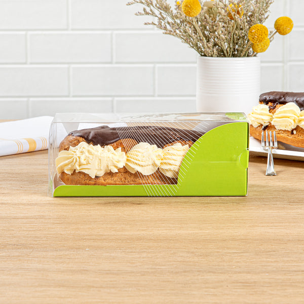 Take delectable mini cakes and pastries to go using our Sweet Vision Green Rectangle Clear Plastic Eclair Boxes. These plastic pastry boxes feature a see-through top and a vivid green bottom with geometric lines on the box for added flair to your dessert packaging. Made from premium PET plastic, these small disposable bakery boxes are built to be crack-resistant and preserve their charming appearance during transport. Ideal for fast-paced bakeries or catering events, these mini cake boxes have easy-to-open flaps for quick and easy packaging. These disposable bakery boxes have a greaseproof paper liner on the base, making them perfect for containing all kinds of sweets. Measuring 7 inches long by 2.5 inches wide, these small bakery boxes are shipped flat and unassembled for space-efficient storage. Sold in a 100 count box.