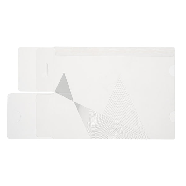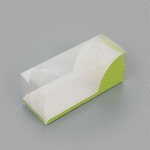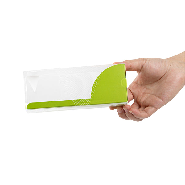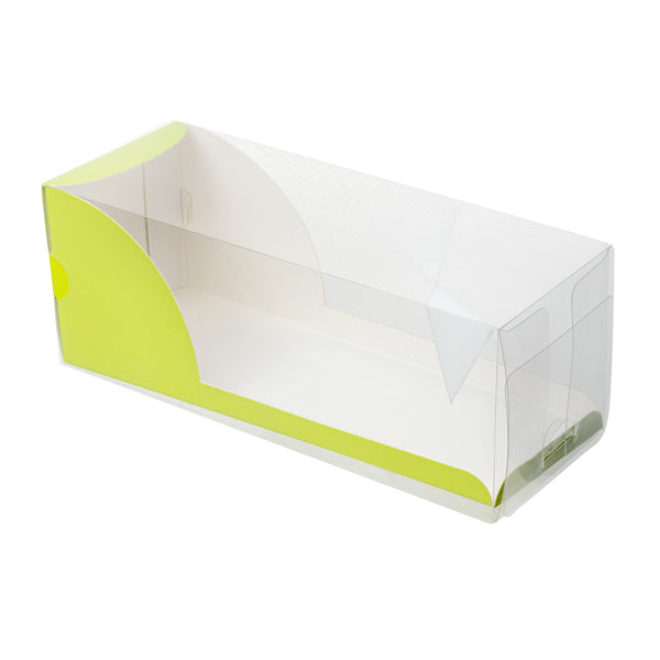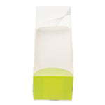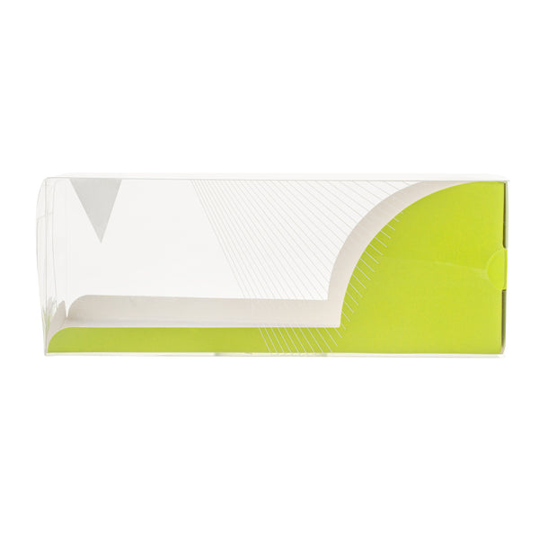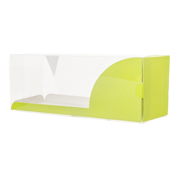 CLEAR PLASTIC ECLAIR BOX - GREEN PAPER SLEEVE, GEOMETRIC LINE ACCENT